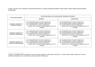 LICZBA I ŁĄCZNY CZAS TRWANIA ĆWICZEŃ WOJSKOWYCH, KTÓRE ŻOŁNIERZE REZERWY MOGĄ ODBYĆ PRZEZ OKRES POZOSTAWANIA W REZERWIE WYSZCZEGÓLNIENIE 1 WYKSZTAŁCENIE LUB WYSZKOLENIE ŻOŁNIERZA REZERWY ZGODNE1 NIEZGODNE ZÓŁNIERZ REZERWY W STOPNIU OFICERA – do 15 jednodniowych ćwiczeń wojskowych – do 19 krótkotrwałych ćwiczeń wojskowych – do 2 długotrwałych ćwiczeń wojskowych Łączny czas trwania ćwiczeń wojskowych do 20 miesięcy – do 18 jednodniowych ćwiczeń wojskowych – do 20 krótkotrwałych ćwiczeń wojskowych – do 3 długotrwałych ćwiczeń wojskowych Łączny czas trwania ćwiczeń wojskowych do 21 miesięcy ZÓŁNIERZ REZERWY W STOPNIU PODOFICERA – do 15 jednodniowych ćwiczeń wojskowych – do 17 krótkotrwałych ćwiczeń wojskowych – do 2 długotrwałych ćwiczeń wojskowych Łączny czas trwania ćwiczeń wojskowych do 17 miesięcy – do 18 jednodniowych ćwiczeń wojskowych – do 18 krótkotrwałych ćwiczeń wojskowych – do 3 długotrwałych ćwiczeń wojskowych Łączny czas trwania ćwiczeń wojskowych do 18 miesięcy ZÓŁNIERZ REZERWY W STOPNIU SZEREGOWEGO – do 15 jednodniowych ćwiczeń wojskowych – do 12 krótkotrwałych ćwiczeń wojskowych – do 2 długotrwałych ćwiczeń wojskowych Łączny czas trwania ćwiczeń wojskowych do 12 miesięcy – do 18 jednodniowych ćwiczeń wojskowych – do 15 krótkotrwałych ćwiczeń wojskowych – do 3 długotrwałych ćwiczeń wojskowych Łączny czas trwania ćwiczeń wojskowych do 15 miesięcy Zgodne z umiejętnościami wymaganymi do wykonywania zadań na stanowisku służbowym, na które został nadany żołnierzowi rezerwy przydział mobilizacyjny lub zamierza się nadać przydział mobilizacyjny.