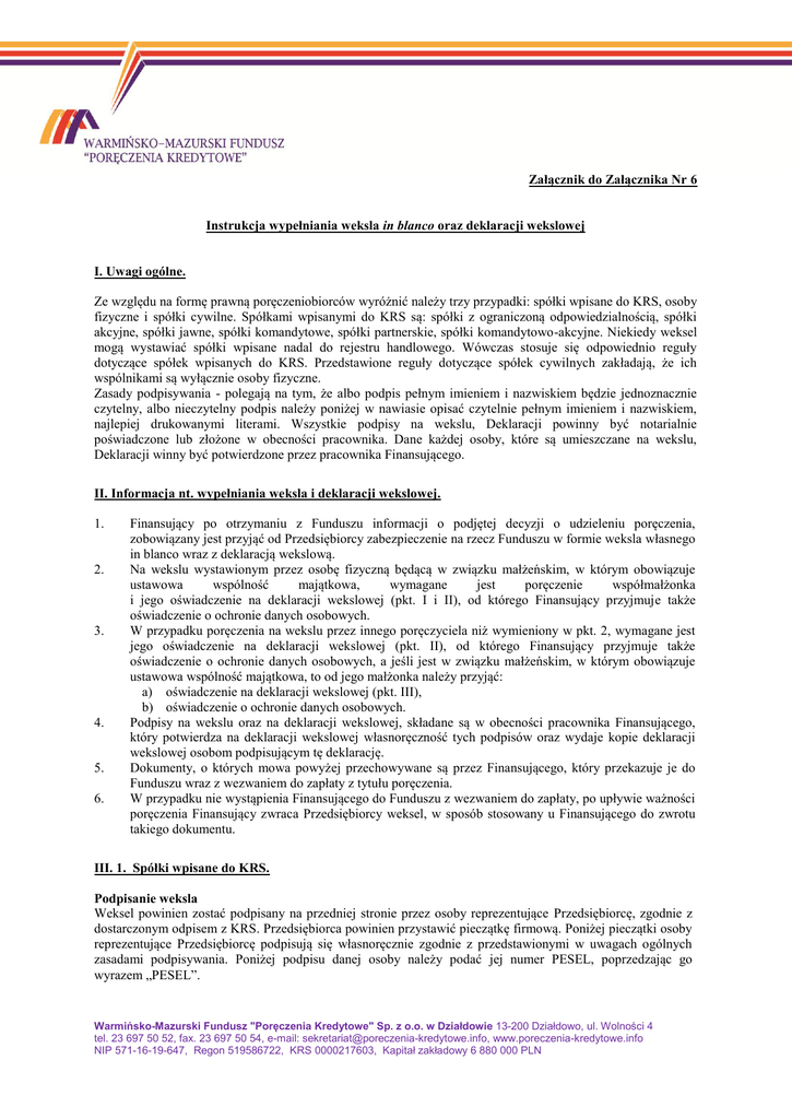 Załącznik do Załącznika Nr 6 Instrukcja wypełniania weksla in blanco oraz deklaracji wekslowej I. Uwagi ogólne. Ze względu na formę prawną poręczeniobiorców wyróżnić należy trzy przypadki: spółki wpisane do KRS, osoby fizyczne i spółki cywilne. Spółkami wpisanymi do KRS są: spółki z ograniczoną odpowiedzialnością, spółki akcyjne, spółki jawne, spółki komandytowe, spółki partnerskie, spółki komandytowo-akcyjne. Niekiedy weksel mogą wystawiać spółki wpisane nadal do rejestru handlowego. Wówczas stosuje się odpowiednio reguły dotyczące spółek wpisanych do KRS. Przedstawione reguły dotyczące spółek cywilnych zakładają, że ich wspólnikami są wyłącznie osoby fizyczne. Zasady podpisywania - polegają na tym, że albo podpis pełnym imieniem i nazwiskiem będzie jednoznacznie czytelny, albo nieczytelny podpis należy poniżej w nawiasie opisać czytelnie pełnym imieniem i nazwiskiem, najlepiej drukowanymi literami. Wszystkie podpisy na wekslu, Deklaracji powinny być notarialnie poświadczone lub złożone w obecności pracownika. Dane każdej osoby, które są umieszczane na wekslu, Deklaracji winny być potwierdzone przez pracownika Finansującego. II. Informacja nt. wypełniania weksla i deklaracji wekslowej. 1. 2. 3. 4. 5. 6. Finansujący po otrzymaniu z Funduszu informacji o podjętej decyzji o udzieleniu poręczenia, zobowiązany jest przyjąć od Przedsiębiorcy zabezpieczenie na rzecz Funduszu w formie weksla własnego in blanco wraz z deklaracją wekslową. Na wekslu wystawionym przez osobę fizyczną będącą w związku małżeńskim, w którym obowiązuje ustawowa wspólność majątkowa, wymagane jest poręczenie współmałżonka i jego oświadczenie na deklaracji wekslowej (pkt. I i II), od którego Finansujący przyjmuje także oświadczenie o ochronie danych osobowych. W przypadku poręczenia na wekslu przez innego poręczyciela niż wymieniony w pkt. 2, wymagane jest jego oświadczenie na deklaracji wekslowej (pkt. II), od którego Finansujący przyjmuje także oświadczenie o ochronie danych osobowych, a jeśli jest w związku małżeńskim, w którym obowiązuje ustawowa wspólność majątkowa, to od jego małżonka należy przyjąć: a) oświadczenie na deklaracji wekslowej (pkt. III), b) oświadczenie o ochronie danych osobowych. Podpisy na wekslu oraz na deklaracji wekslowej, składane są w obecności pracownika Finansującego, który potwierdza na deklaracji wekslowej własnoręczność tych podpisów oraz wydaje kopie deklaracji wekslowej osobom podpisującym tę deklarację. Dokumenty, o których mowa powyżej przechowywane są przez Finansującego, który przekazuje je do Funduszu wraz z wezwaniem do zapłaty z tytułu poręczenia. W przypadku nie wystąpienia Finansującego do Funduszu z wezwaniem do zapłaty, po upływie ważności poręczenia Finansujący zwraca Przedsiębiorcy weksel, w sposób stosowany u Finansującego do zwrotu takiego dokumentu. III. 1. Spółki wpisane do KRS. Podpisanie weksla Weksel powinien zostać podpisany na przedniej stronie przez osoby reprezentujące Przedsiębiorcę, zgodnie z dostarczonym odpisem z KRS. Przedsiębiorca powinien przystawić pieczątkę firmową. Poniżej pieczątki osoby reprezentujące Przedsiębiorcę podpisują się własnoręcznie zgodnie z przedstawionymi w uwagach ogólnych zasadami podpisywania. Poniżej podpisu danej osoby należy podać jej numer PESEL, poprzedzając go wyrazem „PESEL”. Warmińsko-Mazurski Fundusz "Poręczenia Kredytowe" Sp. z o.o. w Działdowie 13-200 Działdowo, ul. Wolności 4 tel. 23 697 50 52, fax. 23 697 50 54, e-mail: [email protected], www.poreczenia-kredytowe.info NIP 571-16-19-647, Regon 519586722, KRS 0000217603, Kapitał zakładowy 6 880 000 PLN Wypełnianie Deklaracji wekslowej Dane Przedsiębiorcy zawierają: nazwę, adres siedziby i numer KRS Przedsiębiorcy. Nr KRS powinien być zgodny z przedstawionym wraz z wnioskiem odpisem z KRS, nie starszym niż 3 miesiące. W części „tożsamość osób upoważnionych do zaciągania zobowiązań…” podaje się dane osób reprezentujących przedsiębiorcę, które podpisały weksel i które są do tego upoważnione zgodnie z przedstawionym wypisem z KRS. Dane te zawierają: imiona i nazwiska, nr dowodu osobistego i numery PESEL tych osób. Deklaracja powinna zostać podpisana przez te same osoby, które podpisały weksel, zgodnie z przedstawionymi w uwagach ogólnych zasadami podpisywania. W przypadku, gdy osoby wystawiające weksel znajdują się w związku małżeńskim postępujemy zgodnie z zapisami pkt. II. Udzielanie poręczeń wekslowych Od małżonków osób, które podpisały weksel Fundusz wymaga udzielenia poręczenia wekslowego. W odosobnionych przypadkach Fundusz może żądać poręczenia wekslowego od osób trzecich. Każda osoba udzielająca poręczenia wekslowego w dolnej części weksla własnoręcznie wpisuje wyraz „Poręczam” i składa pod nim swój podpis zgodnie z przedstawionymi w uwagach ogólnych zasadami podpisywania. Poniżej podpisu danej osoby należy podać jej numer PESEL, poprzedzając go wyrazem „PESEL”. III. 2. Osoby fizyczne. Podpisanie weksla Weksel powinien zostać podpisany na przedniej stronie przez osobę fizyczną prowadzącą działalność gospodarczą zgodnie z przedstawionymi w uwagach ogólnych zasadami podpisywania. Poniżej podpisu należy podać numer PESEL osoby fizycznej, poprzedzając go wyrazem „PESEL”, natomiast nie podaje się żadnych nazw, pod którymi osoba fizyczna prowadzi działalność gospodarczą. Wypełnianie Deklaracji wekslowej Dane zawierają: imię i nazwisko, adres zamieszkania Przedsiębiorcy. W przypadku, gdy osoby wystawiające weksel znajdują się w związku małżeńskim postępujemy zgodnie z zapisami pkt. II. Deklaracja powinna zostać podpisana przez przedsiębiorcę zgodnie z przedstawionymi w uwagach ogólnych zasadami podpisywania. Udzielanie poręczeń wekslowych Od małżo
