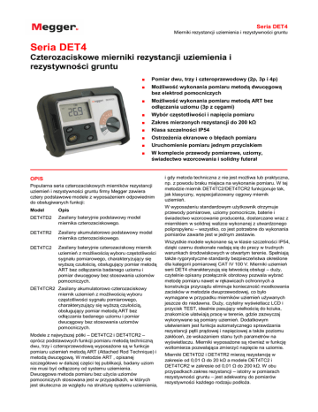 Seria DET4 Mierniki rezystancji uziemienia i rezystywności gruntu Seria DET4 Czterozaciskowe mierniki rezystancji uziemienia i rezystywności gruntu ■ Pomiar dwu, trzy i czteroprzewodowy (2p, 3p i 4p) ■ Możliwość wykonania pomiaru metodą dwucęgową bez elektrod pomocniczych ■ Możliwość wykonania pomiaru metodą ART bez odłączania uziomu (3p z cęgami) ■ Wybór częstotliwości i napięcia pomiaru ■ Zakres mierzonych rezystancji do 200 kΩ ■ Klasa szczelności IP54 ■ Ostrzeżenia ekranowe o błędach pomiaru ■ Uruchomienie pomiaru jednym przyciskiem ■ W komplecie przewody pomiarowe, uziomy, świadectwo wzorcowania i solidny futerał OPIS Popularna seria czterozaciskowych mierników rezystancji uziemień i rezystywności gruntu firmy Megger zawiera cztery podstawowe modele z wyposażeniem odpowiednim do obsługiwanych funkcji: Model Opis DET4TD2 Zasilany bateryjnie podstawowy model miernika czterozaciskowego. DET4TR2 Zasilany akumulatorowo podstawowy model miernika czterozaciskowego. DET4TC2 Zasilany bateryjnie czterozaciskowy miernik uziemień z możliwością wyboru częstotliwości sygnału pomiarowego, charakteryzujący się wyższą czułością, obsługujący pomiar metodą ART bez odłączania badanego uziomu i pomiar dwucęgowy bez stosowania uziomów pomocniczych. DET4TCR2 Zasilany akumulatorowo czterozaciskowy miernik uziemień z możliwością wyboru częstotliwości sygnału pomiarowego, charakteryzujący się wyższą czułością, obsługujący pomiar metodą ART bez odłączania badanego uziomu i pomiar dwucęgowy bez stosowania uziomów pomocniczych. Modele z najwyższej półki – DET4TC2 i DET4TCR2 – oprócz podstawowych funkcji pomiaru metodą techniczną dwu, trzy i czteroprzewodową wyposażone są w funkcje pomiaru uziemień metodą ART (Attached Rod Technique) i metodą dwucęgową. W metodzie ART , opisanej szczegółowo w dalszej części tej publikacji, badany uziom nie musi być odłączony od systemu uziemienia. Dwucęgowa metoda pomiaru bez użycia uziomów pomocniczych stosowana jest w przypadkach, w których jest skuteczna ze względu na strukturę systemu uziemienia, i gdy metoda techniczna z nie jest możliwa lub praktyczna, np. z powodu braku miejsca na wykonanie pomiaru. W tej metodzie miernik DET4TC2/DET4TCR2 funkcjonuje tak, jak klasyczny, wyspecjalizowany cęgowy miernik uziemień. W wyposażeniu standardowym użytkownik otrzymuje przewody pomiarowe, uziomy pomocnicze, baterie i świadectwo wzorcowanie producenta, dostarczane wraz z miernikiem w solidnej walizce wykonanej z utwardzonego polipropylenu – wszystko, co jest potrzebne do wykonania pomiarów zawarte jest w jednym zestawie. Wszystkie modele wykonane są w klasie szczelności IP54, dzięki czemu doskonale nadają się do pracy w trudnych warunkach środowiskowych w otwartym terenie. Spełniają także rygorystyczne standardy bezpieczeństwa określone dla kategorii pomiarowej CAT IV 100 V. Mierniki uziemień serii DET4 charakteryzują się łatwością obsługi – duży, czytelnie opisany przełącznik obrotowy pozwala wybrać metodę pomiaru nawet w rękawicach ochronnych a konstrukcja przyrządu eliminuje konieczność mostkowania zacisków w metodzie dwuprzewodowej, co było wymagane w przypadku mierników uziemień używanych jeszcze do niedawna. Duży, czytelny wyświetlacz LCD i przycisk TEST, idealnie pasujący wielkością do kciuka, znakomicie ułatwiają pracę w terenie, gdzie zazwyczaj wykonywane są pomiary uziemień. Dodatkowym ułatwieniem jest funkcja automatycznego sprawdzania rezystancji pętli prądowej i napięciowej a także poziomu zakłóceń, ze wskazaniem stanu tych parametrów na wyświetlaczu. Mierniki wyposażone są również w funkcję woltomierza pozwalająca zmierzyć napięcie na uziomie. Mierniki DET4TD2 i DET4TR2 mierzą rezystancję w zakresie od 0,01 Ω do 20 kΩ a modele DET4TC2 i DET4TCR2 w zakresie od 0,01 Ω do 200 kΩ. W obu przypadkach zakres rezystancji – istotny w pomiarach rezystywności gruntu – jest adekwatny do pomiarów rezystywności każdego rodzaju podłoża. Seria DET4 Odporność na zakłócenia o wartości międzyszczytowej do 40 V pozwala wykonywać pomiary z dużą dokładnością w środowisku zaszumionym. Mierniki DET4TD2 i DET4TC2 zasilane są ośmioma bateriami alkalicznymi wielkości AA, powszechnie dostępnymi i zapewniającymi długi czas pracy. Stan baterii sygnalizowany jest kilkusegmentowym wskaźnikiem na wyświetlaczu miernika, pozwalając użytkownikowi podjąć decyzję, kiedy należy wymienić baterie. Mierniki DET4TR2 i DET4TCR2 zasilane są ogniwami akumulatorowymi wielkości AA. Modele te wyposażone są w wewnętrzny układ ładowania i zewnętrzny adapter AC/DC. Poziom naładowania akumulatorków sygnalizowany jest wskaźnikiem na wyświetlaczu. Doposażenie mierników DET4TC2 i DET4TCR2 w cęgi pomiarowe pozwala – w dodatku do tradycyjnych metod technicznych – prowadzić pomiary uziemień metodami niewymagającymi odłączania badanych uziomów od systemu uziemienia. Korzystając z cęgów odbiorczych ICLAMP można wykonać pomiar techniką ART (Attached Rod Technique), w której badany uziom pozostaje przyłączony do reszty systemu uziemienia. Czułość cęgów ICLAMP pozwala mierzyć prądy upływowe o bardzo niskich wartościach – do 0,5 mA. Zastosowanie cęgów nadawczych VCLAMP we współpracy z cęgami odbiorczymi ICLAMP umożliwia przeprowadzenie pomiarów metodą dwucęgową w sytuacjach, w których użycie elektrod pomocniczych jest niepraktyczne. W modelach DET4TC2 i DET4TCR2 dodatkowo zastosowano podświetlenie ekranu, co ułatwia prowadzenie pomiarów w piwnicach i innych ciemnych pomieszczeniach. Wszystkie modele serii DET4 posiadają dwa, swobodnie wybierane, napięcia pomiarowe 25 V i 50 V, spełniając tym samym wymagania normy IEC 61557–5. Napięcie 25 V jest wymagane dla pomiarów wykonywanych w środowisku rolniczym. elektroniczny przed wyładowania