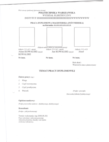 Wzór strony tytulowej (pierwsza strona) . POLITECHNIKA WARSZA WSKA WYDZIAL ELEKTRYCZNY INSTYTUT SSSSSSSSSSSEEEEEEEEEEEEEEWWWWWWWW PRACA DYPLOMOWA MAGISTERSKA (INZYNIERSKA) na kierunku AAAAAAAAAAAA (Zdjecia nalezy wkleic po oprawieniu pracy) (zdjecie: 3,5 x 4,5 --- - opcja) (zdjecie: 3,5 x 4,5 Adam KOWALSKI (opcja) KOWALSKI Nr imm. - opcja) (zdjecie: Jan KOWALSKI (opcja) Nr imm. 3,5 x 4,5) Józef Nr imm. Rok akad.: Warszawa (data wydania tematu) TEMA T PRACY DYPLOMOWEJ Zakres pracy: (np.) 1. Wstep. 2. Czesc teoretyczna. 3. Czescpraktyczna. 4. Wnioski. (Podpis ipieczatka Kierownika ZakJadu Dydaktycznego) Opiekun naukowy: (Podpis pracownika naukowo -dydaktycznego. Konsultant: (Podpis - jes/ijest kanieczny) Tennin wykonania: (np.2006.06.30) Praca wykonana i zaliczona pozostaje wlasnoscia Instytutu, Katedry i nie bedzie zwrócona wykonawcy. dydaktycznego)