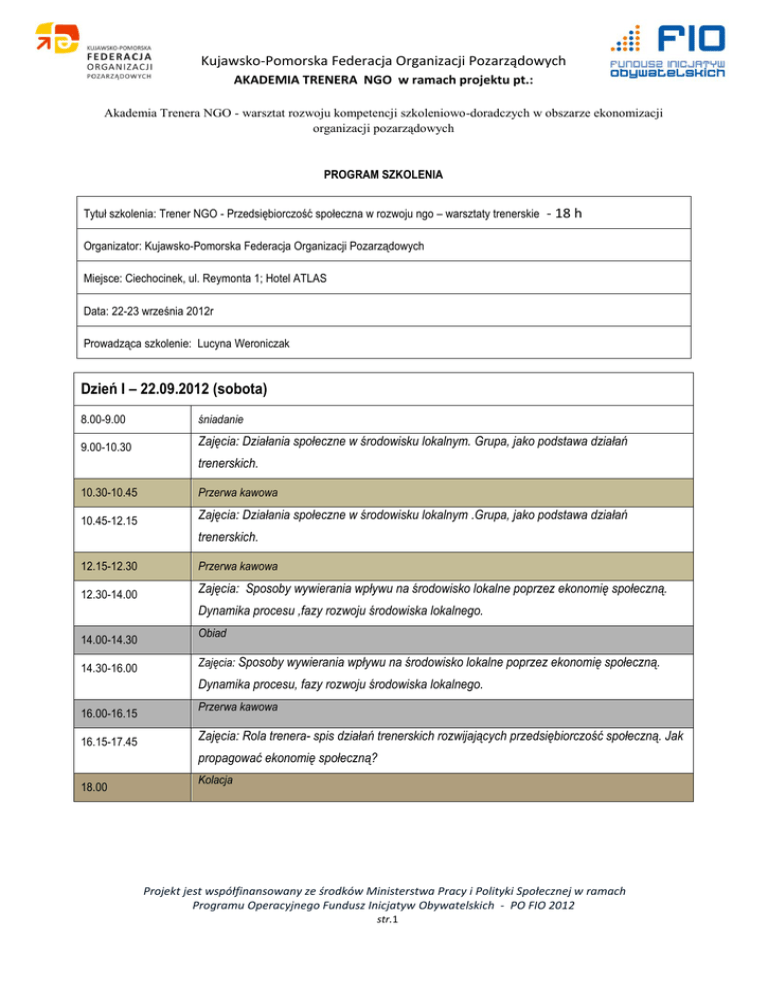 Kujawsko-Pomorska Federacja Organizacji Pozarządowych AKADEMIA TRENERA NGO w ramach projektu pt.: Akademia Trenera NGO - warsztat rozwoju kompetencji szkoleniowo-doradczych w obszarze ekonomizacji organizacji pozarządowych PROGRAM SZKOLENIA Tytuł szkolenia: Trener NGO - Przedsiębiorczość społeczna w rozwoju ngo – warsztaty trenerskie - 18 h Organizator: Kujawsko-Pomorska Federacja Organizacji Pozarządowych Miejsce: Ciechocinek, ul. Reymonta 1; Hotel ATLAS Data: 22-23 września 2012r Prowadząca szkolenie: Lucyna Weroniczak Dzień I – 22.09.2012 (sobota) 8.00-9.00 śniadanie 9.00-10.30 Zajęcia: Działania społeczne w środowisku lokalnym. Grupa, jako podstawa działań trenerskich. 10.30-10.45 Przerwa kawowa 10.45-12.15 Zajęcia: Działania społeczne w środowisku lokalnym .Grupa, jako podstawa działań trenerskich. 12.15-12.30 Przerwa kawowa 12.30-14.00 Zajęcia: Sposoby wywierania wpływu na środowisko lokalne poprzez ekonomię społeczną. Dynamika procesu ,fazy rozwoju środowiska lokalnego. 14.00-14.30 14.30-16.00 Obiad Zajęcia: Sposoby wywierania wpływu na środowisko lokalne poprzez ekonomię społeczną. Dynamika procesu, fazy rozwoju środowiska lokalnego. 16.00-16.15 16.15-17.45 Przerwa kawowa Zajęcia: Rola trenera- spis działań trenerskich rozwijających przedsiębiorczość społeczną. Jak propagować ekonomię społeczną? 18.00 Kolacja Projekt jest współfinansowany ze środków Ministerstwa Pracy i Polityki Społecznej w ramach Programu Operacyjnego Fundusz Inicjatyw Obywatelskich - PO FIO 2012 str.1 Dzień II – 23.09.2012 (niedziela) 8.00-9.00 śniadanie 9.00-10.30 Zajęcia: Badanie potrzeb szkoleniowych grup społecznych w ramach ekonomii społecznej 10.30-10.45 Przerwa kawowa 10.45-12.15 Zajęcia: Planowanie pracy szkoleniowej rozwijającej przedsiębiorczość. Metodyka uczenia dorosłych. Jak organizować proces uczenia się dorosłych, efektywność procesu szkoleniowego? 12.15-12.30 Przerwa kawowa 12.30-14.00 Zajęcia: Planowanie pracy szkoleniowej rozwijającej przedsiębiorczość. Metodyka uczenia dorosłych. Metody aktywizujące w pracy szkoleniowej i warsztatowej 14.00-14.30 14.30-16.00 Obiad Zajęcia: Budowanie programu szkoleniowego Zakończenie zajęć, ewaluacja. rozwijającego kompetencje społeczne. Kolejne spotkanie: 9-11 LISTOPADA 2012 r., WARSZTATY TRENERSKIE „Metodyka rozmowy doradczej” oraz „Warsztaty trenerskie: Aktywizujące metody i techniki edukacji dorosłych” Dodatkowe indywidualne wsparcie – coaching rozwoju trenera ngo – terminy ustalane bezpośrednio z uczestnikami/uczestniczkami w trakcie realizacji projektu. *** Organizator zastrzega sobie prawo zmiany terminów z przyczyn niezależnych. Projekt jest współfinansowany ze środków Ministerstwa Pracy i Polityki Społecznej w ramach Programu Operacyjnego Fundusz Inicjatyw Obywatelskich - PO FIO 2012 str.2