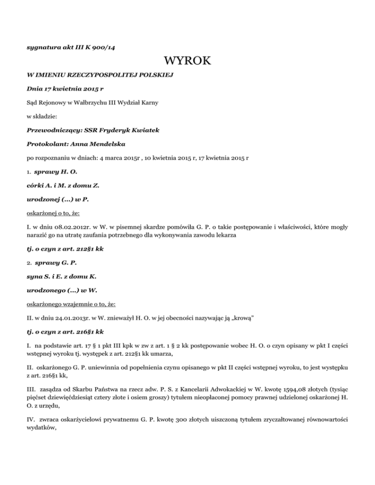 sygnatura akt III K 900/14 WYROK W IMIENIU RZECZYPOSPOLITEJ POLSKIEJ Dnia 17 kwietnia 2015 r Sąd Rejonowy w Wałbrzychu III Wydział Karny w składzie: Przewodniczący: SSR Fryderyk Kwiatek Protokolant: Anna Mendelska po rozpoznaniu w dniach: 4 marca 2015r , 10 kwietnia 2015 r, 17 kwietnia 2015 r 1. sprawy H. O. córki A. i M. z domu Z. urodzonej (...) w P. oskarżonej o to, że: I. w dniu 08.02.2012r. w W. w pisemnej skardze pomówiła G. P. o takie postępowanie i właściwości, które mogły narazić go na utratę zaufania potrzebnego dla wykonywania zawodu lekarza tj. o czyn z art. 212§1 kk 2. sprawy G. P. syna S. i E. z domu K. urodzonego (...) w W. oskarżonego wzajemnie o to, że: II. w dniu 24.01.2013r. w W. znieważył H. O. w jej obecności nazywając ją „krową” tj. o czyn z art. 216§1 kk I. na podstawie art. 17 § 1 pkt III kpk w zw z art. 1 § 2 kk postępowanie wobec H. O. o czyn opisany w pkt I części wstępnej wyroku tj. występek z art. 212§1 kk umarza, II. oskarżonego G. P. uniewinnia od popełnienia czynu opisanego w pkt II części wstępnej wyroku, to jest występku z art. 216§1 kk, III. zasądza od Skarbu Państwa na rzecz adw. P. S. z Kancelarii Adwokackiej w W. kwotę 1594,08 złotych (tysiąc pięćset dziewięćdziesiąt cztery złote i osiem groszy) tytułem nieopłaconej pomocy prawnej udzielonej oskarżonej H. O. z urzędu, IV. zwraca oskarżycielowi prywatnemu G. P. kwotę 300 złotych uiszczoną tytułem zryczałtowanej równowartości wydatków, V. zwalnia H. O. od poniesienia wydatków powstałych w związku z wniesieniem aktu oskarżenia przez oskarżyciela prywatnego G. P.. Sygn. akt III K 900/14 UZASADNIENIE Po przeprowadzeniu rozprawy głównej Sąd ustalił następujący stan faktyczny: Wniosek o sporządzenie na piśmie i doręczenie uzasadnienia wyroku z odpisem orzeczenia złożył jedynie pełnomocnik oskarżyciela prywatnego, oskarżonego wzajemnie G. P., dlatego Sąd zgodnie z art. 23 § 1a k.p.k. ograniczył zakres uzasadnienia do tych części orzeczenia, których dotyczył rzeczony wniosek. H. O.jest pacjentką leczącą się w (...)z powodu dolegliwości bólowych kręgosłupa piersiowego. W dniu 6 lutego 2012 roku rzeczone dolegliwości były na tyle dolegliwe, że oskarżona zabiegała o bezzwłoczną hospitalizację. Zgodnie ze skierowaniem udała się do Szpitala im. A. (...)w W., gdzie dyżur pełnił oskarżyciel prywatny, oskarżony z oskarżenia wzajemnego, G. P.. Oskarżyciel prywatny przeprowadził zaleconą konsultację. W tym czasie w gabinecie przebywał O. M. (1), inny lekarz, zatrudniony w tej samej placówce. Zderzenie oczekiwań oskarżonej co do dalszego sposobu leczenia z odmiennymi zapatrywaniami oskarżyciela prywatnego na kwestię hospitalizacji pacjentki wywołało emocje, które oboje manifestowali w sposób, który zaważył na dalszym przebiegu wizyty. Kiedy oskarżyciel prywatny, nie kryjący irytacji wywołanej uporem pacjentki, uznał za wystarczające leczenie ambulatoryjne i poprosił drugiego lekarza o wypisanie recepty na lek o nazwie K., wzburzona oskarżona, przekonana, że lekarz zalecił K., którego nie mogła przyjmować, w gwałtowny sposób wyraziła swoją krytykę i zarzuciła oskarżycielowi prywatnemu, że chce ją uśmiercić. Dwa dni później, mając w pamięci zachowanie lekarza, które odebrała jako wyjątkowo nieprzychylne i pełne złości, oskarżona sporządziła pismo adresowane do Narodowego Funduszu Zdrowia. W piśmie, stanowiącym skargę na zachowanie oskarżyciela prywatnego, opisała przebieg wizyty, akcentując złą wolę oskarżonego, o którym napisała, że był „arogancki”, „niegrzeczny”, „pan i władca”, wprost rozwścieczony”, „żeby mógł to by mnie zabił”, i wspomniała, że groził „że zaraz mnie załatwi i wylądują w czubkach” i dodała, że receptę wypisał inny lekarz „by mnie uśmiercić”. R. K., dyrektor Szpitala a zarazem ówczesny przełożony oskarżyciela prywatnego, otrzymał rzeczone pismo w dniu 9 lutego 2012 roku. Tego samego dnia pismo oskarżonej zostało przekazane Rzecznikowi Praw Pacjenta. Skarga złożona przez oskarżoną spotkała się z przychylnym przyjęciem dyrektora Szpitala. R. K.przeprowadził rozmowę dyscyplinującą z oskarżycielem prywatnym i O. M. (1). Mając na względzie uwagi innych pacjentów, oceniających krytycznie zachowanie obu lekarzy, przełożony uprzedził ich, że jeśli sytuacja sygnalizowana przez oskarżoną powtórzy się, zwolni ich z rezydentury. Zmiany w kręgosłupie piersiowym oskarżonej H. O. powodują dolegliwości bólowe, utrudniają poruszanie się i wymagają ciągłego leczenia, przyjmowania zastrzyków i korzystania z zabiegów fizjoterapeutycznych. Do kolejnego, niezamierzonego przez żadną ze stron kontaktu, doszło w dniu 24 stycznia 2013 roku, kiedy to z powodu wspomnianych wyżej dolegliwości oskarżona H. O. udała się na planową wizytę do gabinetu ortopedycznego, w którym, z racji pełnionego wówczas dyżuru, pozostawał oskarżony wzajemnie G. P.. G. P. oznajmił H. O., że nie udzieli jej świadczenia z powodu uwikłania w konflikt zainicjowany „skargą” i proces sądowy. Zamiast tego zaplanował wizytę pacjentki na następny dzień. Oskarżona trzasnęła drzwiami a następnie wezwała Policję, zarzucając lekarzowi, że bezprawnie odmówił jej pomocy i złożyła skargę na G. P. do administracji Pogotowia (...). Policja nie podjęła interwencji, a Rzecznik Praw Pacjenta, który przeprowadził w tej sprawie postępowanie wyjaśniające, nie dopatrzył się sygnalizowanego uchybienia. Dowód: - wyjaśnienia oskarżonej H. O. częściowo k. 174-175, 180-181 273, 274 - wyjaśnienia oskarżonego wzajemnie G. P. częściowo k. 176-177,178, 180, 273-274 - zeznania świadka O. M. (1) k. 188-189, 280 - zeznania świadka R. K. k. 177-179, 275 - pismo oskarżonej H. O. z dnia 8.02.2012 r. k. 6 - dokumentacja lekarska k. 7-10 - pismo Rzecznika 