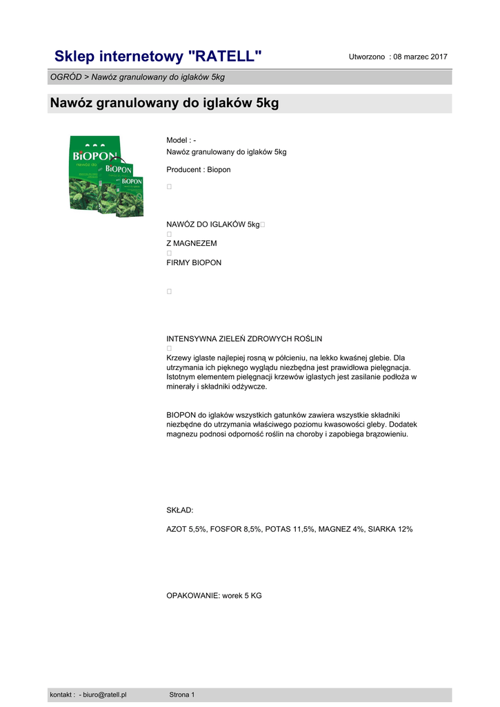 Sklep internetowy "RATELL" Utworzono : 08 marzec 2017 OGRÓD > Nawóz granulowany do iglaków 5kg Nawóz granulowany do iglaków 5kg Model : Nawóz granulowany do iglaków 5kg Producent : Biopon � NAWÓZ DO IGLAKÓW 5kg� � Z MAGNEZEM � FIRMY BIOPON � INTENSYWNA ZIELEŃ ZDROWYCH ROŚLIN � Krzewy iglaste najlepiej rosną w półcieniu, na lekko kwaśnej glebie. Dla utrzymania ich pięknego wyglądu niezbędna jest prawidłowa pielęgnacja. Istotnym elementem pielęgnacji krzewów iglastych jest zasilanie podłoża w minerały i składniki odżywcze. BIOPON do iglaków wszystkich gatunków zawiera wszystkie składniki niezbędne do utrzymania właściwego poziomu kwasowości gleby. Dodatek magnezu podnosi odporność roślin na choroby i zapobiega brązowieniu. SKŁAD: AZOT 5,5%, FOSFOR 8,5%, POTAS 11,5%, MAGNEZ 4%, SIARKA 12% OPAKOWANIE: worek 5 KG kontakt : - [email protected] Strona 1 Sklep internetowy "RATELL" OGRÓD > Nawóz granulowany do iglaków 5kg Nawóz granulowany do iglaków 5kg Opakowanie wystarcza na 125 m2�lub 150 roślin! Cena : 22,99 zł Brutto ( 21,29 zł Netto) Dostępność: Produkt dostępny w naszym sklepie od 15 maj 2014 kontakt : - [email protected] Strona 2 Utworzono : 08 marzec 2017