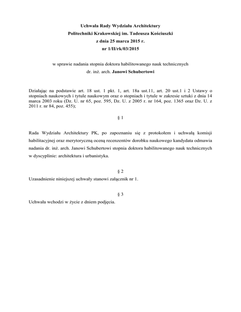 Uchwała Rady Wydziału Architektury Politechniki Krakowskiej im. Tadeusza Kościuszki z dnia 25 marca 2015 r. nr 1/II/rk/03/2015 w sprawie nadania stopnia doktora habilitowanego nauk technicznych dr. inż. arch. Janowi Schubertowi Działając na podstawie art. 18 ust. 1 pkt. 1, art. 18a ust.11, art. 20 ust.1 i 2 Ustawy o stopniach naukowych i tytule naukowym oraz o stopniach i tytule w zakresie sztuki z dnia 14 marca 2003 roku (Dz. U. nr 65, poz. 595, Dz. U. z 2005 r. nr 164, poz. 1365 oraz Dz. U. z 2011 r. nr 84, poz. 455); §1 Rada Wydziału Architektury PK, po zapoznaniu się z protokołem i uchwałą komisji habilitacyjnej oraz merytoryczną oceną recenzentów dorobku naukowego kandydata odmawia nadania dr. inż. arch. Janowi Schubertowi stopnia doktora habilitowanego nauk technicznych w dyscyplinie: architektura i urbanistyka. §2 Uzasadnienie niniejszej uchwały stanowi załącznik nr 1. §3 Uchwała wchodzi w życie z dniem podjęcia. Załącznik nr 1 do Uchwały RWA nr 1/II/rk/03/2015 z dnia 25 marca 2015 r. UZASADNIENIE Do Uchwały Rady Wydziału Architektury Politechniki Krakowskiej im. Tadeusza Kościuszki w sprawie nadania dr. inż. arch. Janowi Schubertowi stopnia naukowego doktora habilitowanego nauk technicznych w dyscyplinie naukowej: architektura i urbanistyka Rada Wydziału Architektury PK stwierdza, co następuje: 1. Dwóch recenzentów powołanych w postępowaniu habilitacyjnym dra inż. arch. Jana Schuberta uznało w swoich opiniach, że przedstawione osiągnięcia spełniają, wymagania zawarte w art. 16 ustawy z dnia 14 marca 2013r. o stopniach naukowych i tytule naukowym oraz o stopniach i tytule w zakresie sztuki (Dz. U. nr 65, poz. 595, Dz. U. z 2005 r. nr 164, poz. 1365 oraz Dz. U. z 2011 r. nr 84, poz. 455), stawianych kandydatom do stopnia naukowego doktora habilitowanego oraz kryteria oceny osiągnięć określonych w Rozporządzeniu Ministra Nauki i Szkolnictwa Wyższego z dnia 1 września 2011 r. w sprawie kryteriów oceny osiągnięć osoby ubiegającej się o nadanie stopnia doktora habilitowanego (Dz. U. nr 196 z 2011., poz. 1165). Jeden recenzent przedłożył opinię negatywną. 2. Komisja Habilitacyjna powołana przez Centralną Komisję ds. Stopni i Tytułów decyzją z dnia 06 czerwca 2014 r., z późniejszą zmianą składu decyzją z dnia 05 grudnia 2014 r. na posiedzeniu w dniu 24 lutego 2015 r., po zapoznaniu się z przedłożoną przez Kandydata dokumentacją Jego dorobku zawodowego, dydaktycznego i organizacyjnego oraz recenzjami dorobku naukowego (na podstawie monografii) podjęła większością głosów uchwałę o odmowie nadania dr. inż. arch. Janowi Schubertowi stopnia doktora habilitowanego w dziedzinie nauk technicznych w dyscyplinie architektura i urbanistyka. 3. Rada Wydziału Architektury Politechniki Krakowskiej im. Tadeusza Kościuszki na posiedzeniu w dniu 25 marca 2015 r., uznała, że osiągnięcia dra inż. arch. Jana Schuberta nie stanowią znacznego wkładu w rozwój dyscypliny naukowej architektura i urbanistyka i większością głosów podjęła uchwałę o odmowie nadania dr. inż. arch. Janowi Schubertowi stopnia doktora habilitowanego w dziedzinie nauk technicznych w dyscyplinie: architektura i urbanistyka.