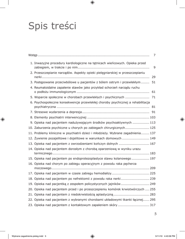 Spis treści Wstęp........................................................................................................... 7 1.Inwazyjne procedury kardiologiczne na tętnicach wieńcowych. Opieka przed zabiegiem, w trakcie i po nim..................................................................... 9 2.Przeszczepianie narządów. Aspekty opieki pielęgniarskiej w przeszczepianiu nerki....................................................................................................... 29 3.Postępowanie przeciwbólowe u pacjentów z bólem ostrym i przewlekłym......... 51 4.Reumatoidalne zapalenie stawów jako przykład schorzeń narządu ruchu o podłożu immunologicznym...................................................................... 61 5.Wsparcie społeczne w chorobach przewlekłych i psychicznych........................ 71 6.Psychospołeczne konsekwencje przewlekłej choroby psychicznej a rehabilitacja psychiatryczna......................................................................................... 81 7.Stresowe wydarzenia a depresja................................................................. 91 8.Elementy psychiatrii interwencyjnej............................................................103 9.Opieka nad pacjentem nadużywającym środków psychoaktywnych.................113 10.Zaburzenia psychiczne u chorych po zabiegach chirurgicznych........................125 11.Problemy kliniczne w psychiatrii dzieci i młodzieży. Wybrane zagadnienia.........137 12.Żywienie pozajelitowe i dojelitowe w warunkach domowych...........................149 13.Opieka nad pacjentem z owrzodzeniami kończyn dolnych..............................167 14.Opieka nad pacjentem dorosłym z chorobą oparzeniową w wyniku urazu termicznego.............................................................................................183 15.Opieka nad pacjentem po endoprotezoplastyce stawu kolanowego..................197 16.Opieka nad chorym po zabiegu operacyjnym z powodu raka pęcherza moczowego..............................................................................................209 17.Opieka nad pacjentem w czasie zabiegu hemodializy.....................................225 18.Opieka nad pacjentem po nefrektomii z powodu raka nerki............................239 19.Opieka nad pacjentką z zespołem policystycznych jajników............................249 20.Opieka nad pacjentem przed i po przeszczepieniu komórek krwiotwórczych.....255 21.Opieka nad pacjentem z niedokrwistością aplastyczną...................................283 22.Opieka nad pacjentem z wybranymi chorobami układowymi tkanki łącznej......295 23.Opieka nad pacjentem z kontaktowym zapaleniem skóry...............................317 5 Wybrane zagadnienia pieleg.indd 5 5/11/10 4:43:58 PM spis treści 24.Opieka nad pacjentem uczulonym na jad owadów.........................................327 25.Opieka nad chorym w wybranych przypadkach zaburzeń funkcjonowania wzroku....................................................................................................339 26.Opieka nad pacjentem ze stwardnieniem zanikowym bocznym.......................353 27.Opieka nad pacjentem z chorobą Parkinsona................................................365 28.Opieka nad noworodkiem z wrodzoną wadą przewodu pokarmowego. Atrezja przełyku..................................................................................................375 29. Opieka nad dzieckiem po zabiegu operacyjnym z powodu wady układu moczowego. Spodziectwo..........................................................................389 30.Opieka nad dzieckiem z wadą twarzoczaszki. Rozszczep wargi i/lub podniebienia............................................................................................403 31.Opieka nad dzieckiem z chorobą nerwowo-mięśniową na przykładzie dziecka z dystrofią mięśniową Duchenne’a (DMD)....................................................415 Skorowidz.....................................................................................................429 Wybrane zagadnienia pieleg.indd 6 5/11/10 4:43:58 PM