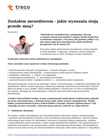 Zostałem menedżerem - jakie wyzwania stoją przede mną? 03.06.2011 Doświadczeni menedżerowie, podejmujący decyzję o awansie swoich pracowników i mający bardzo konkretne oczekiwania związane z ich nową rolą powinni zadbać o to, aby świeżo upieczeni menedżerowie mieli możliwość przygotować się do nowej roli. Wyzwania stojące przed nowymi menedżerami można podzielić na dwie kategorie - tradycyjne, związane z nowym miejscem w strukturze oraz te, które wynikają ze zmian rynkowych. Tradycyjne wyzwania można podsumować następująco Nowy menedżer musi opanować sztukę równowagi pomiędzy: ● ● ● ● ● dotychczasowymi relacjami i przyjaźniami - a nowymi relacjami w pracy, wykonywaniem zadań samodzielnie - a wykonywaniem zadań poprzez działania innych, działaniem i zadaniami - a - celami i ich osiąganiem, oczekiwaniami przełożonych - a - potrzebami pracowników, reprezentowaniem siebie i współpracowników - a - reprezentowaniem organizacji. Wyzwania tradycyjne od lat się nie zmieniają i można o nich przeczytać w większości poradników dla menedżerów. Można czerpać inspirację z obserwacji własnego szefa lub tych przełożonych, których miało się okazję w życiu spotkać. Warto jednak pamiętać o również tym, że wraz ze zmieniającymi się czasami, zmieniają się uwarunkowania, w których nowy kierownik rozpoczyna karierę menedżerską. Z badań AchieveGlobal wynika, iż poza wymienionymi tradycyjnymi trudnościami, pojawiły się nowe uwarunkowania, z którymi muszą sobie radzić wszyscy menedżerowie. Wyniki badań, przeprowadzonych przez AchieveGlobal w Europie, Stanach Zjednoczonych i Azji wskazują na nowe wyzwania, z którymi muszą mierzyć szefowie na całym świecie: 1. Dodatkowe obowiązki W związku z szybko zmieniającymi się uwarunkowaniami rynkowymi, fuzjami, reorganizacjami i zmianami wprowadzanymi w firmach, wielu menedżerów otrzymuje dodatkowe, czasowe zadania, wykraczające poza zakres ich obowiązków. Kierownicy otrzymują zadania szkoleniowe, związane z wprowadzaniem nowych procedur, a także zostają menedżerami projektów. Dla organizacji jest to możliwość oszczędności oraz wykorzystania wiedzy i doświadczenia kierowników. Dla menedżerów oznacza to być może rozwój, ale również dodatkowe obowiązki, które należy zmieścić w i tak pełnym Pobrano z: http://www.treco.pl/wiedza/artykuly-szczegoly/id/441/page/96/zostalem-menedzerem-jakie-wyzwania-stoja-przede-mna-/ kalendarzu. 2. Nowe procesy Obecnie menedżerowie muszą poświęcać więcej czasu na wdrażanie nowych systemów czy nowych procedur, które pojawiają się w odpowiedzi na oczekiwania klientów. Podwładni dowiadują się o zmianach od swojego przełożonego i to właśnie na jego barkach leży odpowiedzialność za wdrożenie nowości w życie. Oznacza to, że w czasach szybkich i częstych zmian młodzi kierownicy muszą opanować umiejętność efektywnego przekazywania informacji o tych zmianach, przewidywać trudności związane ze zmianami i zapobiegać tymże trudnościom. 3. Więcej współpracy Badania pokazują, że obecnie dużo skuteczniejsze od podejścia "zleć i kontroluj" jest podejście "współpracuj". Dlatego też wielu menedżerów kładzie większy nacisk na komunikację z podwładnymi, motywowanie ich i właśnie współpracę. Nowi kierownicy powinni zdawać sobie sprawę tego, że to umiejętność zaangażowania pracownika w pracę i słuchanie go będą miały większe znaczenie niż rozdzielanie poszczególnych zadań. 4. Niedopracowane systemy Dostosowanie się do bardzo szybko zmieniających się oczekiwań rynku skutkuje wprowadzaniem nie do końca sprawdzonych systemów. Firmy, bojąc się, że konkurencja wprowadzi dane rozwiązanie pierwsza, ryzykują wprowadzeniem nowych technologii, zanim wszystkie błędy zostaną wyeliminowane. Dla menedżerów oznacza to borykanie się zarówno ze skargami klientów, jak i pracowników, dla których nowe rozwiązanie nie jest udogodnieniem, lecz przeszkodą. 5. Rozbieżność pomiędzy odpowiedzialnością a decyzyjnością Szybkie tempo zmian rynkowych wymusza na organizacjach szybkie zmiany w strukturach. Oznacza to, że wielu świeżo awansowanych menedżerów nie jest dostatecznie przygotowanych do pełnienia nowej roli. Mogliby się wdrażać w nowe obowiązki pod okiem doświadczonego menedżera, ale doświadczeni menedżerowie mają na to zbyt mało czasu. Wiele firm nakłada odpowiedzialność menedżerską, natomiast w celu uniknięcia zbyt wielu lub zbyt poważnych błędów nie daje mu odpowiednich uprawnień. Może to skutkować brakiem autorytetu wśród podwładnych, co stawia pod znakiem zapytania skuteczność nowo powołanego menedżera. 6. Sytuacja rodzinna pracowników Badania wskazują na coraz większą liczbę pracujących kobiet i coraz większą grupę rodziców samotnie wychowujących dzieci. Dla każdego kierownika jest to wyzwanie, polegające na konieczności dostosowania się do sytuacji osobistej pracowników i znajdowania zastępstwa na czas ich nieobecności. Ponadto, fakt, że mężczyźni coraz mocniej angażują się w wychowanie swoich dzieci sprawia, że kobiety przestały być jedyną grupą, która dzieliła swoje życie na pracę i rodzinę. Coraz częściej to u mężczyzn rodzina staje się na tyle ważna, że kierownicy chcąc osiągać efekty, muszą wziąć pod uwagę ten element życia pracowników. Pobrano z: http://www.treco.pl/wiedza/artykuly-szczegoly/id/441/page/96/zostalem-menedzerem-jakie-wyzwania-stoja-przede-mna-/ Przyjrzyjmy się dokładniej trendom, które obserwujemy w Polsce. Jak wygląda rynek z perspektywy młodego menedżera w porównaniu z tym, w który wchodził jego szef? 1. Internet, który w ciągu ostatnich 15 lat zmienił nie tylko polski rynek, podnosi wagę umiejętności zarządzania pracownikami za pomocą tego kanału komunikacji. Zdarza się, że korzystamy z sieci nie tylko poro