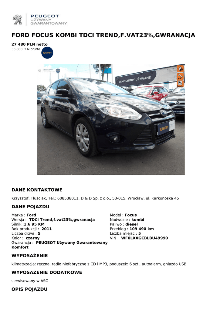 FORD FOCUS KOMBI TDCI TREND,F.VAT23%,GWRANACJA 27 480 PLN netto 33 800 PLN brutto DANE KONTAKTOWE Krzysztof, Tłuściak, Tel.: 608538011, D & D Sp. z o.o., 53-015, Wrocław, ul. Karkonoska 45 DANE POJAZDU Marka : Ford Wersja : TDCi Trend,f.vat23%,gwranacja Silnik :1.6 95 KM Rok produkcji : 2011 Liczba drzwi : 5 Kolor : czarny Gwarancja : PEUGEOT Używany Gwarantowany Komfort Model : Focus Nadwozie : kombi Paliwo : diesel Przebieg : 109 490 km Liczba miejsc : 5 VIN : WF0LXXGCBLBU49990 WYPOSAŻENIE klimatyzacja: ręczna, radio niefabryczne z CD i MP3, poduszek: 6 szt., autoalarm, gniazdo USB WYPOSAŻENIE DODATKOWE serwisowany w ASO OPIS POJAZDU PAKIET KORZYŚCI: Dlaczego warto kupić auto w D&D PEUGEOT UŻYWANY GWARANTOWANY: -Bo jesteśmy liderem w sprzedaży samochodów Peugeot Używany Gwarantowany na DOLNYM ŚLĄSKU -Dokładnie sprawdzamy stan techniczny, -W każdym samochodzie GWARANTUJEMY przebieg, -Na fakturze sprzedaży zawsze wpisujemy przebieg i wystawiamy na pełną wartość auta -Auto zawsze posiada aktualne badanie techniczne i ważne ubezpieczenie OC -Klient zawsze otrzymuje komplet dokumentów do rejestracji -Gwarantujemy jazdę próbną i profesjonalną obsługą -Dla nas najważniejszy jest Klient KREDYT- dla osób fizycznych i firm do 84 miesięcy, kredyt do 100% wartości auta LEASING – minimalne wpłaty, wykup 1%, od 24-84 miesięcy UBEZPIECZENIA- atrakcyjne PAKIETY DEALERSKIE ODKUPUJEMY SAMOCHODY WSZYSTKICH MAREK ZA GOTÓWKE, ROZLICZAMY BEZGOTÓWKOWO PRZY ZAKUPIE AUTA UŻYWANEGO LUB NOWEGO. Niniejsze ogłoszenie nie stanowi oferty handlowej w myśl art.66, paragraf 1.Kodeksu Cywilnego. Sprzedawca nie odpowiada za ewentualne błędy lub nieaktualność ogłoszenia EBD - elektroniczny rozdział sił hamowania, Felgi stalowe 16 z ogumieniem, Lakier Uni, Fotele przednie styl komfortowy, Fotel kierowcy z regulacją wysokości, Airbag 6 sztuk: poduszki powietrzne czołowe i boczne dla kierowcy i pasażera, kurtyny powietrzne, Komputer pokładowy, ABS, Roleta zasłaniająca przestrzeń bagażową, Szyby przednie elektryczne, Lusterka boczne regulowane elektrycznie, Kierownica skórzana, Lusterka boczne w kolorze nadwozia, System Ford Eco Mode informujący kierowcę o ekonomice jazdy, Radio CD/MP3 (ekran 3,5 cala), 6 głośników, gniazdo USB, sterowanie z kierownicy, ESP - układ stabilizacji toru jazdy z kontrolą trakcji TCS i EBA, Klimatyzacja, Zamek centralny z pilotem, Zestaw do naprawy przebitej opony, Autoalarm obwodowy i pojemnościowy z zamkiem centralnym, pakiet (Autoalarm obwodowy i pojemnościowy, Zamek centralny z pilotem i dwuetapowym ryglowaniem drzwi), Koło zapasowe dojazdowe, Lakier metalik, Światła przeciwmgielne, przód Pierwszy właściciel, Kupiony w ASO w Polsce, Pojazd regularnie serwisowany, samochód sprzedawany z 6 miesięczna gwarancją PUG Samochód sprzedawany w programie PEUGEOT Używany Gwarantowany KOMFORT: Gwarancja Umowna 6 Miesięcy Certyfikat Jakości Pojazdu Dekra Opieka Peugeot Assitance Specjalna Oferta Ubezpieczeniowa Specjalna Oferta Finansowania Zakupu Dowiedz się więcej na : http://www.UzywanyGwarantowany.pl QR CODE DLA OGŁOSZENIA W SERWISIE UZYWANYGWARANTOWANY.PL Powered by TCPDF (www.tcpdf.org)