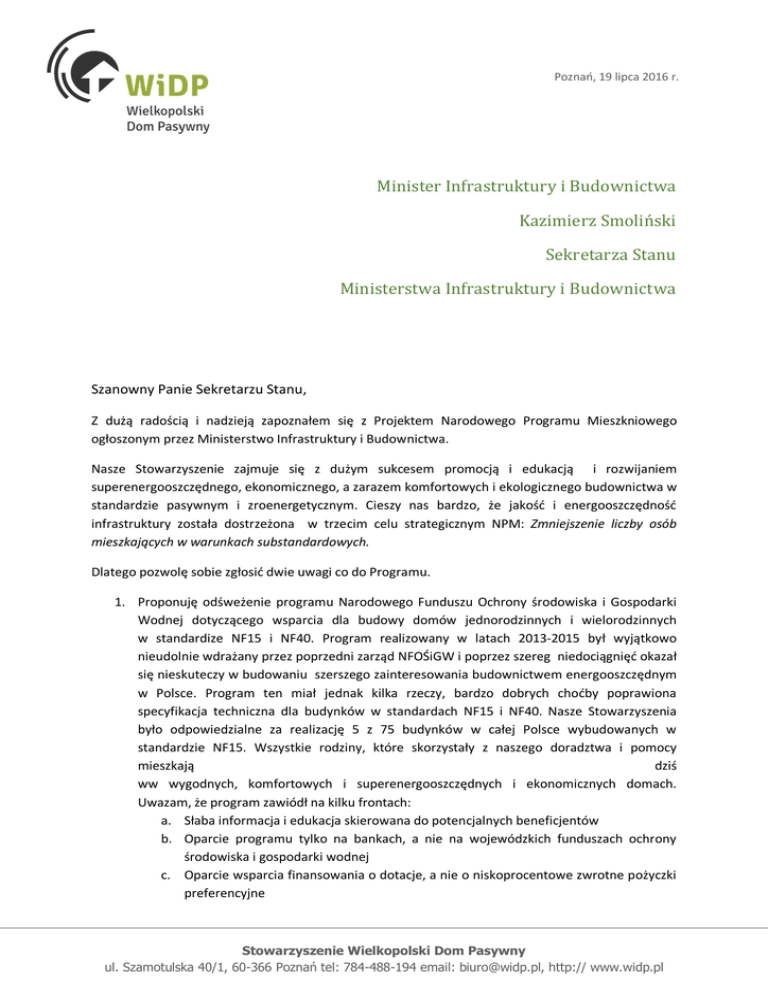 Poznań, 19 lipca 2016 r. Minister Infrastruktury i Budownictwa Kazimierz Smoliński Sekretarza Stanu Ministerstwa Infrastruktury i Budownictwa Szanowny Panie Sekretarzu Stanu, Z dużą radością i nadzieją zapoznałem się z Projektem Narodowego Programu Mieszkniowego ogłoszonym przez Ministerstwo Infrastruktury i Budownictwa. Nasze Stowarzyszenie zajmuje się z dużym sukcesem promocją i edukacją i rozwijaniem superenergooszczędnego, ekonomicznego, a zarazem komfortowych i ekologicznego budownictwa w standardzie pasywnym i zroenergetycznym. Cieszy nas bardzo, że jakość i energooszczędność infrastruktury została dostrzeżona w trzecim celu strategicznym NPM: Zmniejszenie liczby osób mieszkających w warunkach substandardowych. Dlatego pozwolę sobie zgłosić dwie uwagi co do Programu. 1. Proponuję odśweżenie programu Narodowego Funduszu Ochrony środowiska i Gospodarki Wodnej dotyczącego wsparcia dla budowy domów jednorodzinnych i wielorodzinnych w standardize NF15 i NF40. Program realizowany w latach 2013-2015 był wyjątkowo nieudolnie wdrażany przez poprzedni zarząd NFOŚiGW i poprzez szereg niedociągnięć okazał się nieskuteczy w budowaniu szerszego zainteresowania budownictwem energooszczędnym w Polsce. Program ten miał jednak kilka rzeczy, bardzo dobrych choćby poprawiona specyfikacja techniczna dla budynków w standardach NF15 i NF40. Nasze Stowarzyszenia było odpowiedzialne za realizację 5 z 75 budynków w całej Polsce wybudowanych w standardzie NF15. Wszystkie rodziny, które skorzystały z naszego doradztwa i pomocy mieszkają dziś ww wygodnych, komfortowych i superenergooszczędnych i ekonomicznych domach. Uwazam, że program zawiódł na kilku frontach: a. Słaba informacja i edukacja skierowana do potencjalnych beneficjentów b. Oparcie programu tylko na bankach, a nie na wojewódzkich funduszach ochrony środowiska i gospodarki wodnej c. Oparcie wsparcia finansowania o dotacje, a nie o niskoprocentowe zwrotne pożyczki preferencyjne Stowarzyszenie Wielkopolski Dom Pasywny ul. Szamotulska 40/1, 60-366 Poznań tel: 784-488-194 email: [email protected], http:// www.widp.pl d. Nie uwzględnianie oszczędności energetycznych uzyskiwanych przez klientów w ocenie zdolności kredytowej finansowanych projektów 2. Proponuję rozbudowanie programu NFÓSiGW o budowę budynków socjalnych i pod najem. Doświadczenia zagraniczne i Polskie pokazują, że stosowanie wysokich standardów energooszczędności poprzez efekty synergii powoduje polepszenie ekonomicznego statusu obywateli. Koszt ponad 200 zł przypadający na energię do ogrzewania na jednego mieszkańca kraju miesięcznie jest porównywalny w skali do wielkości programu wsparcia rodzin 500+. Poprawa efektywności energetycznej budynków redukująca zapotrzebowanie na energię o 90% jest dziś ekonomicznie i technicznie możliwa. Co więcej koszt takich rozwiązań jest niewielki gdzyż dzięki oszczędnościom kosztów energii inwestycje w efektywność energetyczną szybko się zwracają. W takim wypadku nie potrzebne są instrumenty dotacyjne a jedynie instrumenty pożyczkowe, gdyż raty spłat inwestycji w niskooprezontowanych pożyczkach są zwykle niższe niż korzyści finansowe uzyskiwane przez oszczędność energii. Dzięki temu inwestorzy (biznesowi, samorządowi, spółczielczy i indywidualni) mogą budować nową infrastrukturę o wyskokim standardzie bez uszczuplania budżetu państwa (fundusze zwrotne dają efekt wielokrotnego użycia) 3. Proponuję w rozwiązaniach termomodernizacyjnych i dotyczących nowej infrastruktury energooszczędnej nie zatrzymywać się na wymaganiach obowiązującego dziś (lub w najbliższej przyszłości) prawa dotyczącego wymagań technicznych co do charakterystyki energetycznej budynkóa. Śmiałe cele i wdrażanie najlepszych technologicznie rozwiązań pozwoli na znaczne oszczędności w przyszłości, gdyż dobrze wykonane obiekty będą spełniały wymogi co do charakterystyki energetycznej przez wiele dekad i nie będą potrzebowały kosztownych prac termomodernizacyjnych w długim okresie czasu jednocześnie służąc swoim mieszkańcom. Dotyczy to projektów zarówno nowobudowanych jak i już istniejących. Cieszę się, że ważny temat jakości infrastruktury mieszkalnej i jej efektywności energetycznej znalazł się w Narodowym Programie Mieszkaniowym. Zyczę Państwu powodzenia w jego wdrażaniu i służę swoją pomocą i doświadczeniem. Z poważaniem, Prezes Stowarzyszenia Wielkopolski Dom Pasywny Stowarzyszenie Wielkopolski Dom Pasywny ul. Szamotulska 40/1, 60-366 Poznań tel: 784-488-194 email: [email protected], http:// www.widp.pl