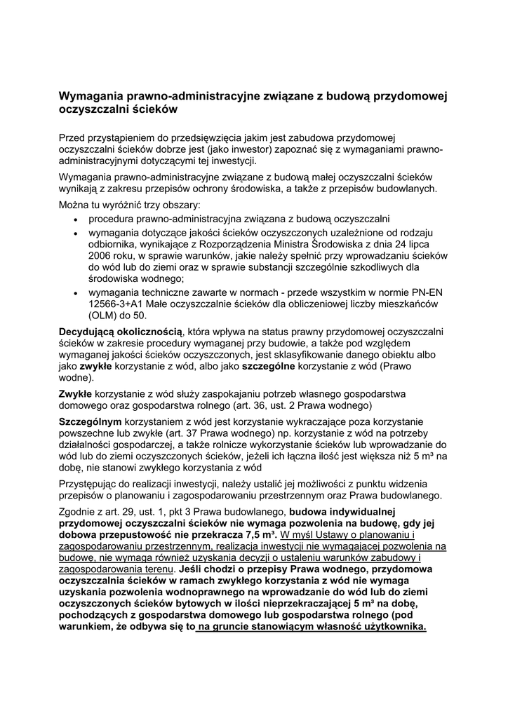 Wymagania prawno-administracyjne związane z budową przydomowej oczyszczalni ścieków Przed przystąpieniem do przedsięwzięcia jakim jest zabudowa przydomowej oczyszczalni ścieków dobrze jest (jako inwestor) zapoznać się z wymaganiami prawnoadministracyjnymi dotyczącymi tej inwestycji. Wymagania prawno-administracyjne związane z budową małej oczyszczalni ścieków wynikają z zakresu przepisów ochrony środowiska, a także z przepisów budowlanych. Można tu wyróżnić trzy obszary: • procedura prawno-administracyjna związana z budową oczyszczalni • wymagania dotyczące jakości ścieków oczyszczonych uzależnione od rodzaju odbiornika, wynikające z Rozporządzenia Ministra Środowiska z dnia 24 lipca 2006 roku, w sprawie warunków, jakie należy spełnić przy wprowadzaniu ścieków do wód lub do ziemi oraz w sprawie substancji szczególnie szkodliwych dla środowiska wodnego; • wymagania techniczne zawarte w normach - przede wszystkim w normie PN-EN 12566-3+A1 Małe oczyszczalnie ścieków dla obliczeniowej liczby mieszkańców (OLM) do 50. Decydującą okolicznością, która wpływa na status prawny przydomowej oczyszczalni ścieków w zakresie procedury wymaganej przy budowie, a także pod względem wymaganej jakości ścieków oczyszczonych, jest sklasyfikowanie danego obiektu albo jako zwykłe korzystanie z wód, albo jako szczególne korzystanie z wód (Prawo wodne). Zwykłe korzystanie z wód służy zaspokajaniu potrzeb własnego gospodarstwa domowego oraz gospodarstwa rolnego (art. 36, ust. 2 Prawa wodnego) Szczególnym korzystaniem z wód jest korzystanie wykraczające poza korzystanie powszechne lub zwykłe (art. 37 Prawa wodnego) np. korzystanie z wód na potrzeby działalności gospodarczej, a także rolnicze wykorzystanie ścieków lub wprowadzanie do wód lub do ziemi oczyszczonych ścieków, jeżeli ich łączna ilość jest większa niż 5 m³ na dobę, nie stanowi zwykłego korzystania z wód Przystępując do realizacji inwestycji, należy ustalić jej możliwości z punktu widzenia przepisów o planowaniu i zagospodarowaniu przestrzennym oraz Prawa budowlanego. Zgodnie z art. 29, ust. 1, pkt 3 Prawa budowlanego, budowa indywidualnej przydomowej oczyszczalni ścieków nie wymaga pozwolenia na budowę, gdy jej dobowa przepustowość nie przekracza 7,5 m³. W myśl Ustawy o planowaniu i zagospodarowaniu przestrzennym, realizacja inwestycji nie wymagającej pozwolenia na budowę, nie wymaga również uzyskania decyzji o ustaleniu warunków zabudowy i zagospodarowania terenu. Jeśli chodzi o przepisy Prawa wodnego, przydomowa oczyszczalnia ścieków w ramach zwykłego korzystania z wód nie wymaga uzyskania pozwolenia wodnoprawnego na wprowadzanie do wód lub do ziemi oczyszczonych ścieków bytowych w ilości nieprzekraczającej 5 m³ na dobę, pochodzących z gospodarstwa domowego lub gospodarstwa rolnego (pod warunkiem, że odbywa się to na gruncie stanowiącym własność użytkownika. Chociaż zgodnie z Prawem wodnym oczyszczalnie ścieków w warunkach zwykłego korzystania z wód nie są urządzeniami wodnymi (nie wymagają pozwolenia wodnoprawnego), jednak zaliczane są do instalacji mogących negatywnie oddziaływać na środowisko, z których emisja wymaga zgłoszenia właściwemu organowi ochrony środowiska (art. 152 Prawa ochrony środowiska). Obowiązek ten wynika bezpośrednio z Rozporządzenia Ministra Środowiska z dnia 22 grudnia 2004 roku w sprawie rodzajów instalacji, których eksploatacja wymaga zgłoszenia. Zgłoszenia należy dokonać co najmniej na 30 dni przed rozpoczęciem eksploatacji oczyszczalni. Organem właściwym do przyjęcia zgłoszenia jest wójt, burmistrz lub prezydent miasta. Zgłoszenie to powinno zawierać dane dotyczące: • eksploatującego oczyszczalnię, wraz z adresem, • czasu pracy instalacji oraz ilości i składu odprowadzanych ścieków, • spełniania norm jakości odprowadzanych ścieków. Organ przyjmujący zgłoszenie może w ciągu 30 dni wnieść w formie decyzji wymagania dotyczące eksploatacji oczyszczalni. W przypadku braku zgłoszenia eksploatacji organ może nałożyć na eksploatującego karę grzywny. W razie naruszenia warunków decyzji określającej wymagania dotyczące eksploatacji tej oczyszczalni wójt, burmistrz lub prezydent miasta może w drodze decyzji wstrzymać jej użytkowanie. Chociaż budowa oczyszczalni przydomowej o dobowej przepustowości do 7,5 m³ nie wymaga pozwolenia na budowę, aby pozostać w zgodzie z Prawem budowlanym, należy co najmniej na 30 dni przed zamierzonym terminem rozpoczęcia robót budowlanych dokonać zgłoszenia zamiaru budowy w administracji budowlanej (wydział architektury i budownictwa) starostwa powiatowego. Do zgłoszenia należy dołączyć: • oświadczenie o posiadaniu prawa do dysponowania nieruchomością na cele budowlane; • projekt zagospodarowania działki i projekt budowlany oczyszczalni, sporządzony przez osobę posiadającą stosowne uprawnienia budowlane, projekt powinien zawierać informację o warunkach geologicznych pod projektowanym osadnikiem i drenażem rozsączającym; • szkice i rysunki oraz opis (rodzaj, zakres i sposób wykonania) robót budowlanych; • pozwolenia, uzgodnienia i opinie wymagane odrębnymi przepisami; • dowód wniesienia opłaty skarbowej za pełnomocnictwo, w przypadku jego ustanowienia. W razie konieczności uzupełnienia zgłoszenia, organ nakłada w drodze postanowienia obowiązek uzupełnienia w określonym terminie brakujących dokumentów, a w przypadku ich nieuzupełnienia - wnosi sprzeciw w drodze decyzji. W ciągu 30 dni organ administracji budowlanej może nałożyć obowiązek uzyskania pozwolenia na budowę, gdy istnieją podejrzenia, że realizacja pociągnie za sobą pogorszenie stanu środowiska, warunków zdrowotno-sanitarnych itp. Po tym okresie, jeżeli organ nie wniesie sprzeciwu, można przystąpić do wykonania robót budowlanych - nie później niż po upływie 2 l