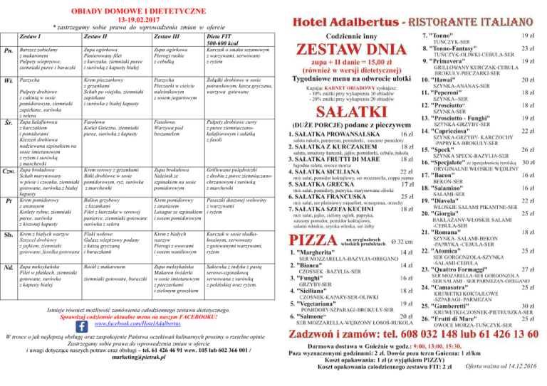 OBIADY DOMOWE I DIETETYCZNE 13-19.02.2017 * zastrzegamy sobie prawa do wprowadzenia zmian w ofercie Zestaw I Zestaw II Zestaw III Dieta FIT 500-600 kcal Pn. Barszcz zabielany z makaronem Pulpety wieprzowe, ziemniaki puree i buraczki Zupa ogórkowa Panierowany filet z kurczaka, ziemniaki puree i surówką z kapusty białej Zupa ogórkowa Pierogi ruskie z cebulką Kurczak o smaku sezamowym z warzywami, serwowany z ryŜem Wt. Parzycha Krem pieczarkowy z grzankami Schab po wiejsku, ziemniaki zapiekane i surówka z białej kapusty Parzycha Pieczarki w cieście naleśnikowym z sosem jogurtowym śołądki drobiowe w sosie potrawkowym, kasza gryczana, warzywa gotowane Fasolowa Kotlet Gniezno, ziemniaki puree, surówka z kapusty Fasolowa Warzywa pod beszamelem Pulpety drobiowe curry z puree ziemniaczanokalafiorowym i sałatką z fasoli Krem serowy z grzankami Bitki drobiowe w sosie pomidorowym, ryŜ, surówka z marchewki Zupa brokułowa Naleśnik ze szpinakiem na sosie pomidorowym Grillowane polędwiczki z drobiu z puree ziemniaczanochrzanowym i surówką z marchewki Bulion grzybowy z łazankami Filet z kurczaka w serowej panierce, ziemniaki gotowane surówka z selera Krem pomidorowy Paseczki duszonej wołowiny z ananasem z warzywami Lasagne ze szpinakiem i ryŜem i sosem pomidorowym Flaki wołowe Gulasz wieprzowy podany z kaszą gryczaną i buraczkami Krem z białych warzyw Pierogi z owocami i sosem waniliowym Kurczak w sosie słodkokwaśnym, serwowany z gotowanymi warzywami, ryŜem Rosół z makaronem Zupa meksykańska Makaron świderki w sosie śmietanowym z pieczarkami i zielonym groszkiem Sakiewka z indyka z pastą serowo-szpinakową serwowana z surówką z pekińskiej oraz ryŜem. Śr. Czw. Pt Sb. Pulpety drobiowe z cukinią w sosie pomidorowym, ziemniaki zapiekane, surówka z selera Zupa kalafiorowa z kurczakiem i pomidorami Kieszeń drobiowa nadziewana szpinakiem na sosie śmietanowym z ryŜem i surówką z marchewki Zupa brokułowa Schab marynowany w piwie i czosnku, ziemniaki gotowane, surówka z białej kapusty Krem pomidorowy z ananasem Kotlety rybne, ziemniaki puree, surówka z kiszonej kapusty Krem z białych warzyw Sznycel drobiowy z jajkiem, ziemniaki gotowane, fasolka gotowana Nd. Zupa meksykańska Filet w płatkach, ziemniaki gotowane, surówka z kapusty białej ziemniaki gotowane, buraczki Istnieje równieŜ moŜliwość zamówienia całodziennego zestawu dietetycznego. Sprawdzaj codziennie aktualne menu na naszym FACEBOOKU! www.facebook.com/HotelAdalbertus W trosce o jak najlepszą obsługę oraz zaspokojenie Państwa oczekiwań kulinarnych prosimy o rzetelne opinie Zastrzegamy sobie prawa do wprowadzenia zmian w ofercie i uwagi dotyczące naszych potraw oraz obsługi – tel. 61 426 46 91 wew. 105 lub 602 366 001 / [email protected]