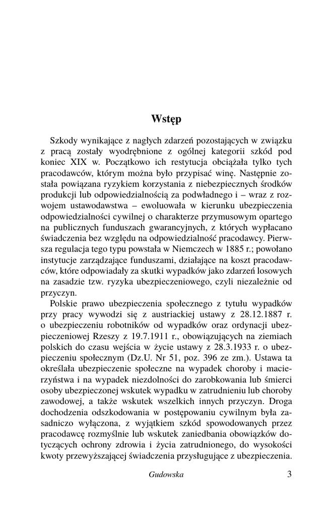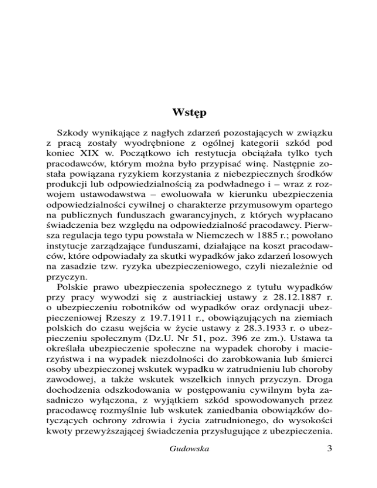 Wstęp Szkody wynikające z nagłych zdarzeń pozostających w związku z pracą zostały wyodrębnione z ogólnej kategorii szkód pod koniec XIX w. Początkowo ich restytucja obciążała tylko tych pracodawców, którym można było przypisać winę. Następnie została powiązana ryzykiem korzystania z niebezpiecznych środków produkcji lub odpowiedzialnością za podwładnego i – wraz z rozwojem ustawodawstwa – ewoluowała w kierunku ubezpieczenia odpowiedzialności cywilnej o charakterze przymusowym opartego na publicznych funduszach gwarancyjnych, z których wypłacano świadczenia bez względu na odpowiedzialność pracodawcy. Pierwsza regulacja tego typu powstała w Niemczech w 1885 r.; powołano instytucje zarządzające funduszami, działające na koszt pracodawców, które odpowiadały za skutki wypadków jako zdarzeń losowych na zasadzie tzw. ryzyka ubezpieczeniowego, czyli niezależnie od przyczyn. Polskie prawo ubezpieczenia społecznego z tytułu wypadków przy pracy wywodzi się z austriackiej ustawy z 28.12.1887 r. o ubezpieczeniu robotników od wypadków oraz ordynacji ubezpieczeniowej Rzeszy z 19.7.1911 r., obowiązujących na ziemiach polskich do czasu wejścia w życie ustawy z 28.3.1933 r. o ubezpieczeniu społecznym (Dz.U. Nr 51, poz. 396 ze zm.). Ustawa ta określała ubezpieczenie społeczne na wypadek choroby i macierzyństwa i na wypadek niezdolności do zarobkowania lub śmierci osoby ubezpieczonej wskutek wypadku w zatrudnieniu lub choroby zawodowej, a także wskutek wszelkich innych przyczyn. Droga dochodzenia odszkodowania w postępowaniu cywilnym była zasadniczo wyłączona, z wyjątkiem szkód spowodowanych przez pracodawcę rozmyślnie lub wskutek zaniedbania obowiązków dotyczących ochrony zdrowia i życia zatrudnionego, do wysokości kwoty przewyższającej świadczenia przysługujące z ubezpieczenia. Gudowska 3 Wstęp Dekret z 25.6.1954 r. o powszechnym zaopatrzeniu emerytalnym (tekst pierwotny – Dz.U. Nr 30, poz. 116 ze zm.), ze względu na założenia ustrojowe, przewidywał finansowanie świadczeń z jednolitego budżetu, lecz tylko wówczas, gdy skutkiem wypadku lub choroby zawodowej była utrata zdolności do zarobkowania w stopniu III grupy inwalidów z degresją wysokości świadczeń w zależności od wysokości zarobków, jednak wyższych od powszechnych i przyznawanych bez warunku stażu. Uspołecznione zakłady pracy zobowiązane były do odszkodowania na podstawie prawa cywilnego w zakresie skutków spowodowanych naruszeniem obowiązków wynikających z przepisów dotyczących ochrony życia i zdrowia pracowników, a zakłady nieuspołecznione w każdym wypadku, jeżeli choroba, niezdolność do pracy lub śmierć były następstwem okoliczności uzasadniających odpowiedzialność na podstawie przepisów prawa cywilnego. W kolejnej regulacji dokonano wydzielenia wypadków przy pracy i chorób zawodowych pracowników uspołecznionych zakładów pracy, które objęto przepisami ustawy z 23.1.1968 r. o świadczeniach pieniężnych przysługujących w razie wypadków przy pracy (Dz.U. Nr 3, poz. 8 ze zm.), z prawem do świadczeń długoterminowych i jednorazowego odszkodowania wypłacanego z funduszu ubezpieczenia, przy jednoczesnym zastrzeżeniu, że świadczenia przewidziane w ustawie stanowią w stosunku do uspołecznionego zakładu pracy wynagrodzenie wszelkich szkód. Zatrudnionym w nieuspołecznionym zakładzie pracy oraz z tytułu wypadków „w zatrudnieniu” oraz także uspołecznionych zakładów pracy w drodze do i z pracy, przysługiwały świadczenia określone w przepisach o powszechnym zaopatrzeniu emerytalnym pracowników i ich rodzin, które takżestanowiły w stosunku do uspołecznionego zakładu pracy wynagrodzenie wszelkich szkód spowodowanych inwalidztwem pozostającym w związku z zatrudnieniem w tym zakładzie. Osoba, której przysługiwała renta mogła jednak dochodzić od uspołecznionego zakładu pracy, w którym jest lub była zatrudniona, roszczeń na podstawie prawa cywilnego, gdy inwalidztwo powstało wskutek wypadku w drodze do pracy i z pracy, jeżeli pracownik przewożony był środkami lokomocji zakładu pracy lub będącymi w dyspozycji zakładu pracy. 4 Gudowska