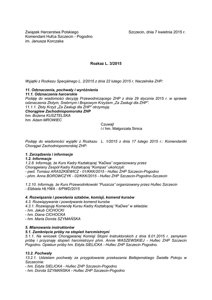 Związek Harcerstwa Polskiego Komendant Hufca Szczecin - Pogodno im. Janusza Korczaka Szczecin, dnia 7 kwietnia 2015 r. Rozkaz L. 3/2015 Wyjątki z Rozkazu Specjalnego L. 2/2015 z dnia 22 lutego 2015 r. Naczelnika ZHP: 11. Odznaczenia, pochwały i wyróżnienia 11.1. Odznaczenia harcerskie Podaję do wiadomości decyzję Przewodniczącego ZHP z dnia 29 stycznia 2015 r. w sprawie odznaczenia Złotym, Srebrnym i Brązowym Krzyżem „Za Zasługi dla ZHP”. 11.1.1. Złoty Krzyż „Za Zasługi dla ZHP” otrzymują: Chorągiew Zachodniopomorska ZHP hm. Bożena KUSZTELSKA hm. Adam MROWIEC Czuwaj! /-/ hm. Małgorzata Sinica Podaję do wiadomości wyjątki z Rozkazu L. 1/2015 z dnia 17 lutego 2015 r.: Komendantki Chorągwi Zachodniopomorskiej ZHP: 1. Zarządzenia i informacje 1.2. Informacje 1.2.8. Informuję, że Kurs Kadry Kształcącej “KaDwa” organizowany przez Chorągwiany Zespół Kadry Kształcącej “Kompas” ukończyli: - pwd. Tomasz ARASZKIEWICZ - 01/KKK/2015 - Hufiec ZHP Szczecin-Pogodno - phm. Anna BOROWCZYK - 02/KKK/2015 - Hufiec ZHP Szczecin-Pogodno-Szczecin 1.2.10. Informuję, że Kurs Przewodnikowski “Puszcza” organizowany przez Hufiec Szczecin - Elżbieta HŁYWA - 6/PWD/2015 4. Rozwiązania i powołania sztabów, komisji, komend kursów 4.3. Rozwiązywanie i powoływanie komend kursów 4.3.1. Rozwiązuję Komendę Kursu Kadry Kształcącej “KaDwa” w składzie: - hm. Jakub CICHOCKI - hm. Diana CICHOCKA - hm. Maria Dorota SZYMAŃSKA 5. Mianowania instruktorów 5.1. Zamknięcie próby na stopień harcmistrzyni 5.1.1. Na wniosek Chorągwianej Komisji Stopni Instruktorskich z dnia 8.01.2015 r. zamykam próbę i przyznaję stopień harcmistrzyni phm. Annie WASZEWSKIEJ - Hufiec ZHP Szczecin Pogodno. Opiekun próby hm. Edyta SIELICKA - Hufiec ZHP Szczecin Pogodno. 13.2. Pochwały 13.2.1. Udzielam pochwały za przygotowanie przekazania Betlejemskiego Światła Pokoju w Szczecinie: - hm. Edyta SIELICKA - Hufiec ZHP Szczecin-Pogodno - hm. Dorota SZYMAŃSKA - Hufiec ZHP Szczecin-Pogodno - hm. Anna WASZEWSKA - Hufiec ZHP Szczecin-Pogodno - dh. Karolina STROJNA - Hufiec Szczecin-Pogodno - dh. Bartosz KUBACKI - Hufiec Szczecin-Pogodno Czuwaj! /-/ hm. Eliza Gilewska Podaję do wiadomości wyjątki z Rozkazu L. 2/2015 z dnia 22 lutego 2015 r. Komendantki Chorągwi Zachodniopomorskiej ZHP: 1. Zarządzenia i informacje 1.2. Informacje 1.2.1. Informuję, że Odznakę 80-lecia Harcerstwa na Pomorzu Zachodnim zdobyli: Hufiec ZHP Szczecin-Pogodno, XXX Drużyna Harcerska "Reduta" 1. Mikołaj MARCZAK 2. phm. Anna BOROWCZYK 3. Adam BAJZERT 4. Julia BARTKOWIAK 5. Michał BARTKOWIAK 6. Barbara BOJARUN 7. Oliwia GRZYBKOWSKA 8. Kacper GRZYBKOWSKI 9. Weronika KADŁUBOWSKA 10. Aleksandra KOWALCZYK 11. Kamila KRYSIAK 12. Katarzyna PEREJCZUK 13. Hanna PIOTROWSKA 14. Natalia RYSZ 15. Kacper SUKIENNICKI 16. Dawid URBAŃSKI 17. Michał WARCHOŁ 18. Michał WICHER Czuwaj! /-/ hm. Eliza Gilewska Podaję do wiadomości wyjątki z Rozkazu L. 3/2015 z dnia 6 marca 2015 r. Komendantki Chorągwi Zachodniopomorskiej ZHP: 4. Rozwiązania i powołania sztabów, komisji, komend kursów 4.3. Rozwiązywanie i powoływanie komend kursów 4.3.1. Powołuję Komendę Kursu Podharmistrzowskiego “Szekla II” w składzie: - hm. Jakub CICHOCKI - komendant - hm. Maria Dorota SZYMAŃSKA 13. Odznaczenia, pochwały, wyróżnienia 13.1. Serdecznie dziękuję za pomoc w organizacji i przeprowadzeniu Gali Dnia Myśli Braterskiej: - hm. Annie WASZEWSKIEJ - hm. Edycie SIELICKIEJ - pwd. Małgorzacie KUSZYŃSKIEJ - hm. Krzysztofowi KOWALCZYKOWI - phm. Agacie MASZCZYKOWSKIEJ - hm. Maciejowi GRABOWSKIEMU Czuwaj! /-/ hm. Eliza Gilewska 1. Zarządzenia i informacje 1.2. Informacje 1.2.1. Informuję, że Kurs Przewodnikowski „SIAK” organizowany przez Zespół Kadry Kształcącej Hufca Szczecin- Pogodno ukończyli: - Tomasz Cichowski – KPWD/01/15 - Hufiec ZHP Szczecin-Pogodno, - Jakub Chmiel – KPWD/02/15 – Hufiec ZHP Szczecin-Pogodno, - Patrycja Duraj – KPWD/03/15 – Hufiec ZHP Szczecin-Pogodno, - Adrianna Majdanik – KPWD/04/15 – Hufiec ZHP Szczecin-Pogodno, - Dominika Jankowska – KPWD/05/15 – Hufiec ZHP Goleniów, - Krzysztof Listowski – KPWD/06/15 – Hufiec ZHP Szczecin, - Anita Michnicz – KPWD/07/15 – Hufiec ZHP Goleniów, - Martyna Murawka – KPWD/08/15 – Hufiec ZHP Goleniów, - Dominika Pałucka – KPWD/09/15 – Hufiec ZHP Szczecin-Pogodno, - Kamila Żabicka – KPWD/11/15 – Hufiec ZHP Goleniów. 1.2.2. Informuję, że Kurs Przybocznych „SPINACZ” organizowany przez Hufiec SzczecinPogodno ukończyli: - Mateusz Poręba – HZKK/SPINACZ/1/2015 – Hufiec ZHP Goleniów, - Klaudia Szajewska – HZKK/SPINACZ/2/2015 – Hufiec ZHP Szczecin-Pogodno, - Kamila Krysiak – HZKK/SPINACZ/4/2015 - Hufiec ZHP Szczecin-Pogodno, - Michalina Dudra – HZKK/SPINACZ/5/2015 - Hufiec ZHP Szczecin-Pogodno, - Wiktoria Kotecka – HZKK/SPINACZ/6/2015 – Hufiec ZHP Goleniów, - Julia Lisiak – HZKK/SPINACZ/7/2015 – Hufiec ZHP Goleniów, - Alicja Pacholska – HZKK/SPINACZ/8/2015 – Hufiec ZHP Goleniów, - Aleksandra Gaweł – HZKK/SPINACZ/9/2015 – Hufiec ZHP Goleniów, - Aleksandra Brejwo – HZKK/SPINACZ/10/2015 - Hufiec ZHP Szczecin-Pogodno, - Angelika Karolak - HZKK/SPINACZ/11/2015 - Hufiec ZHP Szczecin-Pogodno, - Anna Leszczyńska - HZKK/SPINACZ/12/2015 - Hufiec ZHP Szczecin, - Joanna Grzybowska - HZKK/SPINACZ/13/2015 – Hufiec ZHP Goleniów, - Adrianna Strzebońska - HZKK/SPINACZ/14/2015 – Hufiec ZHP Goleniów, - Piotr Gutsche - HZKK/SPINACZ/15/2015 – Hufiec ZHP Goleniów, - Jakub Grzegorek - HZKK/SPINACZ/16/2015 - Hufiec ZHP Szczecin-Pogodno, - Kacper Zajdel - HZKK/SPINACZ/17/2015 – Hufiec ZHP Goleniów, - Emil Kamieniecki - HZKK/SPINACZ/19/2015 – Hufiec ZHP Goleniów. 2. Hufiec 2.1. Zwolnienia w komendzie hufca 2.1.1. Zwalniam z funkcji zastępcy Komendanta Hufca hm. Macieja Grabowskiego. 2.1.2. Zwalniam z funkcji członka komendy hufca hm. Macieja Grabowskiego. Za dotychczasową, długoletn