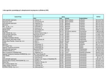 Lista agentów sprzedających ubezpieczenia turystyczne na Białoruś AXA nazwa firmy AXA jednostka agencyjna Piechocka Travel AXA jednostka agencyjna Biacomex Bial - Tur Sp. z .o.o. Junior Białystok Sports tourist MAJNAR AINA TRAVEL Sp. z o.o. AXA jednostka agencyjna CZAJKA TRAVEL ALMABUS BUSINES TRAVEL Biuro Podróży APOLONIA-TOUR Polskie Biuro Podróży - Krosno Sp. z o.o Polwis Biacomex PHT Wieser Tour Agencja Turystyczna WILEJKA AXA jednostka agencyjna SPORTS-TRAVEL s.c. Biuro Turystyczne COPERNICANA Agencja Turystyczno-Handlowa WARMOS Sp. z o.o. ATS TRANS AXA AXA jednostka agencyjna Bankowe Biuro Podróży TRAVELBANK Sp. z o.o Bielpol Sp.j. Biuro Podróży Raytan Tour Happy Holiday Travel Duo PATRON TRAVEL Sp. z o. o ulica ul. Sadowa 14 ul. Warszawska 4/2 ul. Ogrodowa 31 ul. Legionowa 9/1 ul. Krakowska 17 ul. Stołeczna 25 ul. Starowiejska 35 ul. Brzozowa 3 ul. Sereno Fenn'a 14 lok. 1 Kalwaryjska 35 A/211 ul. Basztowa 3/3 ul. Pawia 5 ul. Grzegórzecka 25 ul. Blich 1 ul. Zana 11 ul. Sikorskiego 13 ul. Piotrkowska 37 ul. Piotrkowska 20 Katowicka 35/122 ul. Gwarna 13 ul. Żeglarska 31/1 Plac Trzech Krzyży 16 ul. Nowogrodzka 50 m. 504 ul. Wiertnicza 54 ul. Glogera 2 lok. 5 (przy ul. Wawelskiej 76) ul. Waliców 11 ul. Grójecka 128 paw. 42 ul. Trębacka 4/4 ul. Czackiego 3/5 ul. Zakroczymska 1 adres kod 21-500 21-500 15-027 15-281 15-875 15-879 81-363 05-510 31-143 30-504 31-134 31-154 31-532 38-400 20-601 18-100 90-410 90-269 61-131 61-702 87-100 00-499 00-695 02-952 02-051 00-851 02-383 00-074 00-043 00-225 telefon miasto Biała Podlaska Biała Podlaska Białystok Białystok Białystok Białystok Gdynia Konstancin Jeziorna Kraków Kraków Kraków Kraków Kraków Krosno Lublin Łapy Łódź Łódź Poznań Poznań Toruń Warszawa Warszawa Warszawa Warszawa Warszawa Warszawa Warszawa Warszawa Warszawa województwo podlaskie podlaskie podlaskie podlaskie podlaskie podlaskie pomorskie mazowieckie małopolskie małopolskie małopolskie małopolsoe małopolskie podkarpackie lubelskie podlaskie łódzkie łódzkie Wielkopolskie wielkopolskie kujawsko-pomorskie mazowieckie mazowieckie mazowieckie mazowieckie mazowieckie mazowieckie mazowieckie mazowieckie mazowieckie 083 343 87 82 083 444 00 40 085 733 38 37 085 742 49 05 085 744 52 52 085 744 43 26 058 621 91 64 0 889 093 895 012 422 22 09 012 656 10 53 012 430 01 09 012 269 93 10 012 422 00 30 013 43 230 80 081 534 53 83 085 715 73 13 042 630 06 04 042 630 60 70 0 669 503 307 061 852 52 26 056 622 30 02 022 215 90 89 022 629 46 71 602 131 281 0 501 087 117 022 654 35 25 022 622 42 27 022 630 97 18 022 826 28 21 022 635 97 75 Polskie Towarzystwo Turystyczno-Krajoznawcze od. Mazowsze Serwis Konsularny S.C. Wspólnota 2000 Sp. zo.o Wyjeżdżam.pl ul. Litewska 11/13 Ul. Krakowskie Przedmieście 79 lok. 313 ul. Belwederska 40 lok. 1 ul. Targowa 72 (CH Wileńska) 00-589 00-079 00-594 03-734 Warszawa Warszawa Warszawa Warszawa mazowieckie mazowieckie mazowieckie mazowieckie 022 629 39 47 022 826 44 62 022 851 06 89 022 331 60 92 AXA jednostka agencyjna Stowarzyszenie Współpracy Polska-Wschód KALINKA ALMABUS BUSINES TRAVEL Biacomex Biacomex AXA jednostka agencyjna ul.Górczewska 212/226 lok. 401 IV piętro (biurowiec na tyłach marketu TESCO) ul. Marszałkowska 115 ul. Świdnicka 39 Rynek im.J.Piłsudskiego 35 ul. Mazowiecka 2 ul Solna 3 01-460 00-102 50-029 18-200 18-300 22-400 Warszawa Warszawa Wrocław Wysokie Mazowieckie Zambrów Zamość mazowieckie mazowieckie dolnośląskie mazowieckie podlaskie lubelskie 0 791 488 368 022 620 53 75 071 342 88 71 086 275 36 65 086 271 03 61 084 627 14 83