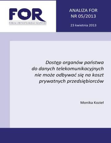 ANALIZA FOR NR 05/2013 23 kwietnia 2013 Dostęp organów państwa do danych telekomunikacyjnych nie może odbywać się na koszt prywatnych przedsiębiorców Monika Kozieł Dostęp organów państwa do danych telekomunikacyjnych nie może odbywać się na koszt prywatnych przedsiębiorców Synteza W Polsce przedsiębiorca telekomunikacyjny na własny koszt udostępnia uprawnionym organom publicznym dane telekomunikacyjne – m.in. billingi, dane osobowe i lokalizacyjne abonenta. Skarb Państwa nie zwraca żadnych kosztów tej usługi. Powyższy obowiązek operatorów wynika wprost z art. 180a ustawy Prawo telekomunikacyjne1. Darmowe udostępnianie przez przedsiębiorców danych o połączeniach jest niewłaściwe, ponieważ: zmniejsza przejrzystość działań organów publicznych. Brak danych o kosztach generowanych przez służby w sektorze telekomunikacyjnym pozbawia władze oraz obywateli informacji pozwalających ocenić te działania, organy państwa nie powinny wykonywać swoich zadań na wyłączny koszt prywatnych przedsiębiorców, darmowe udostępnianie informacji organom państwa zwiększa koszty usług abonenckich, żaden przepis prawa europejskiego nie wspomina o kosztach udostępniania danych. Tym bardziej nie narzuca obowiązku ponoszenia kosztów przez przedsiębiorców telekomunikacyjnych. Komisja Europejska opowiada się natomiast za przeniesieniem kosztów na rzecz państwa. odpłatne udostępnianie danych telekomunikacyjnych organom publicznym jest regułą w: Belgii, Danii, Estonii, Francji, Litwie, Holandii, Finlandii, Niemczech, Szwecji, Wielkiej Brytanii. Dlatego pożytecznym i pożądanym jest by: koszty pozyskiwania danych telekomunikacyjnych były ponoszone przez państwo, lub jeśli to okaże się niemożliwe przynajmniej zobowiązać organy państwa do pozyskiwania tych danych w postaci elektronicznej i przesyłanej elektronicznie, zamiast papierowej lub elektronicznej a przesyłanej pocztą. 1 Ustawa z dnia 16 lipca 2004 r. Dz. U. nr 171, poz. 1800 2 Opis przypadku Obowiązek ponoszenia kosztów udostępniania organom państwa wykazów połączeń i innych danych telekomunikacyjnych ciąży na przedsiębiorcach telekomunikacyjnych. Dane, jakie podlegają udostępnieniu, w szczególności dotyczą: danych osoby wykonującej i odbierającej połączenie, rodzaju połączenia, jego daty i czasu trwania, a także lokalizacji abonenta. Lista instytucji uprawnionych do nieodpłatnego telekomunikacyjnych jest bardzo obszerna. Są to: Policja, Straż Graniczna, Żandarmeria Wojskowa, Służba Kontrwywiadu Wojskowego, Centralne Biuro Antykorupcyjne, Agencja Bezpieczeństwa Wewnętrznego, wywiad skarbowy, sądy, prokuratura. uzyskania danych Obliczenie wysokości ponoszonych kosztów przez przedsiębiorców telekomunikacyjnych napotyka na wiele trudności. W stosunkach konsumenckich, koszt takiej usługi zależy m.in. od formy, w jakiej dane mają być przedstawione. Dla przykładowego abonenta, według cennika opublikowanego przez jednego z operatorów2: e-mail ze szczegółowym miesięcznym wykazem połączeń kosztuje 2 zł, analogiczny wydruk – 5 zł, CD-ROM – 10 zł. Przy ilości wniosków wystosowywanych przez organy państwowe (2011 r. ponad 1.8 mln zapytań, w 2012 r. – 1.75 mln3), koszty roczne wszystkich operatorów w 2012 r. sięgały milionów złotych (np. 8.813.100 zł przy założeniu: 1 wniosek = 1 wydruk). Zgodnie z obliczeniami Dziennika Gazety Prawnej koszty w 2011 r. mogły wynieść nawet 74 mln zł4. Szczególne obowiązki przedsiębiorców telekomunikacyjnych, w tym obowiązek bezpłatnego udostępniania danych organom państwowym, regulowane są obecnie przez ustawę Prawo telekomunikacyjne oraz szereg ustaw szczególnych. Ustawa Prawo telekomunikacyjne podlegała wielokrotnym nowelizacjom, w dużej mierze polegały one na dostosowywaniu polskiego prawa do regulacji unijnych. Podobnie było w przypadku nowelizacji z 2009 r.5, która wprowadziła problematyczny art. 180a do polskiego porządku prawnego. 2 http://www.upc.pl/pdf/upc_cennik_uslug_wazny_od_lipca_2012.pdf dostępna w dniu 20.02.2013 r. http://www.uke.gov.pl/files/?id_plik=12771 4 http://www.gazetaprawna.pl/artykuly/648277,inwigilacja_polakow_kosztuje_miliony_placa_za_to_abonenci.html opublikowana dnia 19 września 2012 r., dostępna w dniu 20.02.2012 r. 5 Ustawa z dnia 24 kwietnia 2009 r. - Dz.U. z 2009 nr 85 poz. 716 3 3 Obowiązujące przed nowelizacją z 24 kwietnia 2009 r. art. 165 ust. 1 i art. 166 ust. 5 ustawy Prawo telekomunikacyjne (zastąpione przez obecnie obowiązujący art. 180a) nie rozstrzygały tego, kto poniesie koszty udostępnienia bilingów. Wspomniane przepisy zawierały jedynie odesłanie do ustaw szczególnych. W przypadku ustaw regulujących zadania „organów ścigania i służb specjalnych” (ustawy: o Policji, o Straży Granicznej, o Agencji Bezpieczeństwa Wewnętrznego i Agencji Wywiadu itp.) ustawodawca nie pozostawiał wątpliwości. Wspomniane regulacje szczególne od początku bezpośrednio zastrzegały konieczność ponoszenia kosztów przez przedsiębiorcę telekomunikacyjnego. Inaczej kształtowała się sytuacja w przypadku Kodeksu postępowania karnego (później KPK), który reguluje możliwość udostępniania danych na rzecz sądu i prokuratury. Żaden przepis KPK nigdy nie wspominał o konieczności ponoszenia opłat przez operatora. KPK odsyłał jedynie do przepisów prawa telekomunikacyjnego, w którym brakowało wzmianki o kosztach. Odmienne ujęcie analogicznej kwestii w KPK, przemówiło za koniecznością odmiennego obliczania kosztów udostępniania wykazu połączeń na potrzeby postępowania karnego. Potwierdza to uchwała Sądu Najwyższego z dnia z dnia 22 stycznia 2003 r. (sygn. I KZP 45/026). We wspomnianej uchwale Sąd Najwyższy uznał, że owe koszty stanowią „tymczasowy wydatek państwa”. W konsekwencji powinny być zaliczone na poczet kosztów sądowych. Linia orzecznicza zmieniła się po nowelizacji z 2009 r