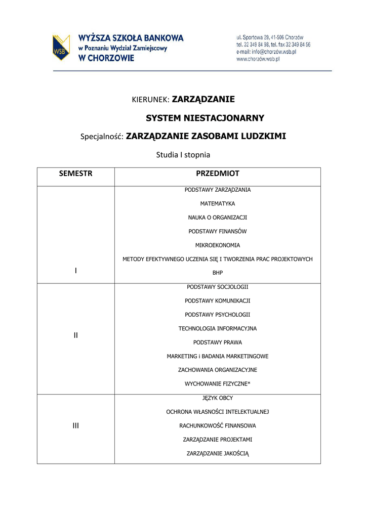 KIERUNEK: ZARZĄDZANIE SYSTEM NIESTACJONARNY Specjalność: ZARZĄDZANIE ZASOBAMI LUDZKIMI Studia I stopnia SEMESTR PRZEDMIOT PODSTAWY ZARZĄDZANIA MATEMATYKA NAUKA O ORGANIZACJI PODSTAWY FINANSÓW MIKROEKONOMIA METODY EFEKTYWNEGO UCZENIA SIĘ I TWORZENIA PRAC PROJEKTOWYCH I BHP PODSTAWY SOCJOLOGII PODSTAWY KOMUNIKACJI PODSTAWY PSYCHOLOGII II TECHNOLOGIA INFORMACYJNA PODSTAWY PRAWA MARKETING i BADANIA MARKETINGOWE ZACHOWANIA ORGANIZACYJNE WYCHOWANIE FIZYCZNE* JĘZYK OBCY OCHRONA WŁASNOŚCI INTELEKTUALNEJ III RACHUNKOWOŚĆ FINANSOWA ZARZĄDZANIE PROJEKTAMI ZARZĄDZANIE JAKOŚCIĄ ZARZĄDZANIE ZASOBAMI LUDZKIMI JĘZYK OBCY STATYSTYKA I EKONOMETRIA SYSTEMY INFORMATYCZNE W ZARZĄDZANIU ZARZĄDZANIE FINANSAMI PRZEDSIĘBIORSTW IV WPROWADZENIE DO PRACY DYPLOMOWEJ WPROWADZENIE NA RYNEK PRACY REKRUTACJA I SELEKCJA PRACOWNIKÓW ORGANIZACJA PROCESÓW PERSONALNYCH W PRZEDSIĘBIORSTWIE PLANOWANIE ZATRUDNIENIA SEMINARIUM DYPLOMOWE ROZWÓJ ZASOBÓW LUDZKICH V KIEROWANIE LUDŹMI W ORGANIZACJI SYSTEMY MOTYWACYJNE SEMINARIUM DYPLOMOWE SYSTEMY OCENIANIA PRACOWNIKÓW KULTURA ORGANIZACJI VI STRES ZAWODOWY I WYPALENIE ZAWODOWE WIRTUALNE ŚRODOWISKO NAUCZANIA SEMINARIUM DYPLOMOWE PRAKTYKA ZAWODOWA * przedmiot fakultatywny