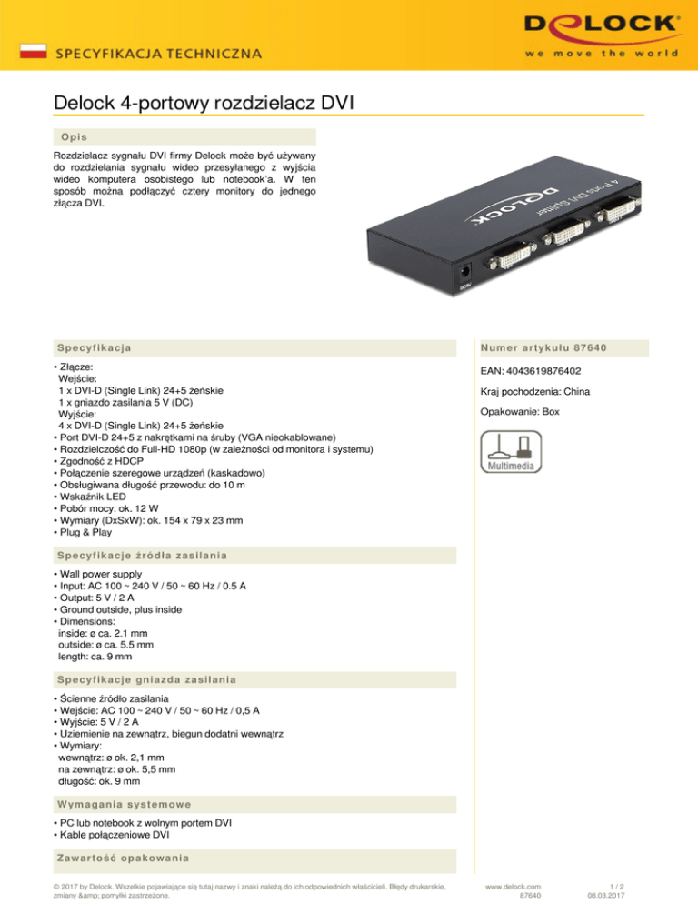 Delock 4-portowy rozdzielacz DVI Opis Rozdzielacz sygnału DVI firmy Delock może być używany do rozdzielania sygnału wideo przesyłanego z wyjścia wideo komputera osobistego lub notebook’a. W ten sposób można podłączyć cztery monitory do jednego złącza DVI. Specyfikacja • Złącze: Wejście: 1 x DVI-D (Single Link) 24+5 żeńskie 1 x gniazdo zasilania 5 V (DC) Wyjście: 4 x DVI-D (Single Link) 24+5 żeńskie • Port DVI-D 24+5 z nakrętkami na śruby (VGA nieokablowane) • Rozdzielczość do Full-HD 1080p (w zależności od monitora i systemu) • Zgodność z HDCP • Połączenie szeregowe urządzeń (kaskadowo) • Obsługiwana długość przewodu: do 10 m • Wskaźnik LED • Pobór mocy: ok. 12 W • Wymiary (DxSxW): ok. 154 x 79 x 23 mm • Plug & Play Numer artykułu 87640 EAN: 4043619876402 Kraj pochodzenia: China Opakowanie: Box Specyfikacje źródła zasilania • Wall power supply • Input: AC 100 ~ 240 V / 50 ~ 60 Hz / 0.5 A • Output: 5 V / 2 A • Ground outside, plus inside • Dimensions: inside: ø ca. 2.1 mm outside: ø ca. 5.5 mm length: ca. 9 mm Specyfikacje gniazda zasilania • Ścienne źródło zasilania • Wejście: AC 100 ~ 240 V / 50 ~ 60 Hz / 0,5 A • Wyjście: 5 V / 2 A • Uziemienie na zewnątrz, biegun dodatni wewnątrz • Wymiary: wewnątrz: ø ok. 2,1 mm na zewnątrz: ø ok. 5,5 mm długość: ok. 9 mm Wymagania systemowe • PC lub notebook z wolnym portem DVI • Kable połączeniowe DVI Zawartość opakowania © 2017 by Delock. Wszelkie pojawiające się tutaj nazwy i znaki należą do ich odpowiednich właścicieli. Błędy drukarskie, zmiany & pomyłki zastrzeżone. www.delock.com 87640 1/2 08.03.2017 • Rozdzielacz DVI • Zasilacz • Instrukcja obsługi Zdjęcia © 2017 by Delock. Wszelkie pojawiające się tutaj nazwy i znaki należą do ich odpowiednich właścicieli. Błędy drukarskie, zmiany & pomyłki zastrzeżone. Powered by TCPDF (www.tcpdf.org) www.delock.com 87640 2/2 08.03.2017