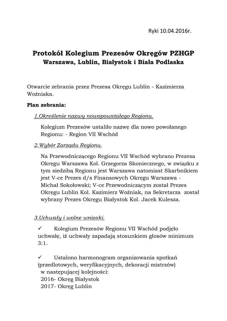 Ryki 10.04.2016r. Protokół Kolegium Prezesów Okręgów PZHGP Warszawa, Lublin, Białystok i Biała Podlaska Otwarcie zebrania przez Prezesa Okręgu Lublin - Kazimierza Woźniaka. Plan zebrania: 1.Określenie nazwy nowopowstałego Regionu. Kolegium Prezesów ustaliło nazwę dla nowo powołanego Regionu: - Region VII Wschód 2.Wybór Zarządu Regionu. Na Przewodniczącego Regionu VII Wschód wybrano Prezesa Okręgu Warszawa Kol. Grzegorza Skoniecznego, w związku z tym siedzibą Regionu jest Warszawa natomiast Skarbnikiem jest V-ce Prezes d/s Finansowych Okręgu Warszawa Michał Sokołowski; V-ce Przewodniczącym został Prezes Okręgu Lublin Kol. Kazimierz Woźniak, na Sekretarza został wybrany Prezes Okręgu Białystok Kol. Jacek Kulesza. 3.Uchwały i wolne wnioski. Kolegium Prezesów Regionu VII Wschód podjęło uchwałę, iż uchwały zapadają stosunkiem głosów minimum 3:1. Ustalono harmonogram organizowania spotkań (przedlotowych, weryfikacyjnych, dekoracji mistrzów) w następującej kolejności: 2016- Okręg Białystok 2017- Okręg Lublin 2018- Okręg Warszawa 2019- Okręg Biała Podlaska Podczas spotkań weryfikacyjnych w skład każdej z Komisji wchodzi 3 osoby delegowane przez Prezesa danego Okręgu. Ustalenie składki na finansowanie Regionu w rok 2016 w wysokości 3 zł od członka, liczone na stan z poprzedniego roku. Określenie współzawodnictwa lotowego na sezon 2016 Mistrzostwo Regionu VII Wschód zostanie rozegrane w następujących kategoriach A, B, C, D, Maraton, GMP, Intermistrzostwo oraz Młode liczone wg. zasad o Mistrzostwo Polski. Dodatkowo nagradzane będą najlepsze lotniki w kategoriach A, B, C, Maraton, Młode z całości spisu. Ponadto zostanie zorganizowany lot dalekodystansowy z miejscowości Harlingen (Holandia) jako lot Regionalny. Termin lotu zostanie ustalony w późniejszym terminie. Zasady lotu z Harlingen: - każdy hodowca może włożyć nieograniczoną ilość gołębi, z tym, że obowiązuje seria 3 z 5. Punktuje pięć pierwszych gołębi zakoszowanych na lot. Po locie zostanie sporządzona lista konkursowa , która wyłoni zwycięzców lotu na zasadach 1:5 wg. regulaminu do kategorii maraton. Trzy pierwsze serie nagrodzone zostaną pucharem i dyplomem oraz do 20 miejsca dyplomem. Nagrody indywidualne dla poszczególnych gołębi: -10 pierwszych gołębi puchar i dyplom, do 30 miejsca dyplom. Nagrody indywidualne obowiązują z całości koszowanych gołębi. Organizacja Turnieju Piłki Nożnej Regionu VII Wschód. Organizatorem turnieju w 2016 roku jest Okręg Lublin. Założenie i prowadzenie strony internetowej Regionu VII Wschód. Osobą upoważnioną do wpisów i aktualizacja na stronie jest Prezes Okręgu Białystok Kol. Jacek Kulesza.