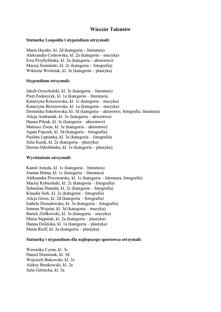 Wieczór Talentów Statuetkę Leopolda i stypendium otrzymali: Maria Hayder, kl. 2d (kategoria – literatura) Aleksandra Cedrowska, kl. 2a (kategoria – muzyka) Ewa Przybylińska, kl. 2a (kategoria – aktorstwo) Maciej Siemiński, kl. 2c (kategoria – fotografia) Wiktoria Wrótniak, kl. 3e (kategoria – plastyka) Stypendium otrzymali: Jakub Grzechulski, kl. 2e (kategoria – literatura) Piotr Fedorczyk, kl. 1e (kategoria – literatura) Katarzyna Kruszewska, kl. 1c (kategoria – muzyka) Katarzyna Brzozowska, kl. 1a (kategoria – muzyka) Dominika Sokołowska, kl. 3d (kategoria – aktorstwo, fotografia, literatura) Alicja Andrasiak, kl. 3e (kategoria – aktorstwo) Hanna Pilzak, kl. 3e (kategoria – aktorstwo) Mateusz Żwan, kl. 3e (kategoria – aktorstwo) Agata Frączek, kl. 3d (kategoria – fotografia) Paulina Lepianka, kl. 3a (kategoria – fotografia) Julia Kazik, kl. 2c (kategoria – plastyka) Dorota Odrobińska, kl. 1e (kategoria – plastyka) Wyróżnienie otrzymali: Kamil Ameda, kl. 1c (kategoria – literatura) Joanna Hutna, kl. 1c (kategoria – literatura) Aleksandra Piwowarska, kl. 1c (kategoria – literatura, fotografia) Maciej Rybusiński, kl. 2c (kategoria – fotografia) Sebastian Dumała, kl. 2c (kategoria – fotografia) Klaudia Siek, kl. 2c (kategoria – fotografia) Alicja Gross, kl. 2d (kategoria – fotografia) Izabela Domalewska, kl. 3a (kategoria – fotografia) Ismena Wojsiat, kl. 3d (kategoria – muzyka) Bartek Ziółkowski, kl. 3e (kategoria – muzyka) Maria Stępniak, kl. 2a (kategoria – plastyka) Hanna Dolińska, kl. 1a (kategoria – plastyka) Marta Rieff, kl. 3a (kategoria – plastyka) Statuetkę i stypendium dla najlepszego sportowca otrzymali: Weronika Cyran, kl. 3c Daniel Dominiak, kl. 3d Wojciech Bukowski, kl. 2e Aleksy Brutkowski, kl. 2e Julia Górnicka, kl. 3a
