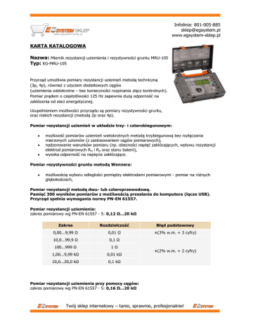 Infolinia: 801-005-885 [email protected] www.egsystem-sklep.pl KARTA KATALOGOWA Nazwa: Miernik rezystancji uziemienia i rezystywności gruntu MRU-105 Typ: EG-MRU-105 Przyrząd umożliwia pomiary rezystancji uziemień metodą techniczną (3p, 4p), również z użyciem dodatkowych cęgów (uziemienia wielokrotne – bez konieczności rozpinania złącz kontrolnych). Pomiar prądem o częstotliwości 125 Hz zapewnia dużą odporność na zakłócenia od sieci energetycznej. Uzupełnieniem możliwości przyrządu są pomiary rezystywności gruntu, oraz niskich rezystancji (metodą 2p oraz 4p). Pomiar rezystancji uziemień w układzie trzy- i czterobiegunowym: możliwość pomiarów uziemień wielokrotnych metodą trzybiegunową bez rozłączania mierzonych uziomów (z zastosowaniem cęgów pomiarowych), nadzorowanie warunków pomiaru (np. obecności napięć zakłócających, wpływu rezystancji elektrod pomiarowych RH i RS oraz stanu baterii), wysoka odporność na napięcia zakłócające. Pomiar rezystywności gruntu metodą Wennera: możliwością wyboru odległości pomiędzy elektrodami pomiarowymi - pomiar na różnych głębokościach, Pomiar rezystancji metodą dwu- lub czteroprzewodową. Pamięć 300 wyników pomiarów z możliwością przesłania do komputera (łącze USB). Przyrząd spełnia wymagania normy PN-EN 61557. Pomiar rezystancji uziemienia: zakres pomiarowy wg PN-EN 61557 - 5: 0,12 Ω...20 kΩ Zakres Rozdzielczość Błąd podstawowy 0,00...9,99 Ω 0,01 Ω ±(3% w.m. + 3 cyfry) 10,0...99,9 Ω 0,1 Ω 100...999 Ω 1Ω 1,00...9,99 kΩ 0,01 kΩ 10,0...20,0 kΩ 0,1 kΩ ±(2% w.m. + 2 cyfry) Pomiar rezystancji uziemienia przy pomocy cęgów: zakres pomiarowy wg PN-EN 61557 - 5: 0,16 Ω...20 kΩ Twój sklep internetowy – tanio, sprawnie, profesjonalnie! Infolinia: 801-005-885 [email protected] www.egsystem-sklep.pl Zakres Rozdzielczość Błąd podstawowy 0,00...9,99 Ω 0,01 Ω ±(8% w.m. + 3 cyfry) 10,0...99,9 Ω 0,1 Ω 100...999 Ω 1Ω 1,00...9,99 kΩ 0,01 kΩ 10,0...20,0 kΩ 0,1 kΩ ±(8% w.m. + 2 cyfry) Pomiar rezystywności gruntu: Zakres Rozdzielczość Błąd podstawowy 0,00...9,99 Ωm 0,01 Ωm ±(3% w.m. + 3 cyfry) 10,0...99,9 Ωm 0,1 Ωm 100...999 Ωm 1 Ωm 1,00...9,99 kΩm 10 Ωm 10,0...99,9 kΩm 100 Ωm 100...999 kΩm 1 kΩm Zależna od dokładności pomiaru RE 4p ale nie mniejsza niż 1cyfra Skrót „w.m.” oznacza „wartość mierzoną wzorcową”. Cena przyrządu MRU-105 nie obejmuje akumulatora. Wyposażenie standardowe: - przewód 50 m żółty na szpuli przewód 25 m czerwony na szpuli sonda ostrzowa żółta z gniazdem bananowym przewód 1,2 m żółty zakończony wtykiem bananowym przewód 2,2 m czarny zakończony wtykami bananowymi sonda do wbijania w grunt (30 cm) 2 szt. krokodylek czarny K01 futerał L2 na miernik i jego wyposażenie przewód do transmisji danych USB szelki do miernika komplet baterii certyfikat kalibracji instrukcja obsługi Twój sklep internetowy – tanio, sprawnie, profesjonalnie!