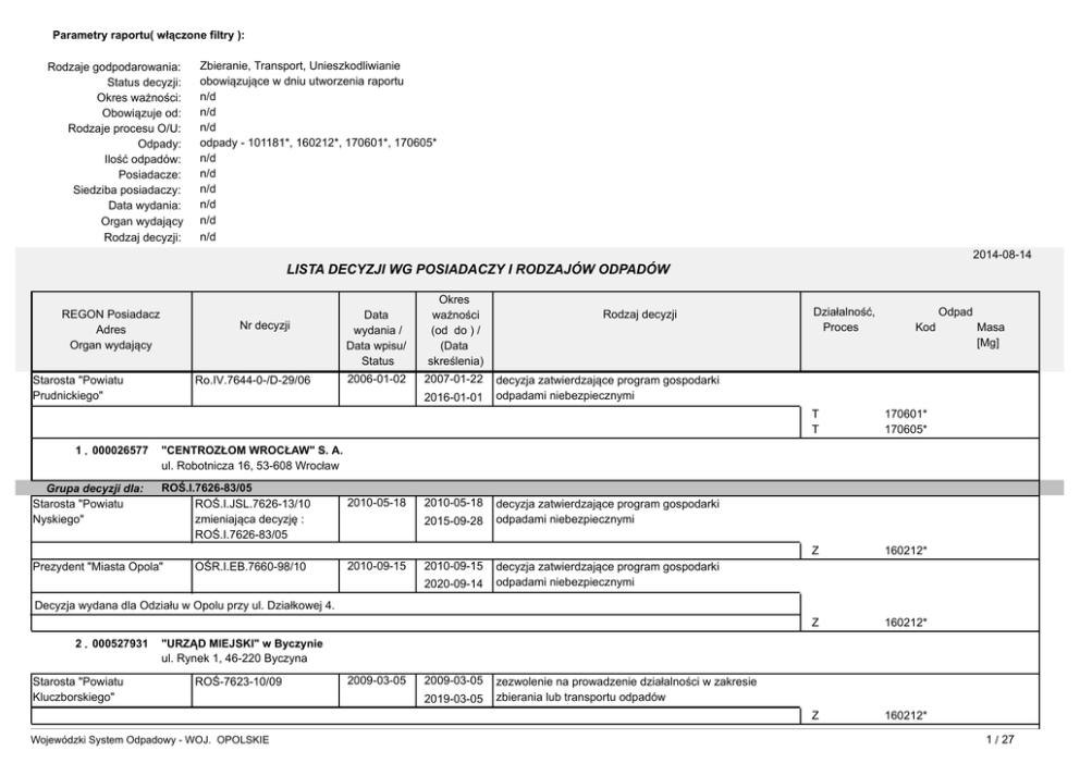 Parametry raportu( włączone filtry ): Rodzaje godpodarowania: Status decyzji: Okres ważności: Obowiązuje od: Rodzaje procesu O/U: Odpady: Ilość odpadów: Posiadacze: Siedziba posiadaczy: Data wydania: Organ wydający Rodzaj decyzji: Zbieranie, Transport, Unieszkodliwianie obowiązujące w dniu utworzenia raportu n/d n/d n/d odpady - 101181*, 160212*, 170601*, 170605* n/d n/d n/d n/d n/d n/d 2014-08-14 LISTA DECYZJI WG POSIADACZY I RODZAJÓW ODPADÓW REGON Posiadacz Adres Organ wydający Nr decyzji Starosta "Powiatu Prudnickiego" 1 . 000026577 Grupa decyzji dla: Starosta "Powiatu Nyskiego" Ro.IV.7644-0-/D-29/06 Data wydania / Data wpisu/ Status Okres ważności (od do ) / (Data skreślenia) 2006-01-02 2007-01-22 2016-01-01 Rodzaj decyzji Działalność, Proces Odpad Kod Masa [Mg] decyzja zatwierdzające program gospodarki odpadami niebezpiecznymi T T 170601* 170605* Z 160212* Z 160212* Z 160212* "CENTROZŁOM WROCŁAW" S. A. ul. Robotnicza 16, 53-608 Wrocław ROŚ.I.7626-83/05 ROŚ.I.JSL.7626-13/10 zmieniająca decyzję : ROŚ.I.7626-83/05 Prezydent "Miasta Opola" OŚR.I.EB.7660-98/10 2010-05-18 2010-05-18 2015-09-28 2010-09-15 2010-09-15 2020-09-14 decyzja zatwierdzające program gospodarki odpadami niebezpiecznymi decyzja zatwierdzające program gospodarki odpadami niebezpiecznymi Decyzja wydana dla Odziału w Opolu przy ul. Działkowej 4. 2 . 000527931 Starosta "Powiatu Kluczborskiego" "URZĄD MIEJSKI" w Byczynie ul. Rynek 1, 46-220 Byczyna ROŚ-7623-10/09 Wojewódzki System Odpadowy - WOJ. OPOLSKIE 2009-03-05 2009-03-05 2019-03-05 zezwolenie na prowadzenie działalności w zakresie zbierania lub transportu odpadów 1 / 27 2014-08-14 LISTA DECYZJI WG POSIADACZY I RODZAJÓW ODPADÓW REGON Posiadacz Adres Organ wydający 3 . 004501006 Nr decyzji Data wydania / Data wpisu/ Status Okres ważności (od do ) / (Data skreślenia) Rodzaj decyzji Działalność, Proces Odpad Kod Masa [Mg] "PRZEDSIĘBIORSTWO WIELOBRANŻOWE" Norbert Ruzik Ostrożnica, ul. Parkowa 9, 47-280 Pawłowiczki Starosta "Powiatu Kędzierzyńsko-Kozielskiego " Śr.7626-1/2007 2007-01-15 2007-01-15 2016-12-31 zezwolenie na prowadzenie działalności w zakresie zbierania lub transportu odpadów Transport bez odpadów o kodach 1604 4 . 004501242 T T T T 101181* 160212* 170601* 170605* T 160212* Z 160212* Z Z 170601* 170605* "OPOL - EKO" Sp. z o.o. ul. Lipowa 28, 49-300 Brzeg Grupa decyzji dla: Starosta "Powiatu Brzeskiego" OŚ.7626/84/08 OŚ.6233.14.2013.SŚ zmieniająca decyzję : OŚ.7626/84/08 Grupa decyzji dla: Starosta "Powiatu Brzeskiego" OŚ.7626/66/07 OŚ.7626/96/08 zmieniająca decyzję : OŚ.7626/66/07 2013-06-04 2013-06-04 2018-11-23 2008-12-05 2008-12-05 2017-11-07 zezwolenie na prowadzenie działalności w zakresie zbierania lub transportu odpadów zezwolenie na prowadzenie działalności w zakresie zbierania lub transportu odpadów Dodano nowe odpady. 5 . 004520096 Starosta "Powiatu Opolskiego" 6 . 004531740 Grupa decyzji dla: P.P.H.U. Surowce Wtórne Kowalski Mariusz, Masicki Aleksander "KO - MA" Spółka Jawna ul. Oleska 117, 45-233 Opole OŚ.MDz.7647/36/06 2006-04-11 2006-04-11 2016-03-31 zezwolenie na prowadzenie działalności w zakresie zbierania lub transportu odpadów Rudolf Hyla "HYLA TRANS" ul. Semaforowa 16, 45-666 opole OŚR.III.EB.7661-47/2006 Wojewódzki System Odpadowy - WOJ. OPOLSKIE 2 / 27 2014-08-14 LISTA DECYZJI WG POSIADACZY I RODZAJÓW ODPADÓW REGON Posiadacz Adres Organ wydający Nr decyzji Prezydent "Miasta Opola" 7 . 012914009 Starosta "Powiatu Krapkowickiego" Grupa decyzji dla: Starosta "Powiatu Krapkowickiego" Starosta "Powiatu Krapkowickiego" OŚR-I.6233.7.2012.EB zmieniająca decyzję : OŚR.III.EB.7661-47/2006 Data wydania / Data wpisu/ Status Okres ważności (od do ) / (Data skreślenia) 2012-03-20 2012-03-20 2016-05-16 Rodzaj decyzji Działalność, Proces Odpad Kod Masa [Mg] zezwolenie na prowadzenie działalności w zakresie zbierania lub transportu odpadów T 101181* T T T T Z Z Z Z 101181* 160212* 170601* 170605* 101181* 160212* 170601* 170605* T T T T Z Z Z Z 101181* 160212* 170601* 170605* 101181* 160212* 170601* 170605* "VEOLIA USŁUGI DLA ŚRODOWISKA" S. A. - Oddział w Krapkowicach ul. Piastowska 38, 47-303 Krapkowice RŚ.6220.4.2011 2011-07-26 2011-07-26 pozwolenie na wytwarzanie odpadów 2021-07-25 ROŚ.7690-2/2007 ROŚ.7690-7/09 zmieniająca decyzję : ROŚ.7690-2/2007 ROŚ.7690-2/2007 2009-05-22 2009-05-22 pozwolenie na wytwarzanie odpadów 2017-08-31 2007-09-03 2007-09-03 pozwolenie na wytwarzanie odpadów 2017-08-31 Decyzją: ROŚ.7690-5/2008 Zmieniono odpady zbierane i transportowane. Decyzją: ROŚ.7690-7/09 Zmieniono odpady przeznaczone do odzysku, zbierania i transportu. Koniec grupy decyzji Wojewódzki System Odpadowy - WOJ. OPOLSKIE 3 / 27 2014-08-14 LISTA DECYZJI WG POSIADACZY I RODZAJÓW ODPADÓW REGON Posiadacz Adres Organ wydający 8 . 014893872 Nr decyzji Okres ważności (od do ) / (Data skreślenia) 2009-10-01 2009-10-01 Rodzaj decyzji Działalność, Proces Odpad Kod Masa [Mg] "HOUGHTON POLSKA" Sp. z o.o. ul. Kapelanka 17, 30-347 Kraków Starosta "Powiatu Oleskiego" 9 . 017319027 00267 Data wydania / Data wpisu/ Status OŚR.7648-67/09 2019-08-31 zezwolenie na prowadzenie działalności w zakresie zbierania lub transportu odpadów Z 170601* Z 170601* T 170605* T T Z Z 170601* 170605* 170601* 170605* T T T T 101181* 160212* 170601* 170605* "PKP - POLSKIE LINIE KOLEJOWE" S. A. - Zakład Linii Kolejowych w Opolu ul. Powolnego 1, 45-078 Opole Wojewoda Opolski ŚR.III-HSAC-6620-84/04 2005-01-24 2005-01-24 pozwolenie na wytwarzanie odpadów 2014-12-31 10 . 021752873 "DIGER - TRAK" Krzysztof Krajewski ul. Powstańców Śląskich 6, 49-300 Brzeg Starosta "Powiatu Brzeskiego" 11 . 070661550 OŚ.6233.7.2012.AŁS 2012-04-25 2012-04-25 2022-04-25 "ENERGOPOL - TRADE - OPOLE" Sp. z o.o. ul. Gosławicka 2, 45-446 Opole Prezydent "Miasta Opola" OŚR.I.EB.7660-141/11 2011-06-03 2011-06-03 2021-06-02 12 . 150508050 Starosta "Powiatu Oleskiego" zezwolenie na prowad