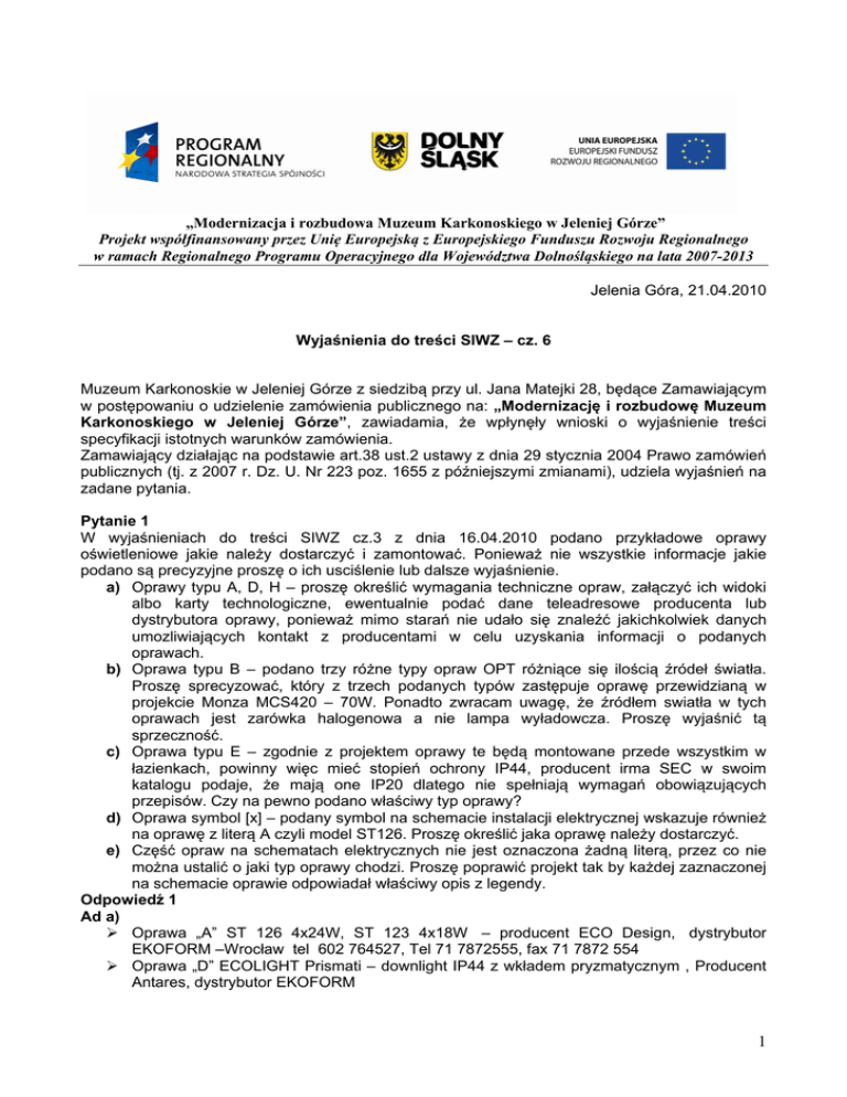 „Modernizacja i rozbudowa Muzeum Karkonoskiego w Jeleniej Górze” Projekt współfinansowany przez Unię Europejską z Europejskiego Funduszu Rozwoju Regionalnego w ramach Regionalnego Programu Operacyjnego dla Województwa Dolnośląskiego na lata 2007-2013 Jelenia Góra, 21.04.2010 Wyjaśnienia do treści SIWZ – cz. 6 Muzeum Karkonoskie w Jeleniej Górze z siedzibą przy ul. Jana Matejki 28, będące Zamawiającym w postępowaniu o udzielenie zamówienia publicznego na: „Modernizację i rozbudowę Muzeum Karkonoskiego w Jeleniej Górze”, zawiadamia, że wpłynęły wnioski o wyjaśnienie treści specyfikacji istotnych warunków zamówienia. Zamawiający działając na podstawie art.38 ust.2 ustawy z dnia 29 stycznia 2004 Prawo zamówień publicznych (tj. z 2007 r. Dz. U. Nr 223 poz. 1655 z późniejszymi zmianami), udziela wyjaśnień na zadane pytania. Pytanie 1 W wyjaśnieniach do treści SIWZ cz.3 z dnia 16.04.2010 podano przykładowe oprawy oświetleniowe jakie należy dostarczyć i zamontować. Ponieważ nie wszystkie informacje jakie podano są precyzyjne proszę o ich usciślenie lub dalsze wyjaśnienie. a) Oprawy typu A, D, H – proszę określić wymagania techniczne opraw, załączyć ich widoki albo karty technologiczne, ewentualnie podać dane teleadresowe producenta lub dystrybutora oprawy, ponieważ mimo starań nie udało się znaleźć jakichkolwiek danych umozliwiających kontakt z producentami w celu uzyskania informacji o podanych oprawach. b) Oprawa typu B – podano trzy różne typy opraw OPT różniące się ilością źródeł światła. Proszę sprecyzować, który z trzech podanych typów zastępuje oprawę przewidzianą w projekcie Monza MCS420 – 70W. Ponadto zwracam uwagę, że źródłem swiatła w tych oprawach jest zarówka halogenowa a nie lampa wyładowcza. Proszę wyjaśnić tą sprzeczność. c) Oprawa typu E – zgodnie z projektem oprawy te będą montowane przede wszystkim w łazienkach, powinny więc mieć stopień ochrony IP44, producent irma SEC w swoim katalogu podaje, że mają one IP20 dlatego nie spełniają wymagań obowiązujących przepisów. Czy na pewno podano właściwy typ oprawy? d) Oprawa symbol [x] – podany symbol na schemacie instalacji elektrycznej wskazuje również na oprawę z literą A czyli model ST126. Proszę określić jaka oprawę należy dostarczyć. e) Część opraw na schematach elektrycznych nie jest oznaczona żadną literą, przez co nie można ustalić o jaki typ oprawy chodzi. Proszę poprawić projekt tak by każdej zaznaczonej na schemacie oprawie odpowiadał właściwy opis z legendy. Odpowiedź 1 Ad a) ¾ Oprawa „A” ST 126 4x24W, ST 123 4x18W – producent ECO Design, dystrybutor EKOFORM –Wrocław tel 602 764527, Tel 71 7872555, fax 71 7872 554 ¾ Oprawa „D” ECOLIGHT Prismati – downlight IP44 z wkładem pryzmatycznym , Producent Antares, dystrybutor EKOFORM 1 ¾ Oprawa „H” GEA IP 67 żródło GU-10 max 50W regulowany kąt pochylenia – producent La Creu , dystrybutor EKOFORM Ad b) ¾ Oprawa OPT – producent CHORS, dystrybutor EKOFORM ¾ Oprawa powyższa występuje w kilku wariantach – z jednym, dwoma, czterema oraz większą ilością źródeł. Podstawowe wersje wyposażane są w źródła halogenowe typu QR111 oraz MR16. Na życzenie producent wykonuje te oprawy w wersji na źródło wyładowcze typu CDM-R . Wersja wyładowcza może wstępować w wariancie o mocy 35W ( pojedyncza lub podwójna ) oraz 70W ( pojedyncza lub podwójna). Sposób mocowania- na bazie do sufitu lub na adaptorze do szynoprzewodu. Na potrzeby oferty należy przyjąć – 1x70W. Ad c) W „Wyjaśnieniach 3 do SIWZ w Odpowiedzi 1 podano mylnie oprawę WEGA 2x18W firmy SEC , należy zastosować oprawę ROUNDY 360 2x18W IP 65 . Producent SPECTRA, dystrybutor EKOFORM Ad d) Należy przyjąć oprawę symbol „A” czyli oprawę ST 126. Symbol X oznacza awaryjne podtrzymanie opraw. Ad e) W przypadku braku literki przy symbolu oprawy, należy przyjąć oprawę analogiczną jak w pomieszczeniach sąsiadujących, oczywiście z uwzględnieniem charakteru pomieszczenia np. na parterze oprawa o symbolu „F” (pom magazynowe 20) – oprawa Mistral tak jak w pomieszczeniach 18 i 19 Podane w treści odpowiedzi nazwy własne należy traktować jako określenie paramentów technicznych i jakościowych oraz czytać jako „takie lub równoważne”. Dyrektor Muzeum Karkonoskiego w Jeleniej Górze /-/ Gabriela Zawiła 2