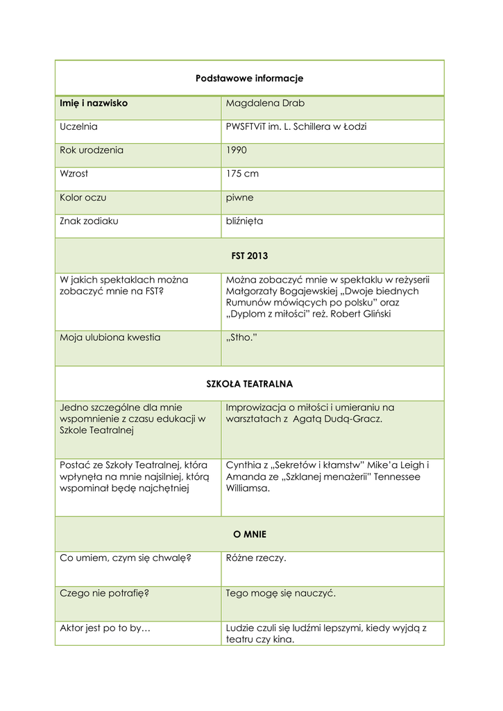 Podstawowe informacje Imię i nazwisko Magdalena Drab Uczelnia PWSFTViT im. L. Schillera w Łodzi Rok urodzenia 1990 Wzrost 175 cm Kolor oczu piwne Znak zodiaku bliźnięta FST 2013 W jakich spektaklach można zobaczyć mnie na FST? Można zobaczyć mnie w spektaklu w reżyserii Małgorzaty Bogajewskiej „Dwoje biednych Rumunów mówiących po polsku” oraz „Dyplom z miłości” reż. Robert Gliński Moja ulubiona kwestia „Stho.” SZKOŁA TEATRALNA Jedno szczególne dla mnie wspomnienie z czasu edukacji w Szkole Teatralnej Improwizacja o miłości i umieraniu na warsztatach z Agatą Dudą-Gracz. Postać ze Szkoły Teatralnej, która wpłynęła na mnie najsilniej, którą wspominał będę najchętniej Cynthia z „Sekretów i kłamstw” Mike’a Leigh i Amanda ze „Szklanej menażerii” Tennessee Williamsa. O MNIE Co umiem, czym się chwalę? Różne rzeczy. Czego nie potrafię? Tego mogę się nauczyć. Aktor jest po to by… Ludzie czuli się ludźmi lepszymi, kiedy wyjdą z teatru czy kina. Ja jestem aktorem bo… To bardzo piękny zawód, który daje mi (i mam nadzieję nie tylko mnie) bardzo wiele radości. W teatrze kocham… Atmosferę święta. I to, że można w nim realizować nawet najbardziej szalone pomysły, że na świat i człowieka patrzy się tam uważniej, czulej… Bardzo dużo rzeczy kocham w teatrze. MOJE PLANY Zawodowa propozycja nie do odrzucenia/ zawodowa propozycja konieczna do odrzucenia Rola u MIke’a Leigh/ sporo jest takich rzeczy, ale nie będę wymieniać, bo brzmią dosyć niesmacznie. Marzę o… Marzę o pracy w dobrym, ambitnym teatrze z ciekawymi ludźmi oraz realizowaniu swoich projektów teatralnych i filmowych. A poza tym marzę o wielu miłych niespodziankach, których sama nie mogłabym sobie wymyślić czy zaplanować.