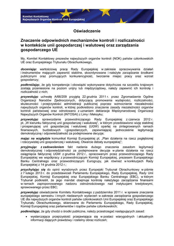 Oświadczenie Znaczenie odpowiednich mechanizmów kontroli i rozliczalności w kontekście unii gospodarczej i walutowej oraz zarządzania gospodarczego UE My, Komitet Kontaktowy prezesów najwyższych organów kontroli (NOK) państw członkowskich UE oraz Europejskiego Trybunału Obrachunkowego, doceniając wartościową pracę Rady Europejskiej w zakresie opracowywania działań i instrumentów mających zapewnić stabilne, skoordynowane i należyte zarządzanie środkami publicznymi oraz promujących konkurencyjność, tworzenie miejsc pracy oraz wzrost gospodarczy; podkreślając, że gdy kompetencje i obowiązki wykonywane dotychczas na szczeblu krajowym zostają przeniesione na poziom unijny lub międzyrządowy, należy zapewnić ich kontrolę i rozliczalność z nich; przywołując uchwałę A/66/209 przyjętą 22 grudnia 2011 r. przez Zgromadzenie Ogólne Organizacji Narodów Zjednoczonych, dotyczącą promowania wydajności, rozliczalności, skuteczności i przejrzystości administracji publicznej poprzez wzmocnienie niezależności najwyższych organów kontroli, w której podkreślono znaczenie zasady niezależności organów kontroli państwowej oraz odnotowano z uznaniem deklaracje Międzynarodowej Organizacji Najwyższych Organów Kontroli (INTOSAI) z Limy i Meksyku; przywołując sprawozdanie przewodniczącego Rady Europejskiej z czerwca 2012 r. pt. „W kierunku faktycznej unii gospodarczej i walutowej”, w którym przedstawiono wizję stabilnej i prosperującej unii gospodarczej i walutowej (UGW) opartej na zintegrowanych ramach finansowych, budżetowych i gospodarczych, zapewniającej jednocześnie legitymację demokratyczną i odpowiedzialność za podejmowane decyzje; mając na względzie komunikat Komisji Europejskiej pt. „Plan działania na rzecz pogłębionej i rzeczywistej unii gospodarczej i walutowej. Otwarcie debaty europejskiej”; przyjmując z zadowoleniem fakt nadania dużego znaczenia zasadom legitymacji demokratycznej i odpowiedzialności za podejmowane decyzje w planie działania na rzecz osiągnięcia faktycznej UGW z grudnia 2012 r., opracowanym przez przewodniczącego Rady Europejskiej we współpracy z przewodniczącym Komisji Europejskiej, prezesem Europejskiego Banku Centralnego oraz przewodniczącym Eurogrupy, jak również w konkluzjach Rady Europejskiej z 14 grudnia 2012 r.; przychylając się do opinii wyrażonych przez Europejski Trybunał Obrachunkowy w piśmie z 7 lutego 2013 r. do przedstawicieli Parlamentu Europejskiego, Rady Europejskiej, Rady Unii Europejskiej, Komisji Europejskiej oraz Europejskiego Banku Centralnego (EBC), w którym Trybunał podkreślił, że jego mandat obejmuje kontrolę należytego zarządzania finansami w ramach zaproponowanego nadzoru ostrożnościowego nad instytucjami kredytowymi, sprawowanego przez EBC; przywołując oświadczenie Komitetu Kontaktowego z października 2011 r. w sprawie znaczenia europejskiego semestru i innych niedawnych wydarzeń w zakresie zarządzania gospodarczego UE dla najwyższych organów kontroli państw członkowskich Unii Europejskiej oraz Europejskiego Trybunału Obrachunkowego, skierowane do Parlamentu Europejskiego, Rady Europejskiej, Komisji Europejskiej oraz parlamentów i rządów państw członkowskich; podkreślając, że gdy chodzi o środki publiczne, należy przestrzegać następujących zasad: • wystarczająca przejrzystość przejawiająca się w postaci wiarygodnych i aktualnych informacji dających prawdziwy i rzetelny obraz rozliczeń; • odpowiednia rozliczalność, w tym publiczna kontrola działań odpowiedzialności osób odpowiedzialnych za zarządzanie procesami; i pociąganie do • odpowiednia publiczna kontrola zewnętrzna pozwalająca uzyskać pewność i informacje na temat pozyskiwania i wykorzystania środków publicznych oraz ryzyka, na jakie są one narażone, zgodnie z międzynarodowymi standardami kontroli (ISSAI); Uznajemy, że: Dyskusje na forum Rady Europejskiej w czerwcu 2013 r. na temat planu działania będą stanowić ważną okazję do zabezpieczenia i wzmocnienia publicznej kontroli zewnętrznej oraz rozliczalności w kontekście ukończenia tworzenia UGW, unii bankowej oraz wzmocnionej koordynacji polityki gospodarczej, zwłaszcza poprzez: • Stworzenie jednolitych zasad ramowych w zakresie kontroli i rozliczalności Parlament Europejski i parlamenty krajowe są nieodzowne w procesie ustawodawczym i rozliczalności, w związku z czym należy zadbać, by ich rola w tym zakresie i ich wzajemne stosunki pozostały zachowane. Jeśli chodzi o proces ustawodawczy w UE, należy zadbać, by łańcuchy odpowiedzialności na poziomie krajowym i unijnym oraz stosunki pomiędzy najwyższymi organami kontroli i parlamentami krajowymi pozostały zachowane, zgodnie z zapisami konstytucji krajowych. • Uznanie znaczenia publicznej kontroli zewnętrznej w prawodawstwie UE Niezależna i odpowiednia kontrola zewnętrzna na szczeblu unijnym i krajowym jest niezbędna, gdyż pozwala prawodawcom i obywatelom uzyskać pewność oraz dostarcza informacji na temat zgodnego z prawem, skutecznego, wydajnego i oszczędnego wykorzystania finansów publicznych oraz realizacji polityk. Przepisy europejskie mające wpływ na publiczną kontrolę zewnętrzną powinny być regulowane wyłącznie za pomocą unijnych aktów ustawodawczych wymagających procesu konsultacyjnego, zgodnie z zapisami Traktatu o funkcjonowaniu Unii Europejskiej. • Wzmocnienie mechanizmów kontroli w kontekście unii bankowej Komitet Kontaktowy podkreśla znaczenie objęcia kontrolą o wystarczającym zasięgu nadzoru ostrożnościowego nad instytucjami kredytowymi w ramach proponowanej unii bankowej. Komitet Kontaktowy podkreśla również potrzebę zapewnienia wydajnej, przejrzystej i kompleksowej kontroli instytucji sprawujących taki nadzór na szczeblu krajowym i europejskim. • Uwzględnienie mechanizmów kontroli w obszarze dyscypliny fiskalnej Komitet Kontaktowy wzywa do komplekso