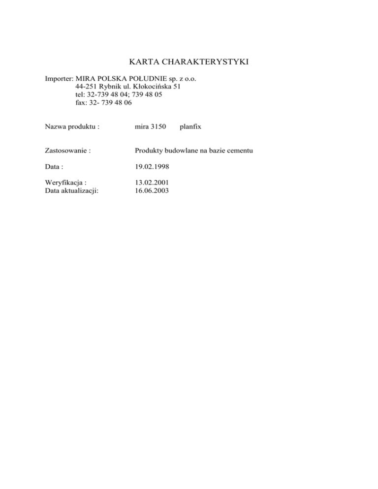 KARTA CHARAKTERYSTYKI Importer: MIRA POLSKA POŁUDNIE sp. z o.o. 44-251 Rybnik ul. Kłokocińska 51 tel: 32-739 48 04; 739 48 05 fax: 32- 739 48 06 Nazwa produktu : mira 3150 planfix Zastosowanie : Produkty budowlane na bazie cementu Data : 19.02.1998 Weryfikacja : Data aktualizacji: 13.02.2001 16.06.2003 1. Identyfikacja substancji/preparatu: mira 3150 planfix 2. Skład / Informacje o składnikach: Nazwa składnika Zawartość % Cement 5 – 30 Piasek kwarcowy płukany ( <2% kwarcu oddychającego) 50 - 90 Szary cement glinianowy 5 – 40 Polimery plastyczne 1–7 Klasyfikacja Xi ; R37/38-41 Xi; R37/38-41 3. Identyfikacja zagrożenia Produkt zawiera cement , który powoduje podrażnienie skóry ( zwłaszcza w połączeniu z wodą) oraz podrażnienie dróg oddechowych. 4. Pierwsza pomoc w przypadku : Wdychania : Przenieść się na świeże powietrze. Jeśli objawy nie zanikną należy skontaktować się z lekarzem. Kontaktu ze skórą: Należy zdjąć zakażone ubrania . Przemyć skórę wodą z mydłem . Po umyciu posmarować tłustym kremem. Jeśli objawy nie zanikną należy skontaktować się z lekarzem. Kontaktu z oczami : Przemywać intensywnie wodą przez co najmniej 15 minut. Jeśli objawy nie zanikną należy skontaktować się z lekarzem. Połknięciu : Nie powodować wymiotów. Napić się wody lub mleka i natychmiast skontaktować się z lekarzem. 5.Postępowanie w przypadku pożaru: Produkt nie jest palny. 6.Postępowanie w przypadku niezamierzonego uwolnienia do środowiska : Dużą ilość rozsypanego produktu należy usunąć odkurzaczem.. Należy unikać rozprzestrzeniania się pyłu. Pozbywanie się produktu musi odbywać się zgodnie z miejscowymi przepisami. Patrz część 8 i 13. 7. Postępowanie z substancją /preparatem i jego magazynowanie : Należy unikać kontaktu z produktem ,zwłaszcza po zmieszaniu z wodą. Stosować rękawice ochronne. Patrz punkt 8. Jeśli podczas pracy powstaje pył zastosuj atestowaną ochronę dróg oddechowych. Produkt należy przechowywać w oryginalnych zamkniętych opakowaniach w miejscu niedostępnym dla dzieci. Otwarte opakowanie należy jak najszybciej zużyć. 8.Kontrola narażenia i środki ochrony indywidualnej: Następujące składniki mają progowe ograniczenie wartości (TLV) Pył kwarcowy – całkowity 0,3 mg/m3 Pył kwarcowy – oddychający 0,1 mg/m3 Jeśli zaistnieje taka potrzeba , polecamy zastosować następującą ochronę osobistą : Ochrona dróg oddechowych: Półmaska gumowa /Filtr-P2 Rękawice: Gumowe lub PCV Ochrona oczu: Okulary/osłona 9.Właściwości fizyczne i chemiczne : Wygląd Zapach : pH Punkt wrzenia Punkt topnienia : Prężność pary : (20 C) gęstość względna : Pył - Rozpuszczalność – woda: n-oktanol/ współczynnik wodny temperatura zapłonu Samozapłon: Właściwości wybuchowe Lepkość Inne dane - -: oznacz że dane nie istnieją lub są nieistotne 10. Stabilność i Reaktywność. W kontakcie z silnymi kwasami wydziela się dwutlenek węgla i produkt traci swoją zdolność twardnienia .Utwardza się w kontakcie z wodą. 11.Informacje toksykologiczne: Wdychanie : Wdychanie pyłu wywołuje silne podrażnienie nosa, gardła i dróg oddechowych. Kontakt ze skórą : Kontakt ze skórą wywołuje silne podrażnienie z ryzykiem wystąpienia owrzodzenia , zwłaszcza po zmieszaniu z wodą. Kontakt z oczami: Silne podrażnienie oczu z ryzykiem poważnego uszkodzenia wzroku. Połykanie : Wywołuje poważne podrażnienie lub działa żrąco na żołądek i jelita. 12.Informacje ekologiczne : Nie istnieją adekwatne dane ekologiczne które umożliwiłyby klasyfikacje składników wobec środowiska. 13. Postępowanie z odpadami: Pozbywanie się produktu musi odbywać się zgodnie z przepisami krajowymi. Transportowanie jako odpad. Patrz część 14. 14. Informacje o transporcie : Produkt jest bezpieczny podczas transportu 15. Informacje dotyczące przepisów prawnych: Oznakowanie ostrzegawcze na pojemnikach ( klasyfikacja produktu): Drażniący dla układu oddechowego i skóry ( R37/38) Ryzyko poważnego uszkodzenia wzroku( R41) X xi Przechowywać w miejscu niedostępnym dla dzieci (S2) środek drażniący W przypadku kontaktu z oczami natychmiast płukać dużą ilością wody i zwrócić się o pomoc do lekarza (S 26) Należy stosować ochronę oczu i twarzy ( S 39) Jeśli zostanie połknięty , należy natychmiast skontaktować się z lekarzem oraz Pokazać to opakowanie lub oznakowanie (S 46) Ograniczenia w stosowaniu : nie ma Wymagane specjalne wykształcenie / szkolenie : nie wymagane 16.Inne informacje Zweryfikowano stronę czołową i str.2