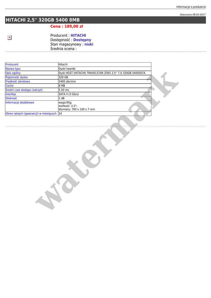Informacje o produkcie Utworzono 08-03-2017 HITACHI 2,5" 320GB 5400 8MB Cena : 189,00 zł Producent : HITACHI Dostępność : Dostępny Stan magazynowy : niski Średnia ocena : er m ar k Hitachi Dyski twarde Dysk HGST (HITACHI) TRAVELSTAR Z5K5 2.5'' 7.0 320GB 5400SATA 320 GB 5400 obr/min 8 MB 5.50 ms SATA II (3 Gb/s) 2 dB waga:95g; wielkość: 2,5"; Wymiary: 700 x 100 x 7 mm Okres rękojmi (gwarancji) w miesiącach 24 w at Producent Nazwa typu Opis ogólny Pojemność dysku Prędkość obrotowa Cache Średni czas dostępu (odczyt) Interfejs Głośność Informacje dodatkowe
