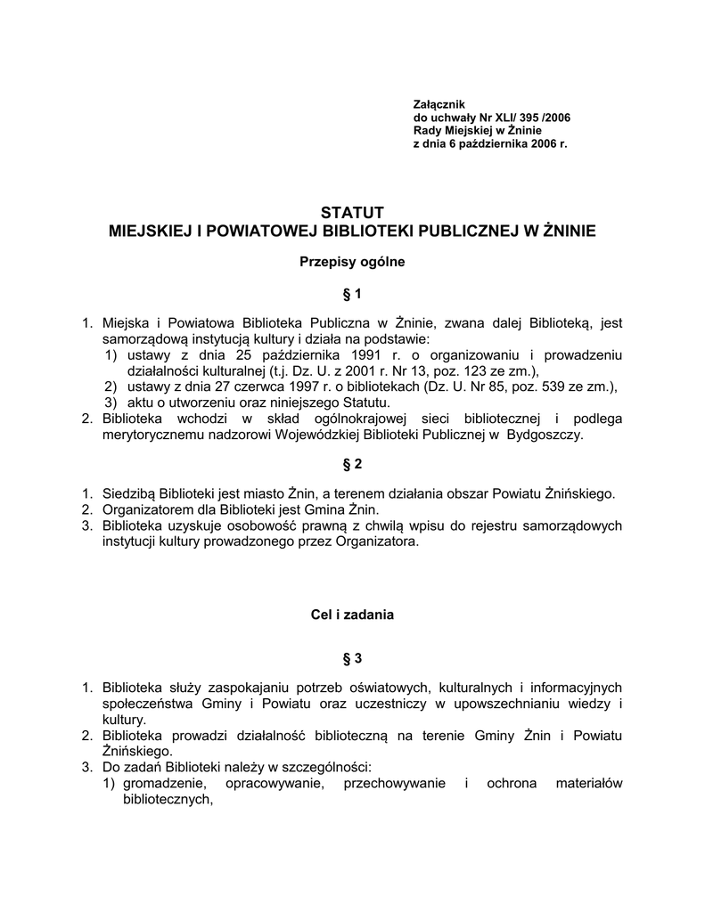Załącznik do uchwały Nr XLI/ 395 /2006 Rady Miejskiej w Żninie z dnia 6 października 2006 r. STATUT MIEJSKIEJ I POWIATOWEJ BIBLIOTEKI PUBLICZNEJ W ŻNINIE Przepisy ogólne §1 1. Miejska i Powiatowa Biblioteka Publiczna w Żninie, zwana dalej Biblioteką, jest samorządową instytucją kultury i działa na podstawie: 1) ustawy z dnia 25 października 1991 r. o organizowaniu i prowadzeniu działalności kulturalnej (t.j. Dz. U. z 2001 r. Nr 13, poz. 123 ze zm.), 2) ustawy z dnia 27 czerwca 1997 r. o bibliotekach (Dz. U. Nr 85, poz. 539 ze zm.), 3) aktu o utworzeniu oraz niniejszego Statutu. 2. Biblioteka wchodzi w skład ogólnokrajowej sieci bibliotecznej i podlega merytorycznemu nadzorowi Wojewódzkiej Biblioteki Publicznej w Bydgoszczy. §2 1. Siedzibą Biblioteki jest miasto Żnin, a terenem działania obszar Powiatu Żnińskiego. 2. Organizatorem dla Biblioteki jest Gmina Żnin. 3. Biblioteka uzyskuje osobowość prawną z chwilą wpisu do rejestru samorządowych instytucji kultury prowadzonego przez Organizatora. Cel i zadania §3 1. Biblioteka służy zaspokajaniu potrzeb oświatowych, kulturalnych i informacyjnych społeczeństwa Gminy i Powiatu oraz uczestniczy w upowszechnianiu wiedzy i kultury. 2. Biblioteka prowadzi działalność biblioteczną na terenie Gminy Żnin i Powiatu Żnińskiego. 3. Do zadań Biblioteki należy w szczególności: 1) gromadzenie, opracowywanie, przechowywanie i ochrona materiałów bibliotecznych, 2) obsługa użytkowników, przede wszystkim udostępnianie zbiorów oraz prowadzenie działalności informacyjnej, zwłaszcza informowanie o zbiorach własnych, innych bibliotek, muzeów i ośrodków informacji naukowej, a także współdziałanie z archiwami w tym zakresie, 3) dobór materiałów bibliotecznych dla bibliotek publicznych w obrębie Gminy oraz ich opracowanie, 4) udostępnianie zbiorów na miejscu, wypożyczanie na zewnątrz, prowadzenie wymiany międzybibliotecznej, 5) organizowanie czytelnictwa i udostępnianie materiałów bibliotecznych mieszkańcom Gminy i Powiatu, 6) współdziałanie z innymi bibliotekami i instytucjami kultury w zakresie rozwijania czytelnictwa i zaspokajania potrzeb oświatowych i kulturalnych społeczności Gminy, 7) tworzenie i udostępnianie baz danych katalogowych, bibliograficznych i faktograficznych, 8) organizowanie i prowadzenie różnych form pracy z czytelnikiem, służących popularyzacji książki, sztuki i nauki oraz upowszechnianiu dorobku kulturalnego gminy. 4. Biblioteka współpracuje z innymi bibliotekami, instytucjami kultury, podmiotami prowadzącymi działalność kulturalną, stowarzyszeniami i związkami twórców i artystów oraz organami władz publicznych zajmujących się działalnością kulturalną. Organy biblioteki i jej organizacja §4 1. Organem zarządzającym Biblioteki jest Dyrektor. 2. Dyrektor kieruje całością działalności Biblioteki i reprezentuje ją na zewnątrz. 3. Dyrektor jest przełożonym pracowników Biblioteki i wykonuje wobec nich czynności z zakresu prawa pracy. §5 1. Dyrektora powołuje i odwołuje Burmistrz Żnina, zgodnie z ustawą z dnia 25 października 1991 r. o organizowaniu i prowadzeniu działalności kulturalnej. 2. Dyrektor może być wyłoniony w drodze konkursu. O przeprowadzeniu konkursu decyduje Burmistrz Żnina. Regulamin konkursu ustala Burmistrz Żnina. 3. Burmistrz Żnina może powierzyć zarządzanie Biblioteką osobie fizycznej lub prawnej, zgodnie z ustawą, o której mowa w ust. 1. Do osoby, której powierzono zarządzanie ośrodkiem stosuje się odpowiednio postanowienia dotyczące Dyrektora. 4. Burmistrz Żnina wykonuje wobec Dyrektora czynności z zakresu prawa pracy oraz jest jego zwierzchnikiem służbowym. Gospodarka finansowa §6 1. Biblioteka gospodaruje samodzielnie przydzieloną i nabytą częścią mienia oraz prowadzi samodzielną gospodarkę w ramach posiadanych środków, kierując się zasadami efektywności ich wykorzystania. 2. Biblioteka otrzymuje z budżetu Gminy oraz Powiatu corocznie dotację na działalność w wysokości niezbędnej na pokrycie kosztów działalności, w tym w szczególności na: a) wyposażenie, b) prowadzenie działalności bibliotecznej, zwłaszcza zakup materiałów bibliotecznych, c) doskonalenie zawodowe pracowników, d) wynagrodzenia pracowników, e) utrzymanie i eksploatację majątku. 3. Biblioteka może uzyskiwać środki finansowe z: - wpływów, o których mowa w § 8 ust. 2, - dotacji z budżetu państwa, - wpływów z najmu i dzierżawy składników majątku, - spadków, zapisów i darowizn od osób fizycznych i prawnych, - innych źródeł. 4. Podstawą gospodarki finansowej Biblioteki jest plan działalności zatwierdzony przez Dyrektora. 5. Biblioteka pokrywa koszty bieżącej działalności i zobowiązania z uzyskiwanych przychodów. Postanowienia końcowe §7 1. Podstawą działalności Biblioteki jest roczny program działalności ustalany przez Dyrektora. 2. Program obejmuje najważniejsze zamierzenia i przedsięwzięcia do zrealizowania w danym roku. 3. Biblioteka wykonuje także zadania z zakresu organizowania działalności kulturalnej polecone przez Organizatora. §8 1. Usługi Biblioteki są ogólnie dostępne i bezpłatne, z zastrzeżeniem ust. 2. 2. Biblioteka może pobierać opłaty: 1) za usługi informacyjne, bibliograficzne, reprograficzne oraz wypożyczenia międzybiblioteczne, 2) za wypożyczenia materiałów audiowizualnych, 3) w formie kaucji za wypożyczone materiały biblioteczne, 4) za niezwrócenie w terminie wypożyczonych materiałów bibliotecznych, 5) za uszkodzenie, zniszczenie lub niezwrócenie materiałów bibliotecznych. 3. Wysokość opłat, o których mowa w ust. 2 pkt 1 i 2, nie może przekraczać kosztów wykonania usługi. 4. Wysokość opłat, o których mowa w ust. 2 ustala się w Regulaminie Biblioteki. §9 1. Biblioteka swoje zadania wykonuje w siedzibie głównej w Żninie. 2. Poza siedzibą główną dodatkowo funkcjonują filie Bibli