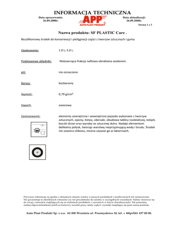 INFORMACJA TECHNICZNA Data opracowania: 26.09.2008r. Data aktualizacji: 26.09.2008r. Strona 1 z 3 Nazwa produktu: SF PLASTIC Care . Bezsilikonowy środek do konserwacji i pielęgnacji części z tworzyw sztucznych i gumy Opakowanie: 1.0 L; 5.0 L. Podstawowe składniki: Niskowrząca frakcja naftowa obrabiana wodorem. pH: nie oznaczono Barwa: bezbarwny Gęstość: 0,79 g/cm³ Zapach: owocowy Zastosowanie: elementy zewnętrzne i wewnętrzne pojazdu wykonane z tworzyw sztucznych, opony, listwy, zderzaki, obudowa tablicy rozdzielczej, kokpit, boczki drzwi oraz wyroby ze sztucznej skóry. Nadaje elementom delikatny połysk, tworząc warstwę nieprzyjmującą wody i brudu. Środek nie zawiera silikonu, można używać go w lakierniach. Powyższe informacje są zgodne z aktualnym stanem wiedzy o naszych produktach i możliwościach ich zastosowania. Nie gwarantuje to określonych własności czy też przydatności do użytku w szczególnych warunkach. Należy stosować się do uwag i ostrzeżeń znajdujących się na etykietach produktów i zawartych w karcie charakterystyki. Nie ponosimy żadnej odpowiedzialności jeżeli na końcowy rezultat pracy miały wpływ czynniki znajdujące się poza naszą kontrolą. Auto Plast Produkt Sp. z o.o. 62-300 Września ul. Przemysłowa 10, tel. + 48(prf)61 437 00 00. INFORMACJA TECHNICZNA Data opracowania: 26.09.2008r. Data aktualizacji: 26.09.2008r. Strona 2 z 3 Nazwa produktu: SF PLASTIC Care . Sposób użycia: nanieść na wcześniej wyczyszczone powierzchnie za pomocą spryskiwacza lub miękkiej ściereczki i lekko wetrzeć. Nałożony środek wysycha w krótkim czasie. Ograniczenia: środka nie stosować na mocno rozgrzane powierzchnie. Nie nakładać na koło kierownicy, dźwignię lewarka zmiany biegów, nakładki pedałów. Czyszczenie sprzętu: rozpuszczalniki organiczne. Magazynowanie: przechowywać w zamkniętych oryginalnych opakowaniach w pomieszczeniu suchym i dobrze wentylowanym. Chronić przed zmrożeniem. Przepisy BHP: wyłącznie do zastosowań profesjonalnych. Patrz: tekst zawarty na etykietach produktu lub w karcie charakterystyki produktu niebezpiecznego. Użytkownik musi stosować się do przepisów BHP obowiązujących na Powyższe informacje są zgodne z aktualnym stanem wiedzy o naszych produktach i możliwościach ich zastosowania. Nie gwarantuje to określonych własności czy też przydatności do użytku w szczególnych warunkach. Należy stosować się do uwag i ostrzeżeń znajdujących się na etykietach produktów i zawartych w karcie charakterystyki. Nie ponosimy żadnej odpowiedzialności jeżeli na końcowy rezultat pracy miały wpływ czynniki znajdujące się poza naszą kontrolą. Auto Plast Produkt Sp. z o.o. 62-300 Września ul. Przemysłowa 10, tel. + 48(prf)61 437 00 00. INFORMACJA TECHNICZNA Data opracowania: 26.09.2008r. Data aktualizacji: 26.09.2008r. Strona 3 z 3 Nazwa produktu: SF PLASTIC Care . terenie danego kraju. Zagrożenia: patrz Karta Charakterystyki Powyższe informacje są zgodne z aktualnym stanem wiedzy o naszych produktach i możliwościach ich zastosowania. Nie gwarantuje to określonych własności czy też przydatności do użytku w szczególnych warunkach. Należy stosować się do uwag i ostrzeżeń znajdujących się na etykietach produktów i zawartych w karcie charakterystyki. Nie ponosimy żadnej odpowiedzialności jeżeli na końcowy rezultat pracy miały wpływ czynniki znajdujące się poza naszą kontrolą. Auto Plast Produkt Sp. z o.o. 62-300 Września ul. Przemysłowa 10, tel. + 48(prf)61 437 00 00.