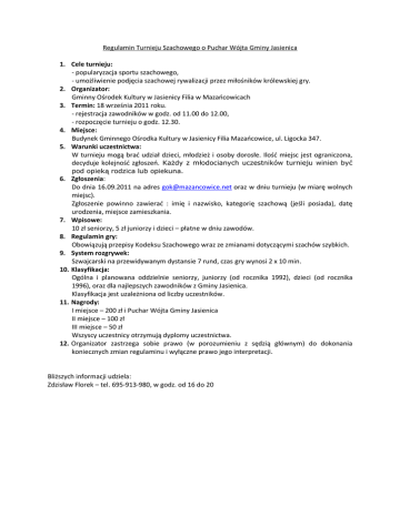 Regulamin Turnieju Szachowego o Puchar Wójta Gminy Jasienica 1. Cele turnieju: - popularyzacja sportu szachowego, - umożliwienie podjęcia szachowej rywalizacji przez miłośników królewskiej gry. 2. Organizator: Gminny Ośrodek Kultury w Jasienicy Filia w Mazańcowicach 3. Termin: 18 września 2011 roku. - rejestracja zawodników w godz. od 11.00 do 12.00, - rozpoczęcie turnieju o godz. 12.30. 4. Miejsce: Budynek Gminnego Ośrodka Kultury w Jasienicy Filia Mazańcowice, ul. Ligocka 347. 5. Warunki uczestnictwa: W turnieju mogą brać udział dzieci, młodzież i osoby dorosłe. Ilość miejsc jest ograniczona, decyduje kolejność zgłoszeń. Każdy z młodocianych uczestników turnieju winien być pod opieką rodzica lub opiekuna. 6. Zgłoszenia: Do dnia 16.09.2011 na adres [email protected] oraz w dniu turnieju (w miarę wolnych miejsc). Zgłoszenie powinno zawierać : imię i nazwisko, kategorię szachową (jeśli posiada), datę urodzenia, miejsce zamieszkania. 7. Wpisowe: 10 zł seniorzy, 5 zł juniorzy i dzieci – płatne w dniu zawodów. 8. Regulamin gry: Obowiązują przepisy Kodeksu Szachowego wraz ze zmianami dotyczącymi szachów szybkich. 9. System rozgrywek: Szwajcarski na przewidywanym dystansie 7 rund, czas gry wynosi 2 x 10 min. 10. Klasyfikacja: Ogólna i planowana oddzielnie seniorzy, juniorzy (od rocznika 1992), dzieci (od rocznika 1996), oraz dla najlepszych zawodników z Gminy Jasienica. Klasyfikacja jest uzależniona od liczby uczestników. 11. Nagrody: I miejsce – 200 zł i Puchar Wójta Gminy Jasienica II miejsce – 100 zł III miejsce – 50 zł Wszyscy uczestnicy otrzymują dyplomy uczestnictwa. 12. Organizator zastrzega sobie prawo (w porozumieniu z sędzią głównym) do dokonania koniecznych zmian regulaminu i wyłączne prawo jego interpretacji. Bliższych informacji udziela: Zdzisław Florek – tel. 695-913-980, w godz. od 16 do 20