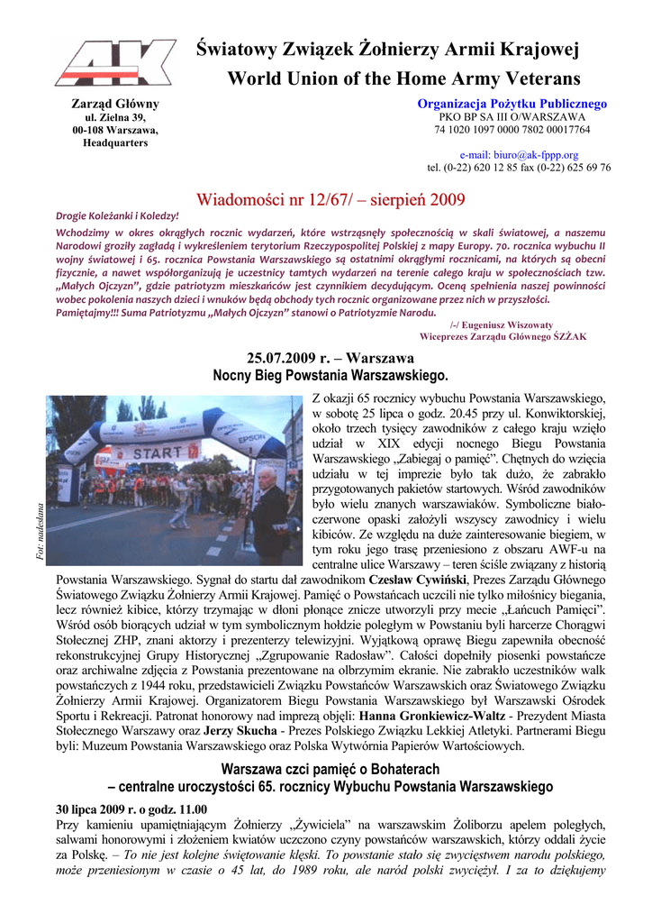 Światowy Związek Żołnierzy Armii Krajowej World Union of the Home Army Veterans Zarząd Główny Organizacja Pożytku Publicznego ul. Zielna 39, 00-108 Warszawa, Headquarters PKO BP SA III O/WARSZAWA 74 1020 1097 0000 7802 00017764 e-mail: [email protected] tel. (0-22) 620 12 85 fax (0-22) 625 69 76 Wiadomości nr 12/67/ – sierpień 2009 Drogie Koleżanki i Koledzy! Wchodzimy w okres okrągłych rocznic wydarzeń, które wstrząsnęły społecznością w skali światowej, a naszemu Narodowi groziły zagładą i wykreśleniem terytorium Rzeczypospolitej Polskiej z mapy Europy. 70. rocznica wybuchu II wojny światowej i 65. rocznica Powstania Warszawskiego są ostatnimi okrągłymi rocznicami, na których są obecni fizycznie, a nawet współorganizują je uczestnicy tamtych wydarzeń na terenie całego kraju w społecznościach tzw. „Małych Ojczyzn”, gdzie patriotyzm mieszkańców jest czynnikiem decydującym. Oceną spełnienia naszej powinności wobec pokolenia naszych dzieci i wnuków będą obchody tych rocznic organizowane przez nich w przyszłości. Pamiętajmy!!! Suma Patriotyzmu „Małych Ojczyzn” stanowi o Patriotyzmie Narodu. /-/ Eugeniusz Wiszowaty Wiceprezes Zarządu Głównego ŚZŻAK Fot: nadesłana 25.07.2009 r. – Warszawa Nocny Bieg Powstania Warszawskiego. Z okazji 65 rocznicy wybuchu Powstania Warszawskiego, w sobotę 25 lipca o godz. 20.45 przy ul. Konwiktorskiej, około trzech tysięcy zawodników z całego kraju wzięło udział w XIX edycji nocnego Biegu Powstania Warszawskiego „Zabiegaj o pamięć”. Chętnych do wzięcia udziału w tej imprezie było tak dużo, że zabrakło przygotowanych pakietów startowych. Wśród zawodników było wielu znanych warszawiaków. Symboliczne białoczerwone opaski założyli wszyscy zawodnicy i wielu kibiców. Ze względu na duże zainteresowanie biegiem, w tym roku jego trasę przeniesiono z obszaru AWF-u na centralne ulice Warszawy – teren ściśle związany z historią Powstania Warszawskiego. Sygnał do startu dał zawodnikom Czesław Cywiński, Prezes Zarządu Głównego Światowego Związku Żołnierzy Armii Krajowej. Pamięć o Powstańcach uczcili nie tylko miłośnicy biegania, lecz również kibice, którzy trzymając w dłoni płonące znicze utworzyli przy mecie „Łańcuch Pamięci”. Wśród osób biorących udział w tym symbolicznym hołdzie poległym w Powstaniu byli harcerze Chorągwi Stołecznej ZHP, znani aktorzy i prezenterzy telewizyjni. Wyjątkową oprawę Biegu zapewniła obecność rekonstrukcyjnej Grupy Historycznej „Zgrupowanie Radosław”. Całości dopełniły piosenki powstańcze oraz archiwalne zdjęcia z Powstania prezentowane na olbrzymim ekranie. Nie zabrakło uczestników walk powstańczych z 1944 roku, przedstawicieli Związku Powstańców Warszawskich oraz Światowego Związku Żołnierzy Armii Krajowej. Organizatorem Biegu Powstania Warszawskiego był Warszawski Ośrodek Sportu i Rekreacji. Patronat honorowy nad imprezą objęli: Hanna Gronkiewicz-Waltz - Prezydent Miasta Stołecznego Warszawy oraz Jerzy Skucha - Prezes Polskiego Związku Lekkiej Atletyki. Partnerami Biegu byli: Muzeum Powstania Warszawskiego oraz Polska Wytwórnia Papierów Wartościowych. Warszawa czci pamięć o Bohaterach – centralne uroczystości 65. rocznicy Wybuchu Powstania Warszawskiego 30 lipca 2009 r. o godz. 11.00 Przy kamieniu upamiętniającym Żołnierzy „Żywiciela” na warszawskim Żoliborzu apelem poległych, salwami honorowymi i złożeniem kwiatów uczczono czyny powstańców warszawskich, którzy oddali życie za Polskę. – To nie jest kolejne świętowanie klęski. To powstanie stało się zwycięstwem narodu polskiego, może przeniesionym w czasie o 45 lat, do 1989 roku, ale naród polski zwyciężył. I za to dziękujemy powstańcom. Chylimy czoła przed wam. - tymi słowami zwrócił się do zebranych zastępca burmistrza Żoliborza, Michał Jakubowski. W uroczystości wzięli udział Prezes Stowarzyszenia Środowiska Żołnierzy AK „Żywiciel” Janusz Tyman, reprezentanci środowisk kombatanckich, uczestnicy powstania, przedstawiciele władz Miasta i Dzielnicy Żoliborz, Instytutu Pamięci Narodowej, Muzeum Powstania Warszawskiego oraz harcerze i mieszkańcy stolicy. Wieczorem na dziedzińcu Stołecznego Ratusza przy pl. Bankowym, Prezydent Warszawy Hanna Gronkiewicz-Waltz wspólnie z setkami kombatantów z kraju i zagranicy, wysłuchała dedykowanego im widowiska pt.: „Zakazane piosenki”. Na spektakl złożyły się najsławniejsze utwory okresu okupacji i Powstania m.in. z porywającym „Marszem Mokotowa” i „Hej, chłopcy, bagnet na broń”. Na kilku scenach rozstawionych na dziedzińcu aktorzy odgrywali scenki z życia stolicy okresu okupacji. Fot: Alina Nowacka W piątek, 31 lipca na Zamku Królewskim w Warszawie odbyła się uroczysta sesja Rady Miasta Stołecznego Warszawy zwołana z okazji Dnia Pamięci Warszawy, podczas której wręczono akty nadania Honorowego Obywatelstwa Miasta Stołecznego Warszawy. Wręczeń dokonały: Hanna Gronkiewicz-Waltz Prezydent m.st. Warszawy i Ewa Malinowska-Grupińska Przewodnicząca Rady Miasta. M.in. tytuł Honorowego Obywatela Miasta Stołecznego Warszawy otrzymał pośmiertnie Rotmistrz Witold Pilecki. Tradycyjnie już o godz. 18.00 przy Pomniku Powstania Warszawskiego na Placu Krasińskich miała miejsce uroczysta polowa Msza Święta z udziałem powstańców i najwyższych władz państwowych. Eucharystii, koncelebrowanej przez liczne grono biskupów i kapłanów, przewodniczył Prymas Kardynał Józef Glemp. Słowo powitania skierował do obecnych Biskup Polowy WP gen. dyw. Tadeusz Płoski, a homilię wygłosił metropolita warszawski abp Kazimierz Nycz. Po zakończonej Eucharystii przemówienia okolicznościowe wygłosili: gen. bryg. Zbigniew Ścibor-Rylski – Prezes Związku Powstańców Warszawskich, prof. Lech Kaczyński – Prezydent Rzeczypospolitej Polskiej, Czesław Cywiński – Prezes ZG Światowego