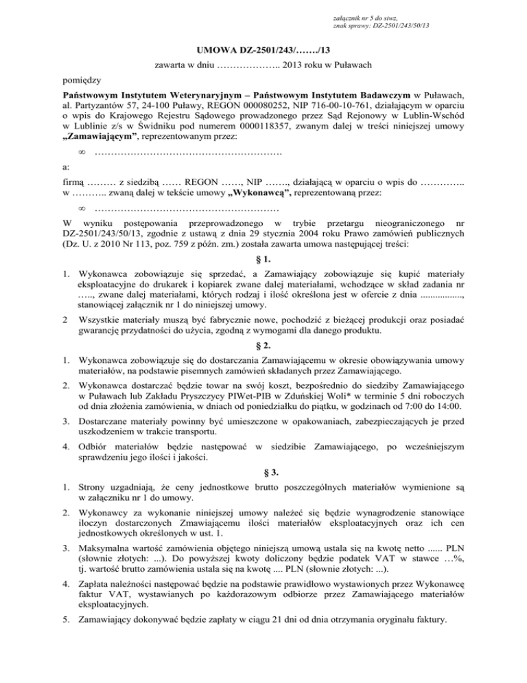 załącznik nr 5 do siwz, znak sprawy: DZ-2501/243/50/13 UMOWA DZ-2501/243/……./13 zawarta w dniu ……………….. 2013 roku w Puławach pomiędzy Państwowym Instytutem Weterynaryjnym – Państwowym Instytutem Badawczym w Puławach, al. Partyzantów 57, 24-100 Puławy, REGON 000080252, NIP 716-00-10-761, działającym w oparciu o wpis do Krajowego Rejestru Sądowego prowadzonego przez Sąd Rejonowy w Lublin-Wschód w Lublinie z/s w Świdniku pod numerem 0000118357, zwanym dalej w treści niniejszej umowy „Zamawiającym”, reprezentowanym przez: • …………………………………………………. a: firmą ……… z siedzibą …… REGON ……, NIP ……., działającą w oparciu o wpis do ………….. w ……….. zwaną dalej w tekście umowy „Wykonawcą”, reprezentowaną przez: • ………………………………………………… W wyniku postępowania przeprowadzonego w trybie przetargu nieograniczonego nr DZ-2501/243/50/13, zgodnie z ustawą z dnia 29 stycznia 2004 roku Prawo zamówień publicznych (Dz. U. z 2010 Nr 113, poz. 759 z późn. zm.) została zawarta umowa następującej treści: § 1. 1. Wykonawca zobowiązuje się sprzedać, a Zamawiający zobowiązuje się kupić materiały eksploatacyjne do drukarek i kopiarek zwane dalej materiałami, wchodzące w skład zadania nr ….., zwane dalej materiałami, których rodzaj i ilość określona jest w ofercie z dnia ................., stanowiącej załącznik nr 1 do niniejszej umowy. 2 Wszystkie materiały muszą być fabrycznie nowe, pochodzić z bieŜącej produkcji oraz posiadać gwarancję przydatności do uŜycia, zgodną z wymogami dla danego produktu. § 2. 1. Wykonawca zobowiązuje się do dostarczania Zamawiającemu w okresie obowiązywania umowy materiałów, na podstawie pisemnych zamówień składanych przez Zamawiającego. 2. Wykonawca dostarczać będzie towar na swój koszt, bezpośrednio do siedziby Zamawiającego w Puławach lub Zakładu Pryszczycy PIWet-PIB w Zduńskiej Woli* w terminie 5 dni roboczych od dnia złoŜenia zamówienia, w dniach od poniedziałku do piątku, w godzinach od 7:00 do 14:00. 3. Dostarczane materiały powinny być umieszczone w opakowaniach, zabezpieczających je przed uszkodzeniem w trakcie transportu. 4. Odbiór materiałów będzie następować w siedzibie Zamawiającego, po wcześniejszym sprawdzeniu jego ilości i jakości. § 3. 1. Strony uzgadniają, Ŝe ceny jednostkowe brutto poszczególnych materiałów wymienione są w załączniku nr 1 do umowy. 2. Wykonawcy za wykonanie niniejszej umowy naleŜeć się będzie wynagrodzenie stanowiące iloczyn dostarczonych Zmawiającemu ilości materiałów eksploatacyjnych oraz ich cen jednostkowych określonych w ust. 1. 3. Maksymalna wartość zamówienia objętego niniejszą umową ustala się na kwotę netto ...... PLN (słownie złotych: ...). Do powyŜszej kwoty doliczony będzie podatek VAT w stawce …%, tj. wartość brutto zamówienia ustala się na kwotę .... PLN (słownie złotych: ...). 4. Zapłata naleŜności następować będzie na podstawie prawidłowo wystawionych przez Wykonawcę faktur VAT, wystawianych po kaŜdorazowym odbiorze przez Zamawiającego materiałów eksploatacyjnych. 5. Zamawiający dokonywać będzie zapłaty w ciągu 21 dni od dnia otrzymania oryginału faktury. 6. W przypadku nieuregulowania przez Zamawiającego naleŜności w terminie określonym w ust. 5 Wykonawca ma prawo naliczyć odsetki ustawowe. § 4. Umowa zostaje zawarta na okres od dnia zawarcia umowy do 31.12.2013 r. § 5. 1. Strony postanawiają, Ŝe w przypadku nienaleŜytego wykonania postanowień niniejszej umowy obowiązującą formą odszkodowania będą kary umowne naliczane w następujących przypadkach: 1) Zamawiający zapłaci Wykonawcy karę w przypadku zawinionej przez niego zwłoki w odbiorze, w wysokości 0,3% ceny dostawy zrealizowanej ze zwłoką, za kaŜdy dzień zwłoki. 2) Wykonawca zapłaci Zamawiającemu karę za zwłokę w dostarczeniu materiałów, w wysokości 0,3% ceny dostawy zrealizowanej ze zwłoką, za kaŜdy dzień zwłoki w stosunku do terminu wskazanego w zamówieniu. 4. Zapłata wymienionych w § 5 kar umownych, nie zwalnia Stron z wypełnienia wzajemnych zobowiązań wynikających z zapisów umowy. 4. Kara umowna powinna być zapłacona przez stronę, która naruszyła warunki umowy w terminie 14 dni od daty wystąpienia z Ŝądaniem zapłaty. Zamawiający moŜe w razie zwłoki w zapłacie kary potrącić naleŜną mu kwotę z dowolnej naleŜności Wykonawcy. 4. Strony zastrzegają moŜliwość dochodzenia odszkodowania uzupełniającego w sytuacji, gdy wysokość szkody poniesionej przez stronę przewyŜsza wysokość kar umownych. § 6. 1. Strony przewidują moŜliwość wprowadzenia na podstawie art. 144 ustawy Prawo zamówień publicznych w następujących przypadkach i przy spełnieniu określonych warunków: 1) zmniejszenia ilości zamawianych materiałów w przypadku likwidacji urządzeń, do których przeznaczone były materiały, 2) zmian cen jednostkowych brutto w przypadku urzędowej zmiany stawki VAT. 2. Strony przewidują moŜliwość wypowiedzenia umowy przez Wykonawcę za 1-miesięcznym okresem wypowiedzenia, w następujących przypadkach: 1) istotnej zmiany kursów walutowych, jeŜeli wpływa to na koszty dostawy, 2) istotnej zmiany stawek celnych, stawek podatkowych lub innych obowiązkowych obciąŜeń publicznoprawnych, 3. Strony przewidują moŜliwość rozwiązania umowy przez zamawiającego bez wypowiedzenia, w przypadku gdy liczba reklamacji przekroczy: a) 50 zgłoszonych reklamacji dotyczących tonerów do drukarek objętych umową na zadanie 1, b) 15 zgłoszonych reklamacji dotyczących tonerów do kserokopiarek objętych umową na zadanie 2, c) 8 zgłoszonych reklamacji dotyczących tonerów do drukarek i kserokopiarek oraz taśm do drukarek objętych umową na zadanie 3, d) 10 zgłoszonych reklamacji dotyczących taśm do drukarek objęty