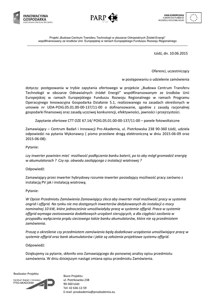 Projekt „Budowa Centrum Transferu Technologii w obszarze Odnawialnych Źródeł Energii” współfinansowany ze środków Unii Europejskiej w ramach Europejskiego Funduszu Rozwoju Regionalnego ____________________________________________________________________________________________________ Łódź, dn. 10.06.2015 Oferenci, uczestniczący w postępowaniu o udzielenie zamówienia dotyczy: postępowania w trybie zapytania ofertowego w projekcie „Budowa Centrum Transferu Technologii w obszarze Odnawialnych źródeł Energii” współfinansowanym ze środków Unii Europejskiej w ramach Europejskiego Funduszu Rozwoju Regionalnego w ramach Programu Operacyjnego Innowacyjna Gospodarka Działanie 5.1, realizowanego na zasadach określonych w umowie nr UDA-POIG.05.01.00-00-137/11-00 o dofinansowanie, zgodnie z zasadą racjonalnej gospodarki finansowej oraz zasadą uczciwej konkurencji, efektywności, jawności i przejrzystości. Zapytanie ofertowe CTT OZE 67.14/ POIG.05.01.00-00-137/11-00 – panele fotowoltaiczne Zamawiający – Centrum Badań i Innowacji Pro-Akademia, ul. Piotrkowska 238 90-360 Łódź, udziela odpowiedzi na pytania Wykonawcy ( pismo przesłane drogą elektroniczną w dniu 2015-06-09 oraz 2015-06-08): Pytanie: czy inwerter powinien mieć możliwość podłączenia banku baterii, po to aby mógł gromadzić energię w akumulatorach ? Czy np. obwodu zasilającego z instalacji wiatrowej ? Odpowiedź: Zamawiający przez inwerter hybrydowy rozumie inwerter posiadający możliwość pracy zarówno z instalacją PV jak i instalacją wiatrową. Pytanie: W Opisie Przedmiotu Zamówienia Zamawiający zleca aby inwerter miał możliwość pracy w systemie ongrid i offgrid. Na rynku nie ma dostępnych inwerterów dedykowanych do instalacji o mocy nominalnej 10 kW, które jednocześnie umożliwiałyby pracę w systemie offgrid. Praca w systemie offgrid wymaga zastosowania dodatkowych urządzeń sterujących, a dla ciągłości zasilania w przypadku wyłączenia prądu sieciowego także banku akumulatorów, które nie są przedmiotem zamówienia. Proszę o określenie czy przedmiotem zamówienia będą dodatkowe urządzenia umożliwiające pracę w systemie offgrid oraz bank akumulatorów i jakie są założenia projektowe systemu offgrid. Odpowiedź: Dziękujemy za pytanie, skłoniło ono Zamawiającego do ponownej analizy opisu przedmiotu zamówienia. W dniu dzisiejszym nastąpi zmiana opisu przedmiotu Zamówienia. Realizator Projektu Biuro Projektu: ul. Piotrkowska 238 90-360 Łódż Tel: 42 636-12-59 E-mail: [email protected] Projekt „Budowa Centrum Transferu Technologii w obszarze Odnawialnych Źródeł Energii” współfinansowany ze środków Unii Europejskiej w ramach Europejskiego Funduszu Rozwoju Regionalnego ____________________________________________________________________________________________________ Pytanie: Zawracamy się z prośbą o jasne sprecyzowanie, czy Zamawiający wymaga jedynie dostawy kompletnej instalacji fotowoltaicznej, czy też w zakres obowiązków Wykonawcy będzie należało również zamontowanie instalacji? W projekcie umowy jest wspomniane o uruchomieniu i o przeszkoleniu pracowników z zakresu działania instalacji, jednak nie ma jednoznacznie określonego, czy Wykonawca ma również ZAMONTOWAĆ dostarczoną instalację PV? Doprecyzowanie tej kwestii jest niezbędne do dokonania prawidłowej wyceny przedmiotu zamówienia, zgodnie z wymaganiami Zamawiającego. Odpowiedź: Zamawiający odniósł się do powyższej kwestii w odpowiedziach z dnia 08.06.2015. Odpowiedź opublikowana na stronie www zapytania ofertowego: http://www.bip.proakademia.eu/zapytaniaofertowe-i-przetargi/39,przetarg.html Pytanie: Jeśli Zamawiający wymaga zarówno dostawy, jak i montażu i uruchomienia instalacji, to czy nie nastąpiła pomyłka w określeniu daty realizacji zamówienia? Mając na uwadze termin składania ofert do 16.06.2015 r., dodatkowe dni na wybór Wykonawcy spośród wszystkich ofert oraz dni na podpisanie umowy z wybranym Wykonawcą - wykonanie zamówienia do końca miesiąca czerwca jest praktycznie niemożliwe. Należy mieć na uwadze również fakt, iż zamówienie materiałów będzie możliwe u producenta dopiero po podpinaniu umowy (ewentualnie po ogłoszeniu wyboru Wykonawcy), więc termin realizacji ulegnie znacznemu skróceniu i dostawa będzie niewykonalna w wyznaczonym terminie. Zwracamy się z prośbą o przedłużenie terminu realizacji - z przyczyn niezależnych od Wykonawcy, ale z powodów logistycznych realizacji przedsięwzięcia. Odpowiedź Z uwagi na termin zakończenia Projektu , a co za tym idzie możliwość dokonywania zakupów w Projekcie. Zamawiający jest zmuszony do zakończenia inwestycji i dokonania płatności do 30.06.2015. Zamawiający zdaje sobie sprawę z faktu, iż termin realizacji jest krótki jak na tego rodzaju zamówienie, z uwagi na ww. krótki termin realizacji Zamawiający jest gotów na prośbę oferentów dostarczyć dokumentację techniczną, proponowany schemat instalacji, dokumentację zdjęciową i wszelkie niezbędne informacje do przygotowania się do wykonania zamówienia. Zamawiający dokonał rozeznania rynku pod względem wykonalności zadania i z informacji, które zebrał wynika, iż inwestycja jest możliwa do przeprowadzenia w ciągu około 12 dni. Realizator Projektu Biuro Projektu: ul. Piotrkowska 238 90-360 Łódż Tel: 42 636-12-59 E-mail: [email protected] Projekt „Budowa Centrum Transferu Technologii w obszarze Odnawialnych Źródeł Energii” współfinansowany ze środków Unii Europejskiej w ramach Europejskiego Funduszu Rozwoju Regionalnego ____________________________________________________________________________________________________ Zamawiający dopuszcza również wizję lokalną obiektu w celach skosztorysowania oferty przed jej złożeniem. Centrum Badań i Innowacji zwróciło się z prośbą do Instytucji Pośredniczącej o wydłużenie okresu trwania Projektu, aczk