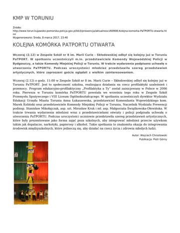 KMP W TORUNIU Źródło: http://www.torun.kujawsko-pomorska.policja.gov.pl/kb3/prewencja/aktualnosci/60908,Kolejna-komorka-PaTPORTU-otwarta.ht ml Wygenerowano: Środa, 8 marca 2017, 23:40 KOLEJNA KOMÓRKA PATPORTU OTWARTA Wczoraj (2.12) w Zespole Szkół nr 8 im. Marii Curie – Skłodowskiej odbył się kolejny już w Toruniu PaTPORT. W spotkaniu uczestniczyli m.in. przedstawiciele Komendy Wojewódzkiej Policji w Bydgoszczy, a także Komendy Miejskiej Policji w Toruniu. W trakcie wydarzenia podpisano uchwałę o utworzeniu PaTPORTU. Podczas uroczystości młodzież przedstawiła szereg przedstawień artystycznych, które zaproszeni goście oglądali z wielkim zainteresowaniem. Wczoraj (2.12) o godz. 11:00 w Zespole Szkół nr 8 im. Marii Curie – Skłodowskiej odbył się kolejny już w Toruniu PaTPORT. Jest to społeczność szkolna, realizująca działania na rzecz profilaktyki uzależnień i przemocy. Program edukacyjno-profilaktyczny „Profilaktyka a Ty” został zainicjowany w Polsce w 2006 roku. Pierwsza w Toruniu komórka PaTPORTU powstała we wrześniu tego roku w Zespole Szkół Przemysłu Spożywczego i VIII Liceum Ogólnokształcącego. W spotkaniu uczestniczyli dyrektor Wydziału Edukacji Urzędu Miasta Torunia Anna Łukaszewska, przedstawiciel Komendanta Wojewódzkiego kom. Marek Koliński oraz przedstawiciele Komendy Miejskiej Policji w Toruniu, Naczelnik Wydziału Prewencji podinsp. Stanisław Mikołajczak, asp. szt. Mirosław Kruk i mł. asp. Małgorzata Świątkowska-Olewińska. W trakcie trwania wydarzenia młodzież wraz z przedstawicielami oświaty i policji podpisała uchwałę o utworzeniu PaTPORTU. Podczas uroczystości uczniowie przedstawiła szereg przedstawień artystycznych, które były prezentowane jako forma zajęć poza szkolnych, aby integrować młodzież przeciw używkom takim jak dopalacze, narkotyki, papierosy i alkohol. Takie spotkania to znakomita okazja do integrowania środowisk międzyszkolnych, które jednoczą się, aby działać na rzecz życia i zdrowia młodych ludzi. Autor: Wojciech Chrostowski Publikacja: Piotr Górny Ocena: 0/5 (0) Tweetnij