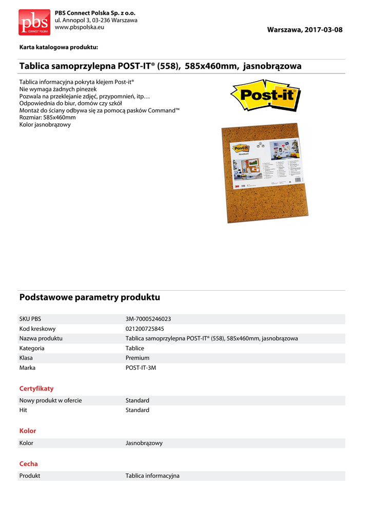 PBS Connect Polska Sp. z o.o. ul. Annopol 3, 03-236 Warszawa www.pbspolska.eu Warszawa, 2017-03-08 Karta katalogowa produktu: Tablica samoprzylepna POST-IT® (558), 585x460mm, jasnobrązowa Tablica informacyjna pokryta klejem Post-it® Nie wymaga żadnych pinezek Pozwala na przeklejanie zdjęć, przypomnień, itp… Odpowiednia do biur, domów czy szkół Montaż do ściany odbywa się za pomocą pasków Command™ Rozmiar: 585x460mm Kolor jasnobrązowy Podstawowe parametry produktu SKU PBS 3M-70005246023 Kod kreskowy 021200725845 Nazwa produktu Tablica samoprzylepna POST-IT® (558), 585x460mm, jasnobrązowa Kategoria Tablice Klasa Premium Marka POST-IT-3M Certyfikaty Nowy produkt w ofercie Standard Hit Standard Kolor Kolor Jasnobrązowy Cecha Produkt Tablica informacyjna PBS Connect Polska Sp. z o.o. ul. Annopol 3, 03-236 Warszawa www.pbspolska.eu Warszawa, 2017-03-08 Karta katalogowa produktu cd. Tablica samoprzylepna POST-IT® (558), 585x460mm, jasnobrązowa Podstawowe parametry produktu Typ Samoprzylepna W ofercie od 2016-01 Wymiary Wymiary (mm) 585x460 Zamiennik Zamiennik 3M-FT510089053 Wspólny słownik zamówień CPV 30195000-2 Tablice Jednostki logistyczne Opakowanie 1 6 szt