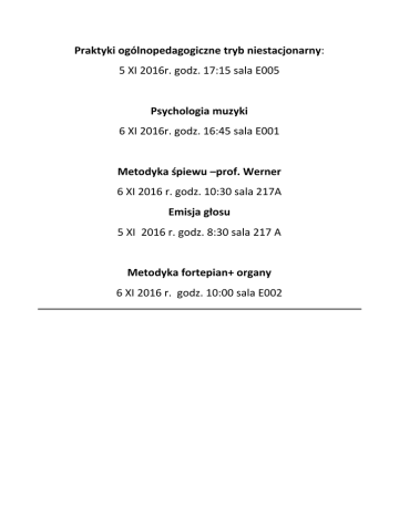 Praktyki ogólnopedagogiczne tryb niestacjonarny: 5 XI 2016r. godz. 17:15 sala E005 Psychologia muzyki 6 XI 2016r. godz. 16:45 sala E001 Metodyka śpiewu –prof. Werner 6 XI 2016 r. godz. 10:30 sala 217A Emisja głosu 5 XI 2016 r. godz. 8:30 sala 217 A Metodyka fortepian+ organy 6 XI 2016 r. godz. 10:00 sala E002