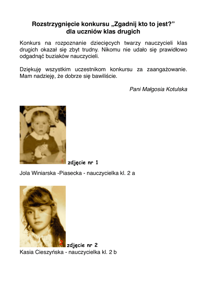 Rozstrzygnięcie konkursu „Zgadnij kto to jest?” dla uczniów klas drugich Konkurs na rozpoznanie dziecięcych twarzy nauczycieli klas drugich okazał się zbyt trudny. Nikomu nie udało się prawidłowo odgadnąć buziaków nauczycieli. Dziękuję wszystkim uczestnikom konkursu za zaangażowanie. Mam nadzieję, że dobrze się bawiliście. Pani Małgosia Kotulska zdjęcie nr 1 Jola Winiarska -Piasecka - nauczycielka kl. 2 a zdjęcie nr 2 Kasia Cieszyńska - nauczycielka kl. 2 b zdjęcie nr 3 Grażyna Żołnowska - nauczycielka kl. 2 c zdjęcie nr 4 Emila Kalkowska - nauczycielka kl. 2 d zdjęcie nr 5 Teresa Melder - nauczycielka kl. 2 e zdjęcie nr 6 Małgosia Kotulska - nauczycielka kl. 2 f zdjęcie nr 8 Renata Zorn - nauczycielka kl. 2 g zdjęcie nr 7 Hania Pek - nauczycielka muzyki klas drugich