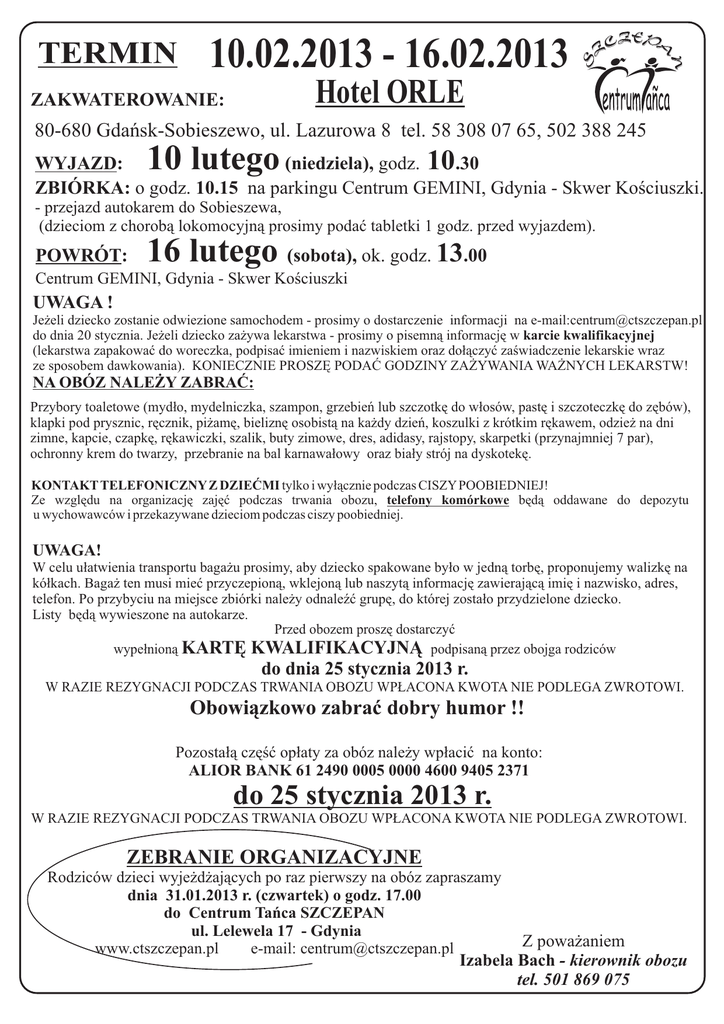 TERMIN 10.02.2013 - 16.02.2013 Hotel ORLE ZAKWATEROWANIE: 80-680 Gdańsk-Sobieszewo, ul. Lazurowa 8 tel. 58 308 07 65, 502 388 245 10 lutego WYJAZD: (niedziela), godz. 10.30 ZBIÓRKA: o godz. 10.15 na parkingu Centrum GEMINI, Gdynia - Skwer Kościuszki. - przejazd autokarem do Sobieszewa, (dzieciom z chorobą lokomocyjną prosimy podać tabletki 1 godz. przed wyjazdem). POWRÓT: 16 lutego (sobota), ok. godz. 13.00 Centrum GEMINI, Gdynia - Skwer Kościuszki UWAGA ! Jeżeli dziecko zostanie odwiezione samochodem - prosimy o dostarczenie informacji na e-mail:[email protected] do dnia 20 stycznia. Jeżeli dziecko zażywa lekarstwa - prosimy o pisemną informację w karcie kwalifikacyjnej (lekarstwa zapakować do woreczka, podpisać imieniem i nazwiskiem oraz dołączyć zaświadczenie lekarskie wraz ze sposobem dawkowania). KONIECZNIE PROSZĘ PODAĆ GODZINY ZAŻYWANIA WAŻNYCH LEKARSTW! NA OBÓZ NALEŻY ZABRAĆ: Przybory toaletowe (mydło, mydelniczka, szampon, grzebień lub szczotkę do włosów, pastę i szczoteczkę do zębów), klapki pod prysznic, ręcznik, piżamę, bieliznę osobistą na każdy dzień, koszulki z krótkim rękawem, odzież na dni zimne, kapcie, czapkę, rękawiczki, szalik, buty zimowe, dres, adidasy, rajstopy, skarpetki (przynajmniej 7 par), ochronny krem do twarzy, przebranie na bal karnawałowy oraz biały strój na dyskotekę. KONTAKT TELEFONICZNY Z DZIEĆMI tylko i wyłącznie podczas CISZY POOBIEDNIEJ! Ze względu na organizację zajęć podczas trwania obozu, telefony komórkowe będą oddawane do depozytu u wychowawców i przekazywane dzieciom podczas ciszy poobiedniej. UWAGA! W celu ułatwienia transportu bagażu prosimy, aby dziecko spakowane było w jedną torbę, proponujemy walizkę na kółkach. Bagaż ten musi mieć przyczepioną, wklejoną lub naszytą informację zawierającą imię i nazwisko, adres, telefon. Po przybyciu na miejsce zbiórki należy odnaleźć grupę, do której zostało przydzielone dziecko. Listy będą wywieszone na autokarze. Przed obozem proszę dostarczyć wypełnioną KARTĘ KWALIFIKACYJNĄ podpisaną przez obojga rodziców do dnia 25 stycznia 2013 r. W RAZIE REZYGNACJI PODCZAS TRWANIA OBOZU WPŁACONA KWOTA NIE PODLEGA ZWROTOWI. Obowiązkowo zabrać dobry humor !! Pozostałą część opłaty za obóz należy wpłacić na konto: ALIOR BANK 61 2490 0005 0000 4600 9405 2371 do 25 stycznia 2013 r. W RAZIE REZYGNACJI PODCZAS TRWANIA OBOZU WPŁACONA KWOTA NIE PODLEGA ZWROTOWI. ZEBRANIE ORGANIZACYJNE Rodziców dzieci wyjeżdżających po raz pierwszy na obóz zapraszamy dnia 31.01.2013 r. (czwartek) o godz. 17.00 do Centrum Tańca SZCZEPAN ul. Lelewela 17 - Gdynia www.ctszczepan.pl e-mail: [email protected] Z poważaniem Izabela Bach - kierownik obozu tel. 501 869 075
