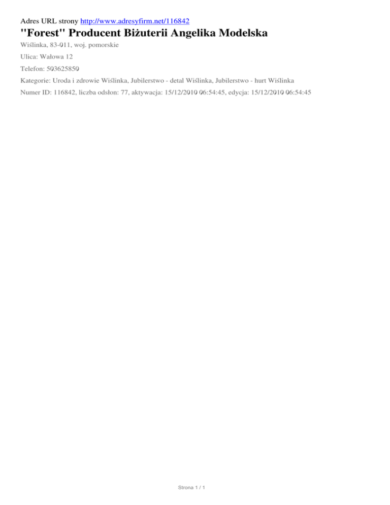 Adres URL strony http://www.adresyfirm.net/116842 "Forest" Producent Biżuterii Angelika Modelska Wiślinka, 83-011, woj. pomorskie Ulica: Wałowa 12 Telefon: 503625850 Kategorie: Uroda i zdrowie Wiślinka, Jubilerstwo - detal Wiślinka, Jubilerstwo - hurt Wiślinka Numer ID: 116842, liczba odsłon: 77, aktywacja: 15/12/2010 06:54:45, edycja: 15/12/2010 06:54:45 Strona 1 / 1