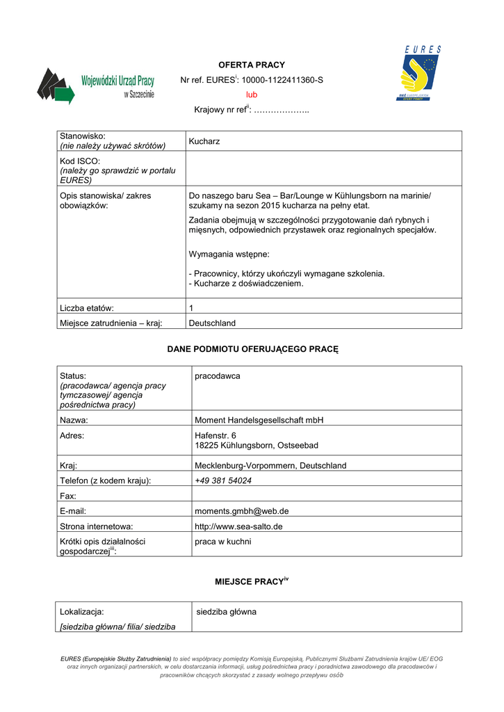 OFERTA PRACY i Nr ref. EURES : 10000-1122411360-S lub ii Krajowy nr ref : ……………….. Stanowisko: (nie należy używać skrótów) Kucharz Kod ISCO: (należy go sprawdzić w portalu EURES) Do naszego baru Sea – Bar/Lounge w Kühlungsborn na marinie/ szukamy na sezon 2015 kucharza na pełny etat. Opis stanowiska/ zakres obowiązków: Zadania obejmują w szczególności przygotowanie dań rybnych i mięsnych, odpowiednich przystawek oraz regionalnych specjałów. Wymagania wstępne: - Pracownicy, którzy ukończyli wymagane szkolenia. - Kucharze z doświadczeniem. Liczba etatów: 1 Miejsce zatrudnienia – kraj: Deutschland DANE PODMIOTU OFERUJĄCEGO PRACĘ Status: (pracodawca/ agencja pracy tymczasowej/ agencja pośrednictwa pracy) pracodawca Nazwa: Moment Handelsgesellschaft mbH Adres: Hafenstr. 6 18225 Kühlungsborn, Ostseebad Kraj: Mecklenburg-Vorpommern, Deutschland Telefon (z kodem kraju): +49 381 54024 Fax: E-mail: [email protected] Strona internetowa: http://www.sea-salto.de Krótki opis działalności iii gospodarczej : praca w kuchni MIEJSCE PRACY Lokalizacja: iv siedziba główna [siedziba główna/ filia/ siedziba EURES (Europejskie Służby Zatrudnienia) to sieć współpracy pomiędzy Komisją Europejską, Publicznymi Służbami Zatrudnienia krajów UE/ EOG oraz innych organizacji partnerskich, w celu dostarczania informacji, usług pośrednictwa pracy i poradnictwa zawodowego dla pracodawców i pracowników chcących skorzystać z zasady wolnego przepływu osób pracodawcy docelowego (w przypadku agencji pracy tymczasowej)/ miejsce oddelegowania pracownika/ inne – jakie] Powód oddelegowania pracownika: [należy wypełnić wyłącznie w przypadku gdy miejsce pracy nie jest główną siedzibą/ filią/ siedzibą pracodawcy docelowego (w przypadku agencji pracy tymczasowej)] Nazwa firmy: Moments Handelsgesellschaft mbH Adres: Hafenstr. 6 18225 Kühlungsborn, Ostseebad Kraj: Niemcy WYMAGANIA Wykształcenie: zawodowe lub techniczne; lub tylko z doświadczeniem zawodowym Doświadczenie zawodowe: mile widzane Znajomość języków: Język Poziom 1.niemiecki 1.komunikatywny A2 2. 2. 3. 3. Uprawnienia/ dyplomy/ dokumenty (np. prawo jazdy): Inne istotne wymagania: WYNAGRODZENIE I WARUNKI ZATRUDNIENIA Wysokość pensji brutto: 1800€ Wysokość pensji netto: w zaleznosci od klasy podatkowej Waluta, w jakiej wypłacana jest pensja: EURO Rodzaj stawki wynagrodzenia: (godzinowa/ tygodniowa/ miesięczna/ roczna/ inna) miesięczna Premie: dodatki za prace w niedziele i swieta Zwrot kosztów podróży i zakwaterowania Dodatkowe świadczenia (zakwaterowanie, wyżywienie, koszty związane ze zmianą miejsca zamieszkania, koszty podróży itp.): Nazwa firmy, z którą zostanie podpisana umowa: Moments Handelsgesellschaft mbH Rodzaj umowy: Umowa o pracę EURES (Europejskie Służby Zatrudnienia) to sieć współpracy pomiędzy Komisją Europejską, Publicznymi Służbami Zatrudnienia krajów UE/ EOG oraz innych organizacji partnerskich, w celu dostarczania informacji, usług pośrednictwa pracy i poradnictwa zawodowego dla pracodawców i pracowników chcących skorzystać z zasady wolnego przepływu osób (umowa o pracę, umowa zlecenia, wolontariat, praktyka zawodowa/ staż, praca zdalna, agencja pracy tymczasowej, inne): Wymiar czasu pracy (praca na pełen etat/ część etatu): praca na pełen etat Czas trwania umowy: nieokreslony (nieokreślony/ określony) Data wygaśnięcia umowy (w przypadku umowy na czas określony): Liczba godzin tygodniowo: 40 Zmiany i praca w dni wolne: Praca na zmiany, w soboty i niedziele Data rozpoczęcia: 01.04.15 Inne informacje: SPOSÓB SKŁADANIA WNIOSKU Wymagane dokumenty (list motywacyjny, CV itp.): CV Język, w którym muszą być sporządzone przedkładane dokumenty: deutsch Do kogo należy wysłać dokumenty: (do pracodawcy/ doradcy EURES) EURES-Beraterin: Frau Witt Gdzie należy wysłać dokumenty: (adres, adres e-mail, nr faksu z kodem kraju itp.) Löcknitzer Str. 10 Dane teleadresowe doradcy EURES lub przedstawiciela pracodawcy: (nazwisko, adres, telefon, fax, e-mail itp.) Tel: 0049 3973 202 209 17309 Pasewalk e-mail: [email protected] DODATKOWE INFORMACJE WAŻNOŚĆ Data publikacji: 11.02.15 Termin przedkładania podań o pracę / zakończenia ważności oferty: 31.05.15 Uprzejmie informujemy, że skontaktujemy się wyłącznie z wybranymi kandydatami. UWAGA: 1. Umowa z zagranicznym pracodawcą zostanie zawarta zgodnie z prawem kraju zatrudnienia. Oznacza to, że wszystkie roszczenia odnośnie do warunków, które obejmuje umowa, można kierować wyłącznie do odpowiedniego sądu w kraju EURES (Europejskie Służby Zatrudnienia) to sieć współpracy pomiędzy Komisją Europejską, Publicznymi Służbami Zatrudnienia krajów UE/ EOG oraz innych organizacji partnerskich, w celu dostarczania informacji, usług pośrednictwa pracy i poradnictwa zawodowego dla pracodawców i pracowników chcących skorzystać z zasady wolnego przepływu osób zatrudnienia. Publiczne służby zatrudnienia (EURES) nie mogą pośredniczyć ani reprezentować pracownika w sądzie kraju zatrudnienia w przypadku sporu z pracodawcą. 2. Publiczne służby zatrudnienia (EURES) dokładają wszelkich starań, aby zapewnić rzetelność i wiarygodność ofert pracy zgłoszonych w lokalnym urzędzie pracy. Należy wyjaśnić, że oferta pracy została zgłoszona przez stronę trzecią i EURES nie odpowiada za ewentualne rozbieżności między warunkami pracy określonymi w ofercie pracy i warunkami oferowanymi przez potencjalnego pracodawcę. 3. Publiczne służby zatrudnienia (EURES) informują, że będą zbierać, przetwarzać i przekazywać potencjalnym pracodawcom zgodnie z przepisami dotyczącymi ochrony danych osobowych wszystkie dane osobowe dostarczone przez osoby poszukujące pracy. i Nr ref. na portalu EURES www.eures.europa.eu . Dotyczy ofert pracy publicznych służb zatrudnienia, których bazy danych ofert pracy nie są połączone z portalem EURES. ii Kr