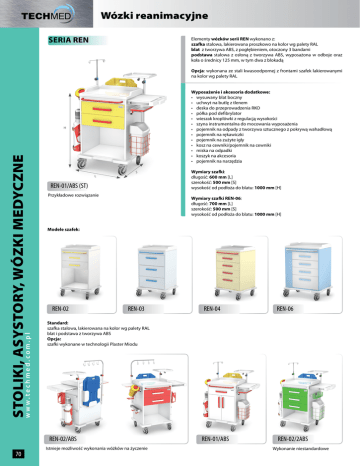 Wózki reanimacyjne SERIA REN Elementy wózków serii REN wykonano z: szafka stalowa, lakierowana proszkowo na kolor wg palety RAL blat z tworzywa ABS, z pogłębieniem, otoczony 3 bandami podstawa stalowa z osłoną z tworzywa ABS, wyposażona w odboje oraz koła o średnicy 125 mm, w tym dwa z blokadą Opcja: wykonana ze stali kwasoodpornej z frontami szafek lakierowanymi na kolor wg palety RAL Wyposażenie i akcesoria dodatkowe: • wysuwany blat boczny • uchwyt na butlę z tlenem • deska do przeprowadzenia RKO • półka pod defibrylator • wieszak kroplówki z regulacją wysokości • szyna instrumentalna do mocowania wyposażenia • pojemnik na odpady z tworzywa sztucznego z pokrywą wahadłową • pojemnik na rękawiczki • pojemnik na zużyte igły • kosz na cewniki/pojemnik na cewniki • miska na odpadki • koszyk na akcesoria • pojemnik na narzędzia w w w.techmed.com.pl STOLIKI, ASYSTORY, WÓZKI MEDYCZNE H S L REN-01/ABS (ST) Przykładowe rozwiązanie Wymiary szafki REN-06: długość: 700 mm [L] szerokość: 500 mm [S] wysokość od podłoża do blatu: 1000 mm [H] Modele szafek: REN-02 REN-03 REN-04 REN-06 Standard: szafka stalowa, lakierowana na kolor wg palety RAL blat i podstawa z tworzywa ABS Opcja: szafki wykonane w technologii Plaster Miodu REN-02/ABS 70 Wymiary szafki: długość: 600 mm [L] szerokość: 500 mm [S] wysokość od podłoża do blatu: 1000 mm [H] Istnieje możliwość wykonania wóżków na życzenie REN-01/ABS REN-02/2ABS Wykonanie niestandardowe