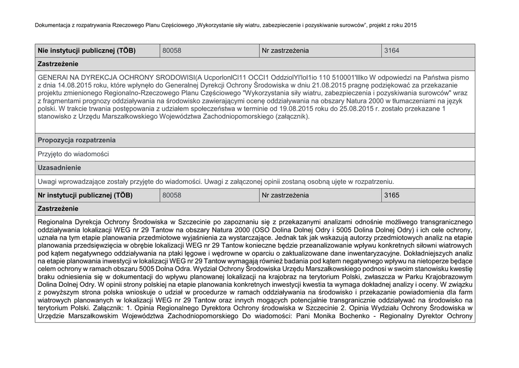 Dokumentacja z rozpatrywania Rzeczowego Planu Częściowego „Wykorzystanie siły wiatru, zabezpieczenie i pozyskiwanie surowców”, projekt z roku 2015 Nie instytucji publicznej (TÖB) 80058 Nr zastrzeżenia 3164 Zastrzeżenie GENERAl NA DYREKCJA OCHRONY SRODOWISI(A UcporlonlCl11 OCCI1 OddziolYl'lol1io 110 510001'lllko W odpowiedzi na Państwa pismo z dnia 14.08.2015 roku, które wpłynęło do Generalnej Dyrekcji Ochrony Środowiska w dniu 21.08.2015 pragnę podziękować za przekazanie projektu zmienionego Regionalno-Rzeczowego Planu Częściowego "Wykorzystania siły wiatru, zabezpieczenia i pozyskiwania surowców" wraz z fragmentami prognozy oddziaływania na środowisko zawierającymi ocenę oddziaływania na obszary Natura 2000 w tłumaczeniami na język polski. W trakcie trwania postępowania z udziałem społeczeństwa w terminie od 19.08.2015 roku do 25.08.2015 r. zostało przekazane 1 stanowisko z Urzędu Marszałkowskiego Województwa Zachodniopomorskiego (załącznik). Propozycja rozpatrzenia Przyjęto do wiadomości Uzasadnienie Uwagi wprowadzające zostały przyjęte do wiadomości. Uwagi z załączonej opinii zostaną osobną ujęte w rozpatrzeniu. Nr instytucji publicznej (TÖB) 80058 Nr zastrzeżenia 3165 Zastrzeżenie Regionalna Dyrekcja Ochrony Środowiska w Szczecinie po zapoznaniu się z przekazanymi analizami odnośnie możliwego transgranicznego oddziaływania lokalizacji WEG nr 29 Tantow na obszary Natura 2000 (OSO Dolina Dolnej Odry i 5005 Dolina Dolnej Odry) i ich cele ochrony, uznała na tym etapie planowania przedmiotowe wyjaśnienia za wystarczające. Jednak tak jak wskazują autorzy przedmiotowych analiz na etapie planowania przedsięwzięcia w obrębie lokalizacji WEG nr 29 Tantow konieczne będzie przeanalizowanie wpływu konkretnych siłowni wiatrowych pod kątem negatywnego oddziaływania na ptaki lęgowe i wędrowne w oparciu o zaktualizowane dane inwentaryzacyjne. Dokładniejszych analiz na etapie planowania inwestycji w lokalizacji WEG nr 29 Tantow wymagają również badania pod kątem negatywnego wpływu na nietoperze będące celem ochrony w ramach obszaru 5005 Dolna Odra. Wydział Ochrony Środowiska Urzędu Marszałkowskiego podnosi w swoim stanowisku kwestię braku odniesienia się w dokumentacji do wpływu planowanej lokalizacji na krajobraz na terytorium Polski, zwłaszcza w Parku Krajobrazowym Dolina Dolnej Odry. W opinii strony polskiej na etapie planowania konkretnych inwestycji kwestia ta wymaga dokładnej analizy i oceny. W związku z powyższym strona polska wnioskuje o udział w procedurze w ramach oddziaływania na środowisko i przekazanie powiadomienia dla farm wiatrowych planowanych w lokalizacji WEG nr 29 Tantow oraz innych mogących potencjalnie transgranicznie oddziaływać na środowisko na terytorium Polski. Załącznik: 1. Opinia Regionalnego Dyrektora Ochrony środowiska w Szczecinie 2. Opinia Wydziału Ochrony Środowiska w Urzędzie Marszałkowskim Województwa Zachodniopomorskiego Do wiadomości: Pani Monika Bochenko - Regionalny Dyrektor Ochrony Dokumentacja z rozpatrywania Rzeczowego Planu Częściowego „Wykorzystanie siły wiatru, zabezpieczenie i pozyskiwanie surowców”, projekt z roku 2015 Środowiska w Szczecinie Pan Mariusz Adamski - Dyrektor Wydziału Ochrony Środowiska w Urzędzie Marszałkowskim Województwa Zachodniopomorskiego Propozycja rozpatrzenia Zostaje uwzględnione Uzasadnienie W celu ochrony awifauny uwzględnione zostały faunistyczno-ekologiczne odległości przy ustalaniu obszarów kwalifikowanych do wykorzystania energii wiatru. Ustalenie faunistyczno-ekologicznych odległości wynika z orzeczenia „Poszanowanie kwestii ochrony przyrody przy wyznaczaniu obszarów kwalifikowanych do wykorzystania energii wiatru i wydawaniu zezwoleń dla turbin wiatrowych” z 2011 r. wydanego przez Ministerstwo Środowiska, Zdrowia i Ochrony Konsumentów Brandenburgii i jest ściśle skoordynowane z właściwymi organami ochrony środowiska. Zastosowane strefy ochrony i strefy restrykcyjne mają na celu ochronę zagrożonych gatunków ptaków szczególnie wrażliwych na zakłócenia. Uwzględnienie odległości faunistyczno-ekologicznych stanowi istotną podstawę oceny oddziaływania. Zachowanie stref ochronnych dla wrażliwych na zakłócenia gatunków ptaków i nietoperzy gwarantuje, że przesłanki zakazu i zakłócające w rozumieniu BNatSchG (§ 44 ust. 1-3) oraz Dyrektywy siedliskowej i Dyrektywy ptasiej (Dyrektywa 92/43/EWG, 2009/147/EWG) dla znanych populacji gatunków nie są zasadniczo naruszane. W kolejnych postępowaniach o wydanie zezwoleń należy na bieżąco ustalić zmiany w składzie gatunkowym i je uwzględnić. Jednocześnie konflikty powstające dla występujących gatunków nietoperzy muszą być rozwiązywane za pomocą ukierunkowanych środków zapobiegawczych i łagodzących dla danego gatunku przy przedstawianiu konkretnych parametrów planistycznych. Park Narodowy „Dolina Dolnej Odry” stanowi kryterium tabu w odniesieniu do wykorzystania energii wiatrowej ze względu na swoją wysoką wartość przyrodniczą. Również w sąsiadującym obszarze chronionego krajobrazu „Park Narodowy Doliny Dolnej Odry” nie są zlokalizowane żadne obszary kwalifikowane do wykorzystania energii wiatru. W celu uwzględnienia ochrony krajobrazu, zlecono przeprowadzenie analizy i oceny krajobrazu w regionie niezależnemu rzeczoznawcy. Dokonana ocena krajobrazu opiera się na prawnie określonych pojęciach zgodnie z § 1 BNatSchG różnorodność, wyjątkowość i piękno. Jednym ze sposobów na zobiektywizowanie krajobrazu jest opisanie różnorodności, wyjątkowości i odrębności przestrzeni przyrodniczej. Jako podstawa analizy rozgraniczone zostały estetyczne jednostki przestrzenne regionu planowania, które mają stosunkowo jednolity wygląd i do których można przypisać te same cechy charakteru. Ocenę przeprowadzono dla jednostek krajobrazowych o dużej powierzchni, ponieważ turbin