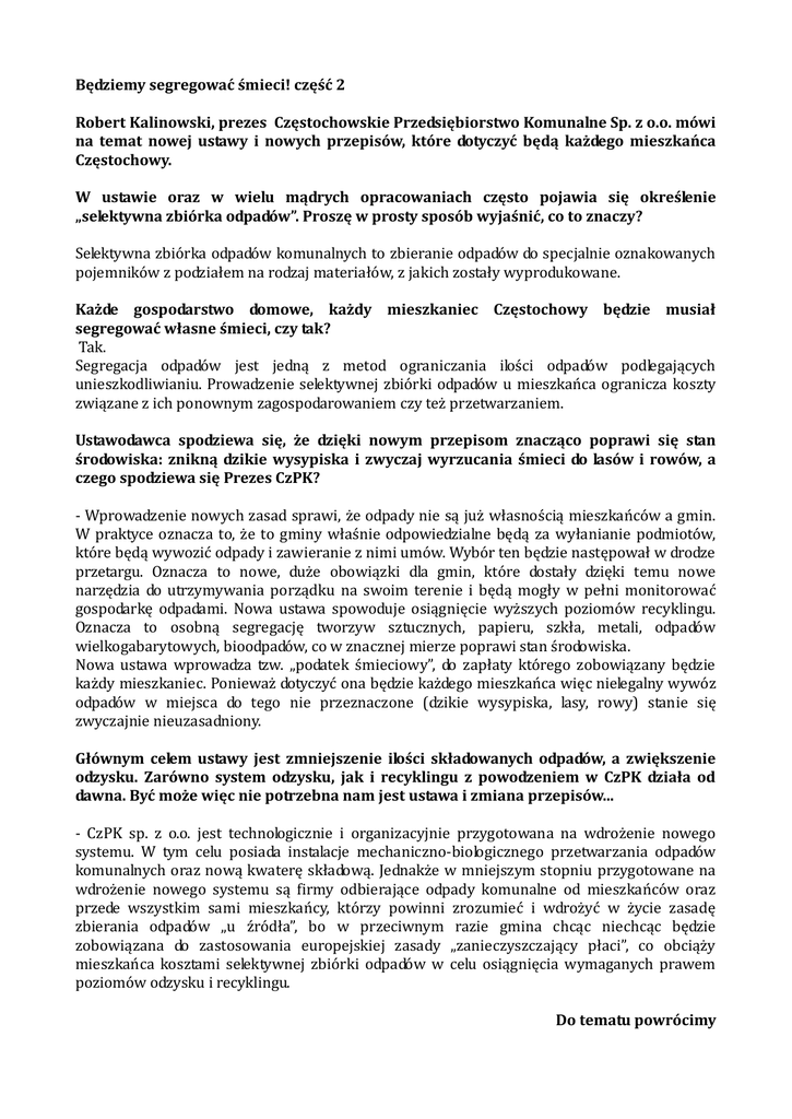 Będziemy segregować śmieci! część 2 Robert Kalinowski, prezes Częstochowskie Przedsiębiorstwo Komunalne Sp. z o.o. mówi na temat nowej ustawy i nowych przepisów, które dotyczyć będą każdego mieszkańca Częstochowy. W ustawie oraz w wielu mądrych opracowaniach często pojawia się określenie „selektywna zbiórka odpadów”. Proszę w prosty sposób wyjaśnić, co to znaczy? Selektywna zbiórka odpadów komunalnych to zbieranie odpadów do specjalnie oznakowanych pojemników z podziałem na rodzaj materiałów, z jakich zostały wyprodukowane. Każde gospodarstwo domowe, każdy mieszkaniec Częstochowy będzie musiał segregować własne śmieci, czy tak? Tak. Segregacja odpadów jest jedną z metod ograniczania ilości odpadów podlegających unieszkodliwianiu. Prowadzenie selektywnej zbiórki odpadów u mieszkańca ogranicza koszty związane z ich ponownym zagospodarowaniem czy też przetwarzaniem. Ustawodawca spodziewa się, że dzięki nowym przepisom znacząco poprawi się stan środowiska: znikną dzikie wysypiska i zwyczaj wyrzucania śmieci do lasów i rowów, a czego spodziewa się Prezes CzPK? - Wprowadzenie nowych zasad sprawi, że odpady nie są już własnością mieszkańców a gmin. W praktyce oznacza to, że to gminy właśnie odpowiedzialne będą za wyłanianie podmiotów, które będą wywozić odpady i zawieranie z nimi umów. Wybór ten będzie następował w drodze przetargu. Oznacza to nowe, duże obowiązki dla gmin, które dostały dzięki temu nowe narzędzia do utrzymywania porządku na swoim terenie i będą mogły w pełni monitorować gospodarkę odpadami. Nowa ustawa spowoduje osiągnięcie wyższych poziomów recyklingu. Oznacza to osobną segregację tworzyw sztucznych, papieru, szkła, metali, odpadów wielkogabarytowych, bioodpadów, co w znacznej mierze poprawi stan środowiska. Nowa ustawa wprowadza tzw. „podatek śmieciowy”, do zapłaty którego zobowiązany będzie każdy mieszkaniec. Ponieważ dotyczyć ona będzie każdego mieszkańca więc nielegalny wywóz odpadów w miejsca do tego nie przeznaczone (dzikie wysypiska, lasy, rowy) stanie się zwyczajnie nieuzasadniony. Głównym celem ustawy jest zmniejszenie ilości składowanych odpadów, a zwiększenie odzysku. Zarówno system odzysku, jak i recyklingu z powodzeniem w CzPK działa od dawna. Być może więc nie potrzebna nam jest ustawa i zmiana przepisów... - CzPK sp. z o.o. jest technologicznie i organizacyjnie przygotowana na wdrożenie nowego systemu. W tym celu posiada instalacje mechaniczno-biologicznego przetwarzania odpadów komunalnych oraz nową kwaterę składową. Jednakże w mniejszym stopniu przygotowane na wdrożenie nowego systemu są firmy odbierające odpady komunalne od mieszkańców oraz przede wszystkim sami mieszkańcy, którzy powinni zrozumieć i wdrożyć w życie zasadę zbierania odpadów „u źródła”, bo w przeciwnym razie gmina chcąc niechcąc będzie zobowiązana do zastosowania europejskiej zasady „zanieczyszczający płaci”, co obciąży mieszkańca kosztami selektywnej zbiórki odpadów w celu osiągnięcia wymaganych prawem poziomów odzysku i recyklingu. Do tematu powrócimy Renata R. Kluczna Tygodnik Regionalny „7dni” nr 19 (417)