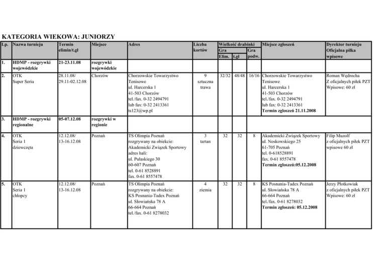 KATEGORIA WIEKOWA: JUNIORZY Adres Dyrektor turnieju Oficjalna piłka wpisowe 32/32 48/48 16/16 Chorzowskie Towarzystwo Tenisowe ul. Harcerska 1 41-503 Chorzów tel./fax. 0-32 2494791 lub fax: 0-32 2413361 Termin zgłoszeń 21.11.2008 Roman Wędrocha Z oficjalnych piłek PZT Wpisowe: 60 zł Termin elimin/t.gł Miejsce 1. HDMP - rozgrywki wojewódzkie 21-23.11.08 rozgrywki wojewódzkie 2. OTK Super Seria 28.11.08/ 29.11-02.12.08 Chorzów 3. HDMP - rozgrywki regionalne 05-07.12.08 rozgrywki w regionie 4. OTK Seria 1 dziewczęta 12.12.08/ 13-16.12.08 Poznań TS Olimpia Poznań rozgrywany na obiekcie: Akademicki Związek Sportowy adres hali: ul. Pułaskiego 30 60-607 Poznań tel. 0-61 8528891 fax. 0-61 8557478 3 tartan 32 32 8 Akademicki Związek Sportowy ul. Noskowskiego 25 61-705 Poznań tel. 0-618528891 fax. 0-61 8557478 Termin zgłoszeń:05.12.2008 Filip Muzolf z oficjalnych piłek PZT wpisowe 60 zł 5. OTK Seria 1 chłopcy 12.12.08/ 13-16.12.08 Poznań TS Olimpia Poznań rozgrywany na obiekcie: KS Posnania-Tadex Poznań ul. Słowiańska 78 A 66-664 Poznań tel./fax. 0-61 8278032 4 ziemia 32 32 8 KS Posnania-Tadex Poznań ul. Słowiańska 78 A 66-664 Poznań tel./fax. 0-61 8278032 Termin zgłoszeń: 05.12.2008 Jerzy Płotkowiak z oficjalnych piłek PZT Wpisowe: 60 zł Chorzowskie Towarzystwo Tenisowe ul. Harcerska 1 41-503 Chorzów tel./fax. 0-32 2494791 lub fax: 0-32 2413361 [email protected] Liczba kortów Wielkość drabinki Miejsce zgłoszeń Gra Gra podw. Elim. t.gł Lp. Nazwa turnieju 9 sztuczna trawa 6. HDMP - FINAŁ 19-21.12.08 do ustalenia 7. OTK Seria 2 08.01.09/ 08-11.01.09 Łęczna GKS Górnik Łęczna Sekcja Tenisa Ziemnego Al. Jana Pawła II 13 21-010 Łęczna tel./fax. 0-81 7521739 3 sztuczna trawa 32/32 32/32 16/16 GKS Górnik Łęczna Sekcja Tenisa Ziemnego Al. Jana Pawła II 13 21-010 Łęczna tel./fax. 0-81 7521739 Termin zgłoszeń: 01.01.2009 Stanisław Stańczyk Z oficjalnych piłek PZT Wpisowe: 60zł 9. ITF 4 11-12.01.09/ 13-18.01.09 Szczecin Szczeciński Klub Tenisowy ul. Wojska Polskiego 127 70-490 Szczecin tel. 0-91 4220049 fax. 0-91 4224220 [email protected] adres hali: Szczecińskie Centrum Tenisowe, ul. Dębska 11A 3 Rebound Ace 32/32 32/32 16/16 Polski Związek Tenisowy ul. Frascati 4 00-483 Warszawa tel. 0-22 6292621 fax. 0-22 6218001 [email protected] Termin zgłoszeń: 23.12.2008 Janusz Korzeniewicz Wpisowe dla zawodników polskich to 2/3 kwoty wpisowego dla zawodników zagranicznych 10. OTK Seria 2 dziewczęta 17.01.09/ 17-20.01.09 Poznań TT Świerczewo rozgrywany na obiekcie: Akademicki Związek Sportowy adres hali: ul. Pułaskiego 30 60-607 Poznań tel. 0-61 8528891 fax. 0-61 8557478 3 tartan 32 32 8 Akademicki Związek Sportowy ul. Noskowskiego 25 61-705 Poznań tel. 0-61 8518595 fax. 0-61 8557478 Termin zgłoszeń:10.01.2009 Filip Muzolf z oficjalnych piłek PZT wpisowe 60 zł OTK Seria 2 chłopcy 17.01.09/ 17-20.01.09 Poznań TT Świerczewo rozgrywany na obiekcie: KS Posnania-Tadex Poznań ul. Słowiańska 78 A 66-664 Poznań tel./fax. 0-61 8278032 4 ziemia OTK Seria 2 O Puchar Woli 31.01.09/ 31.01-3.02.09 Kraków Małopolski WZT i Wola Sport Paradise ul. Bratysławska 1 A 31-201 Kraków tel./fax. 0-12 4253900 adres hali: Koło Strzelnicy 5 30-219 Kraków 12. OTK Seria 1 06.02.09/ 07-10.02.09 Gdynia TKS Arka Gdynia ul. Ejsmonda 3 81-409 Gdynia tel. 0-58 6624953 (54) fax. 0-58 6224051 13. OTK Seria 2 12.02.09/ 12-15.02.09 Łęczna GKS Górnik Łęczna Sekcja Tenisa Ziemnego Al. Jana Pawła II 13 21-010 Łęczna tel./fax. 0-81 7521739 11. 32 32 8 KS Posnania-Tadex Poznań ul. Słowiańska 78 A 66-664 Poznań tel./fax. 0-61 8278032 Termin zgłoszeń: 10.01.2009 Jerzy Płotkowiak z oficjalnych piłek PZT Wpisowe: 60 zł 4 ziemia 32/32 32/32 16/16 Wola Sport Paradise ul. Bratysławska 1 A 31-201 Kraków tel./fax. 0-12 4253900 Termin zgłoszeń: 24.01.2009 Wojciech Litwicki z oficjalnych piłek PZT Wpisowe: 60 zł 5 ziemia 32/32 32/32 16/16 TKS Arka Gdynia ul. Ejsmonda 3 81-409 Gdynia tel. 0-58 6624953 (54) fax. 0-58 6224051 Termin zgłoszeń: 30.01.2009 Katarzyna Raszka z oficjalnych piłek PZT Wpisowe: 60 zł 3 sztuczna trawa 32/32 32/32 16/16 GKS Górnik Łęczna Sekcja Tenisa Ziemnego Al. Jana Pawła II 13 21-010 Łęczna tel./fax. 0-81 7521739 Termin zgłoszeń: 05.02.2009 Stanisław Stańczyk Z oficjalnych piłek PZT Wpisowe: 60zł 12. Halowe Mistrzostwa Polski 16-17.02.09/ 18-22.02.09 Szczecin Szczeciński Klub Tenisowy ul. Wojska Polskiego 127 70-490 Szczecin tel. 0-91 4220049 fax. 0-91 4224220 [email protected] adres hali: Szczecińskie Centrum Tenisowe, ul. Dębska 11A 3 Rebound Ace 13. OTK Seria 2 dziewczęta 27.02.09/ 28.02-3.03.09 Poznań PKT Pobiedziska rozgrywany na obiekcie: Akademicki Związek Sportowy adres hali: ul. Pułaskiego 30 60-607 Poznań tel. 0-61 8528891 fax. 0-61 8557478 3 tartan 32 32 8 Akademicki Związek Sportowy ul. Noskowskiego 25 61-705 Poznań tel. 0-61 8518595 fax. 0-61 8557478 Termin zgłoszeń:20.02.2009 Filip Muzolf z oficjalnych piłek PZT wpisowe 60 zł 14. OTK Seria 2 chłopcy 28.02.09/ 28.02-3.03.09 Poznań PKT Pobiedziska rozgrywany na obiekcie: KS Posnania-Tadex Poznań ul. Słowiańska 78 A 66-664 Poznań tel./fax. 0-61 8278032 4 ziemia 32 32 8 KS Posnania-Tadex Poznań ul. Słowiańska 78 A 66-664 Poznań tel./fax. 0-61 8278032 Termin zgłoszeń: 20.02.2009 Jerzy Płotkowiak z oficjalnych piłek PZT Wpisowe: 60 zł 15. OTK Seria 2 06.03.09/ 06-09.03.09 Stalowa Wola Miejski Klub Tenisowy ul. Skoczyńskiego 3 37-450 Stalowa Wola tel. 0-15 8441444 tel./fax. 0-15 8424237 [email protected] Hala: ul. Wyszyńskiego 1 4 conipur 32/32 32/32 16/16 Miejski Klub Tenisowy ul. Skoczyńskiego 3 37-450 Stalowa Wola tel. 0-15 8441444 tel./fax. 0-15 8424237 Termin zgłoszeń: 27.02.2009 Włodzimierz Pikulski z oficjalnych piłek PZT Wpisowe: 60 zł 32/32 32/32 16/16 Polski Związek Tenisowy ul. Frascati 4 00-483 Warszawa tel. 0-22 6292621 fax. 0-22 6218001 TERMIN ZGŁ. 09.02.2009 …………………. Piłki: Wilson Australi