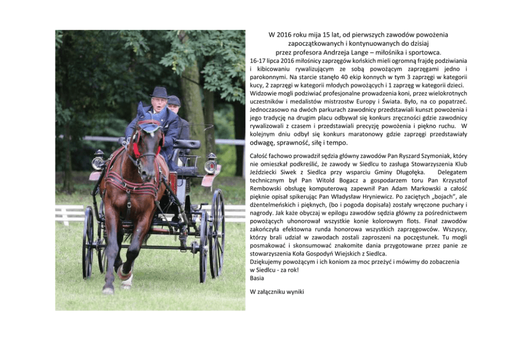 W 2016 roku mija 15 lat, od pierwszych zawodów powożenia zapoczątkowanych i kontynuowanych do dzisiaj przez profesora Andrzeja Lange – miłośnika i sportowca. 16-17 lipca 2016 miłośnicy zaprzęgów końskich mieli ogromną frajdę podziwiania i kibicowaniu rywalizującym ze sobą powożącym zaprzęgami jedno i parokonnymi. Na starcie stanęło 40 ekip konnych w tym 3 zaprzęgi w kategorii kucy, 2 zaprzęgi w kategorii młodych powożących i 1 zaprzęg w kategorii dzieci. Widzowie mogli podziwiać profesjonalne prowadzenia koni, przez wielokrotnych uczestników i medalistów mistrzostw Europy i Świata. Było, na co popatrzeć. Jednoczasowo na dwóch parkurach zawodnicy przedstawiali kunszt powożenia i jego tradycję na drugim placu odbywał się konkurs zręczności gdzie zawodnicy rywalizowali z czasem i przedstawiali precyzję powożenia i piękno ruchu. W kolejnym dniu odbył się konkurs maratonowy gdzie zaprzęgi przedstawiały odwagę, sprawność, siłę i tempo. Całość fachowo prowadził sędzia główny zawodów Pan Ryszard Szymoniak, który nie omieszkał podkreślić, że zawody w Siedlcu to zasługa Stowarzyszenia Klub Jeździecki Siwek z Siedlca przy wsparciu Gminy Długołęka. Delegatem technicznym był Pan Witold Bogacz a gospodarzem toru Pan Krzysztof Rembowski obsługę komputerową zapewnił Pan Adam Markowski a całość pięknie opisał spikerując Pan Władysław Hryniewicz. Po zaciętych „bojach”, ale dżentelmeńskich i pięknych, (bo i pogoda dopisała) zostały wręczone puchary i nagrody. Jak każe obyczaj w epilogu zawodów sędzia główny za pośrednictwem powożących uhonorował wszystkie konie kolorowym flots. Finał zawodów zakończyła efektowna runda honorowa wszystkich zaprzęgowców. Wszyscy, którzy brali udział w zawodach zostali zaproszeni na poczęstunek. Tu mogli posmakować i skonsumować znakomite dania przygotowane przez panie ze stowarzyszenia Koła Gospodyń Wiejskich z Siedlca. Dziękujemy powożącym i ich koniom za moc przeżyć i mówimy do zobaczenia w Siedlcu - za rok! Basia W załączniku wyniki