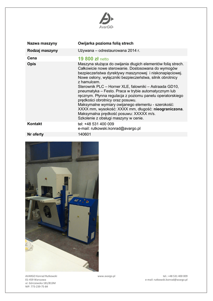 Nazwa maszyny Owijarka pozioma folią strech Rodzaj maszyny Używana – odrestaurowana 2014 r. Cena Opis 19 800 zł netto Kontakt Nr oferty AVARGO Konrad Rutkowski 01-459 Warszawa ul. Górczewska 181/813M NIP: 773-239-75-84 Maszyna służąca do owijania długich elementów folią strech. Całkowicie nowe sterowanie. Dostosowana do wymogów bezpieczeństwa dyrektywy maszynowej i niskonapięciowej. Nowe osłony, wyłączniki bezpieczeństwa, silnik obrotnicy z hamulcem. Sterownik PLC – Horner XLE, falowniki – Astraada GD10, pneumatyka – Festo. Praca w trybie automatycznym lub ręcznym. Płynna regulacja z poziomu panelu operatorskiego prędkości obrotnicy oraz posuwu. Maksymalne wymiary owijanego elementu - szerokość: XXXX mm, wysokość: XXXX mm, długość: nieograniczona. Maksymalna prędkość posuwu: XXXXX m/s. Szkolenie z obsługi maszyny w cenie. tel: +48 531 400 009 e-mail: [email protected] 140601 www.avargo.pl tel.: +48 531 400 009 e-mail: [email protected]