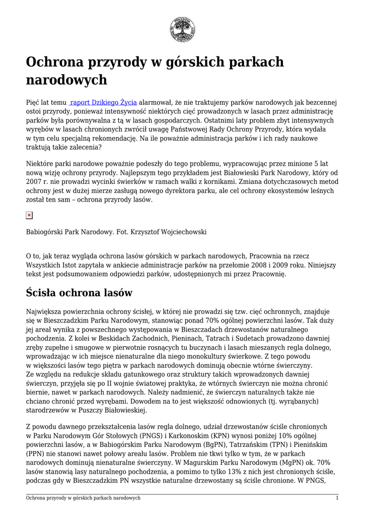 Ochrona przyrody w górskich parkach narodowych Pięć lat temu raport Dzikiego Życia alarmował, że nie traktujemy parków narodowych jak bezcennej ostoi przyrody, ponieważ intensywność niektórych cięć prowadzonych w lasach przez administrację parków była porównywalna z tą w lasach gospodarczych. Ostatnimi laty problem zbyt intensywnych wyrębów w lasach chronionych zwrócił uwagę Państwowej Rady Ochrony Przyrody, która wydała w tym celu specjalną rekomendację. Na ile poważnie administracja parków i ich rady naukowe traktują takie zalecenia? Niektóre parki narodowe poważnie podeszły do tego problemu, wypracowując przez minione 5 lat nową wizję ochrony przyrody. Najlepszym tego przykładem jest Białowieski Park Narodowy, który od 2007 r. nie prowadzi wycinki świerków w ramach walki z kornikami. Zmiana dotychczasowych metod ochrony jest w dużej mierze zasługą nowego dyrektora parku, ale cel ochrony ekosystemów leśnych został ten sam – ochrona przyrody lasów. Babiogórski Park Narodowy. Fot. Krzysztof Wojciechowski O to, jak teraz wygląda ochrona lasów górskich w parkach narodowych, Pracownia na rzecz Wszystkich Istot zapytała w ankiecie administracje parków na przełomie 2008 i 2009 roku. Niniejszy tekst jest podsumowaniem odpowiedzi parków, udostępnionych mi przez Pracownię. Ścisła ochrona lasów Największa powierzchnia ochrony ścisłej, w której nie prowadzi się tzw. cięć ochronnych, znajduje się w Bieszczadzkim Parku Narodowym, stanowiąc ponad 70% ogólnej powierzchni lasów. Tak duży jej areał wynika z powszechnego występowania w Bieszczadach drzewostanów naturalnego pochodzenia. Z kolei w Beskidach Zachodnich, Pieninach, Tatrach i Sudetach prowadzono dawniej zręby zupełne i smugowe w pierwotnie rosnących tu buczynach i lasach mieszanych regla dolnego, wprowadzając w ich miejsce nienaturalne dla niego monokultury świerkowe. Z tego powodu w większości lasów tego piętra w parkach narodowych dominują obecnie wtórne świerczyny. Ze względu na redukcje składu gatunkowego oraz struktury takich wprowadzonych dawniej świerczyn, przyjęła się po II wojnie światowej praktyka, że wtórnych świerczyn nie można chronić biernie, nawet w parkach narodowych. Należy nadmienić, że świerczyn naturalnych także nie chciano chronić przed wyrębami. Dowodem na to jest większość odnowionych (tj. wyrąbanych) starodrzewów w Puszczy Białowieskiej. Z powodu dawnego przekształcenia lasów regla dolnego, udział drzewostanów ściśle chronionych w Parku Narodowym Gór Stołowych (PNGS) i Karkonoskim (KPN) wynosi poniżej 10% ogólnej powierzchni lasów, a w Babiogórskim Parku Narodowym (BgPN), Tatrzańskim (TPN) i Pienińskim (PPN) nie stanowi nawet połowy areału lasów. Problem nie tkwi tylko w tym, że w parkach narodowych dominują nienaturalne świerczyny. W Magurskim Parku Narodowym (MgPN) ok. 70% lasów stanowią lasy naturalnego pochodzenia, a pomimo to tylko 13% z nich jest chronionych ściśle, podczas gdy w Bieszczadzkim PN wszystkie naturalne drzewostany są ściśle chronione. W PNGS, Ochrona przyrody w górskich parkach narodowych 1 w którym przed wyrębami chroni się 6,3% lasów, są też inne drzewostany naturalnego pochodzenia, ale nie wyłączono ich z planów cięć. Są to głównie lasy objęte tzw. czynną ochroną zachowawczą, jak np. 120-letnia jedlina i 170-letnia buczyna na tzw. Progu Radkowskim. Są one przewidziane do ochrony ścisłej, jednak prowadzi się w nich cięcia ochronne, polegające na ograniczaniu liczebności zespołu korników (korowanie zasiedlonych przez nie świerków). Z kolei w Świętokrzyskim Parku Narodowym (ŚPN) lasy naturalnego pochodzenia zajmują ponad 30% powierzchni, a pomimo tego od wyrębów wyłączono tylko 23% lasów. Zrobiła to zresztą Tymczasowa Komisja Ochrony Przyrody już 80 lat temu. Co z tego, że przez ten czas utworzono ŚPN, później znacznie go powiększając, skoro powierzchnia lasów de facto chroniona przed wyrębami jest niewiele większa. Tak samo zresztą zrobiono w KPN i BgPN. Widzimy na tych przykładach, że to wcale nie tzw. stopień naturalności drzewostanów w ekosystemach leśnych decyduje o tym, jaka część lasów w parkach narodowych jest ściśle chroniona przed wyrębami. Planowe urządzanie parków Wydawałoby się, że Ustawa o ochronie przyrody jasno wskazuje, iż lasy w parkach narodowych są szczególnie traktowane po to, żeby mogły realizować się w nich naturalne procesy (np. obieg materii czy też powstawanie naturalnie otwartych powierzchni, jak wiatrowały czy pożarzyska), które z oczywistych przyczyn nie mogą zachodzić w lasach gospodarczych, obciążonych funkcją produkcji drewna. Tymczasem nawet połowa lasów górskich w parkach narodowych nie jest chroniona przed takimi wyrębami, jak cięcia odsłaniające młode pokolenie drzew, cięcia drzew połamanych przez wiatr czy drzew zasiedlonych przez korniki. Pieniny. Fot. Kaj Romeyko-Hurko W konsekwencji takiego podejścia do idei ochrony lasów, prawie wszystkie parki narodowe w górach prowadzą zabiegi typowe dla każdego nadleśnictwa – począwszy od zakładania upraw, przez czyszczenia i trzebieże, aż po przebudowę drzewostanów i planowe cięcia rębne w starszych drzewostanach, zwane odsłanianiem odnowień lub cięciami na rzecz odnowienia. W efekcie tego, cięcia ochronne w górskich parkach narodowych, poza Bieszczadzkim, powodują, że w ciągu ostatnich 5 lat (2003–2007) parki narodowe pozyskały ok. 400 tys. m³ drewna, wycinając średnio 80 tys. m³ na rok. Taką samą ilość drewna wyrabiają pierwsze z brzegu zwyczajne nadleśnictwa, np. Krościenko, Nowy Targ, Stary Sącz i Brzesko. Wszystkie parki narodowe, nawet Bieszczadzki, prowadzą masowe cięcia na całej powierzchni drzewostanów podlegających tzw. ochronie czynnej. Przykładowo, w MgPN wykonuje się je we wszystkich 60–100-letnich drzewostanach naturalnego poc