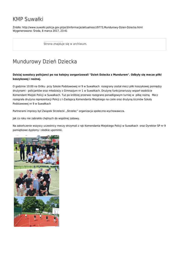 KMP Suwałki Źródło: http://www.suwalki.policja.gov.pl/po3/informacje/aktualnosci/9773,Mundurowy-Dzien-Dziecka.html Wygenerowano: Środa, 8 marca 2017, 23:41 Strona znajduje się w archiwum. Mundurowy Dzień Dziecka Dzisiaj suwalscy policjanci po raz kolejny zorganizowali "Dzień Dziecka z Mundurem". Odbyły się mecze piłki koszykowej i nożnej. O godzinie 10:00 na Orliku przy Szkole Podstawowej nr 9 w Suwałkach rozegrany został mecz piłki koszykowej pomiędzy drużynami - policjantów oraz młodzieży z Gimnazjum nr 1 w Suwałkach. Drużynę funkcjonariuszy wsparł osobiście Komendant Miejski Policji w Suwałkach. Tuż po krótkiej przerwie rozegrano ponadligowym turniej w piłkę nożną. Mecz rozegrała drużyna reprezentacji Policji z I-Zastępcą Komendanta Miejskiego na czele oraz drużyną Uczniów Szkoły Podstawowej nr 9 w Suwałkach Partnerami imprezy był Związek Strzelecki ,,Strzelec” organizacja społeczno-wychowawcza. Jak co roku nie zabrakło chętnych do wspólnej zabawy. Na zakończenie wszyscy uczestnicy meczy otrzymali z rąk Komendanta Miejskiego Policji w Suwałkach oraz Dyrektor SP nr 9 pamiątkowe dyplomy i słodkie upominki. Ocena: 0/5 (0) Tweetnij